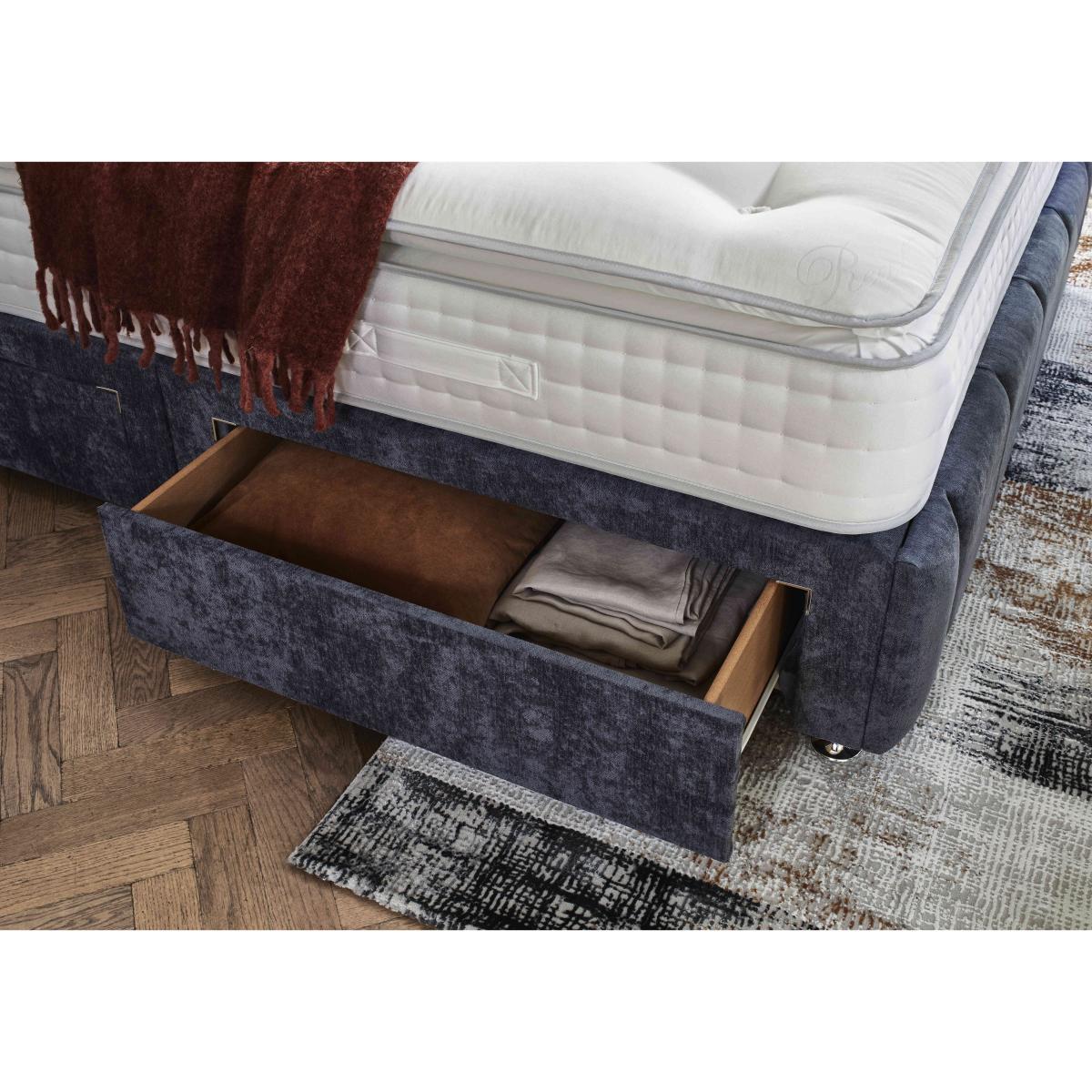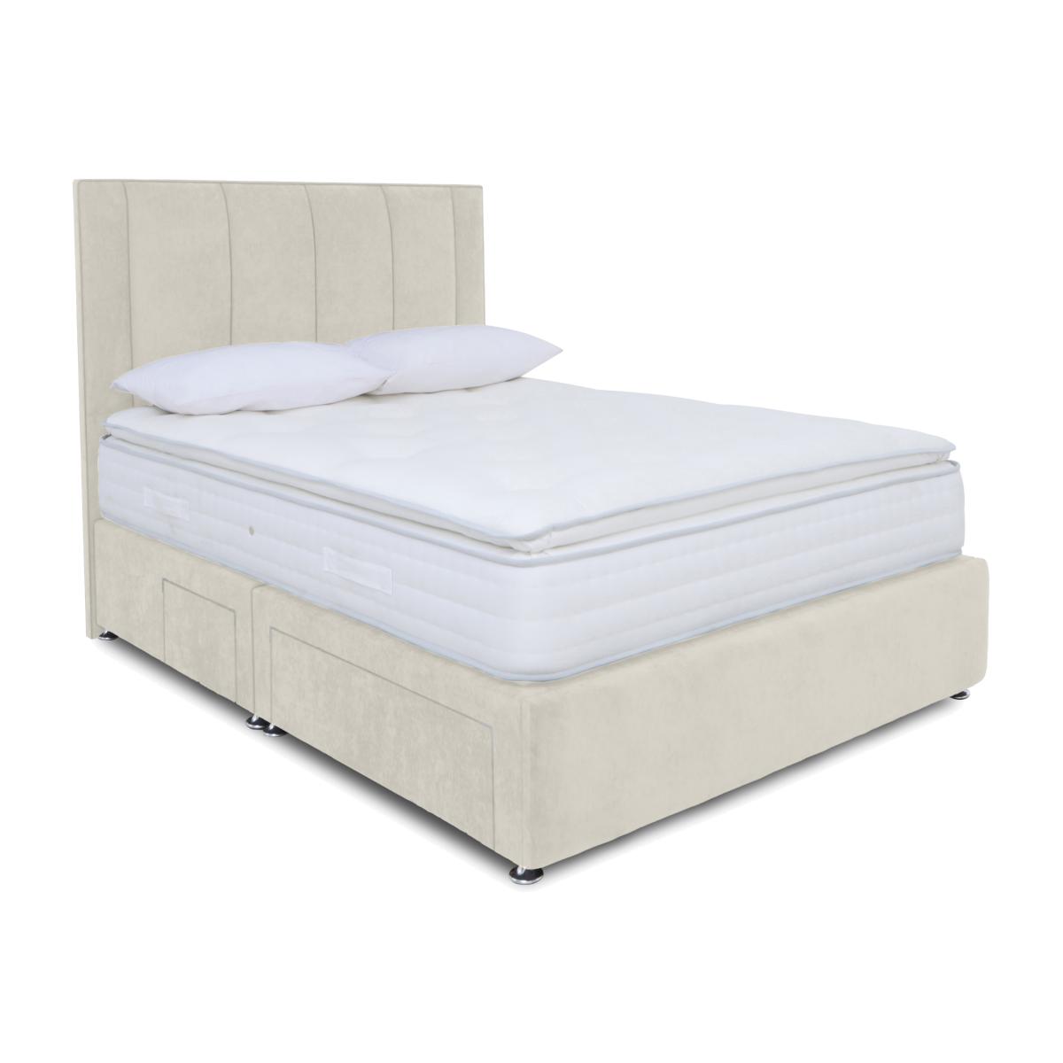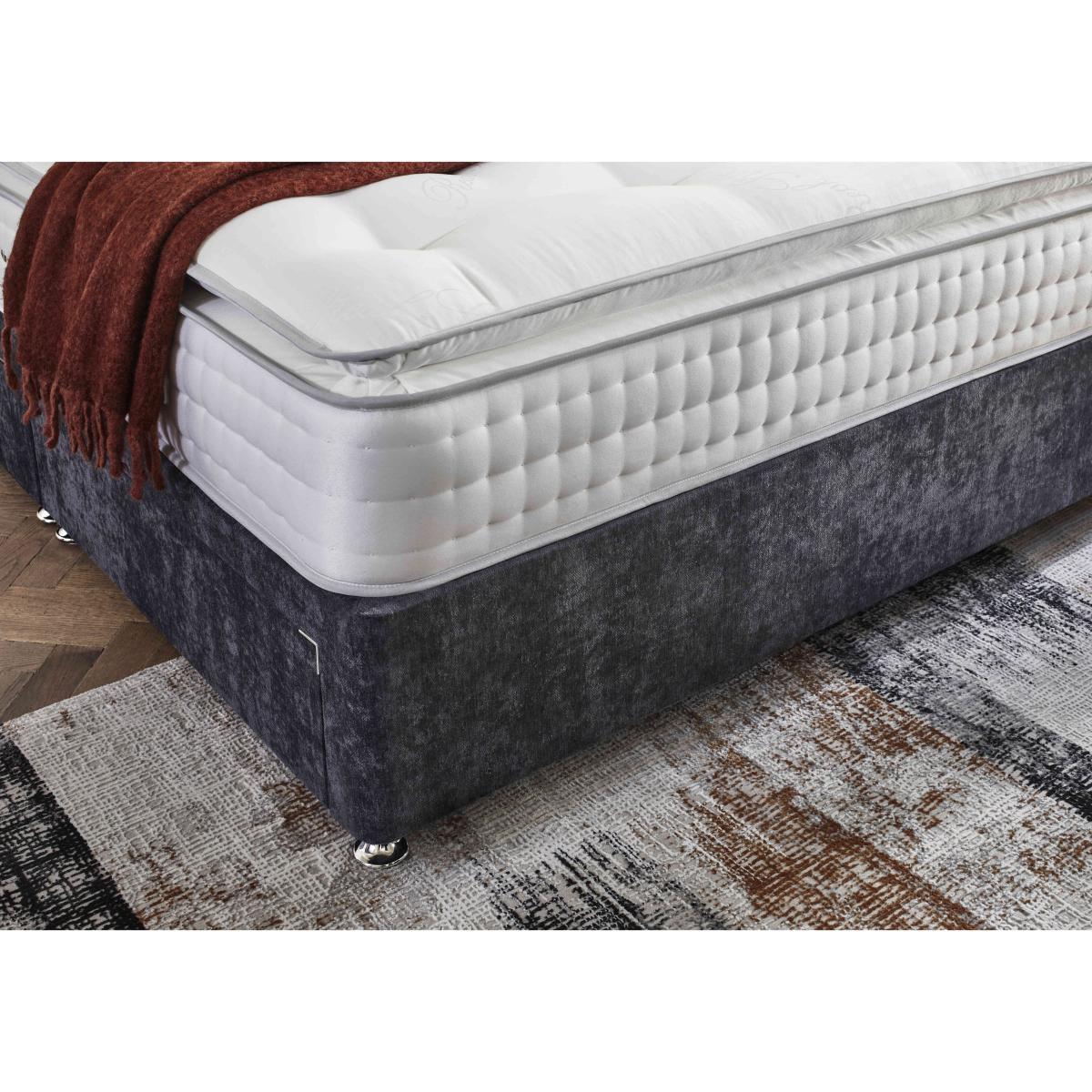 A soft damask cover, a comfort layer of wool, silk and cotton, and an advanced pocket spring system – the mattresses and divan sets in the Sleep Story Pocket Pillowtop range offer luxurious comfort at an exceptional price. Mattresses have 2000 individually pocketed springs in king size so you can count on wonderful medium-feel support. The range also includes a wide choice of beautifully upholstered divan sets with optional built-in storage – spacious drawers and roomy ottoman compartments. There’s even an electric-powered ottoman divan set. The Sleep Story Pocket Pillowtop range is handcrafted in Britain by Highgrove exclusively for Furniture Village. Enjoy soft and sumptuous pillow top comfort with this pocket spring mattress and upholstered divan base, only at Furniture Village. Choose from a range of optional storage drawer configurations. Why you'll love it The pocket spring pillowtop mattress in this divan set has a sumptuous all-natural comfort layer. Softness meets support at a great-value price. Luxuriously soft pillow top with wool, cotton and silk fillings for exceptional comfort. AdvantEdge® pocket spring system has 2000 springs in king size. It’s designed to offer total body support across the entire sleep surface. Ensures correct spinal alignment for better quality of sleep. Luxurious damask fabric cover. Hypoallergenic. Divan set includes a platform-top base with optional storage drawers. Available in a wide selection of stylish upholstery fabrics. Made in the UK by Highgrove and exclusive to Furniture Village. This divan set is part of the Sleep Story Pocket Pillowtop range. Shop the Sleep Story Pocket Pillowtop range for mattresses, divan sets, electric ottoman beds and more. What you need to know Mattress type: Pocket spring. Depth: 30 cm. Weight:Small single 23 kg, single 27.6 kg, small double 36.8 kg, double 41.4 kg, king 46 kg and super king 55.2 kg. Firmness: Medium. Springs: 2000 pocket springs in king size. Pillow top:Yes. Fillings: Wool, cotton and silk. Cover:Viscose damask fabric. Requires turning: No. Base type: Platform top with optional storage drawers. Sizes: Small single, single, small double, double, king and super king. Mattress care:Air for 4 hours before using to remove any odour. Indentations caused by settlement of fillings or body weight are normal and are not considered defects. If used on a slatted bed frame, the space between slats must be no wider than 7.5 cm. Spaces wider than this may cause excess dipping of the mattress and invalidate the guarantee. Always use a mattress protector. Rotate regularly. Divan base care: Clean upholstery weekly using a soft brush or vacuum with the curtain attachment. Professional cleaning advised for oil- and grease-based stains. Ordering a small double, double, king or super king size? Your divan base will be supplied in two halves for easier access.