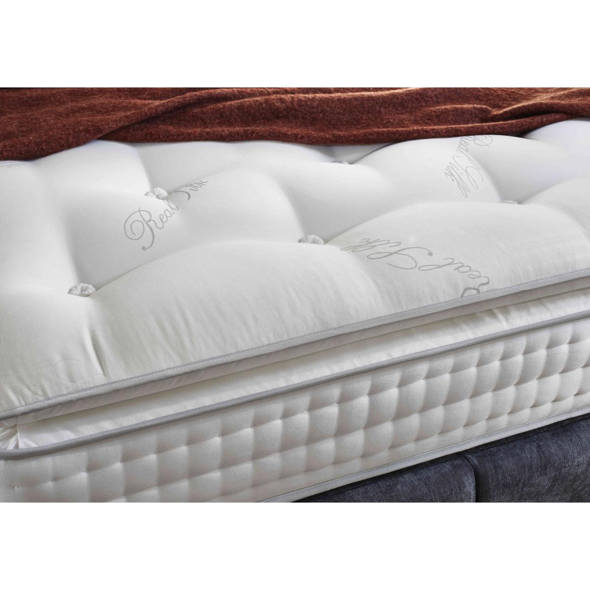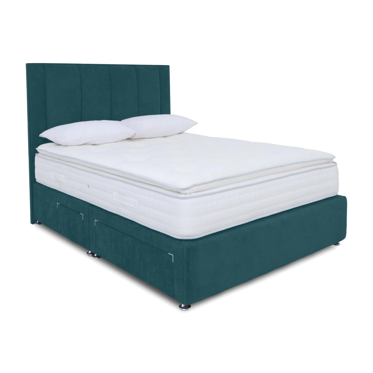 A soft damask cover, a comfort layer of wool, silk and cotton, and an advanced pocket spring system – the mattresses and divan sets in the Sleep Story Pocket Pillowtop range offer luxurious comfort at an exceptional price. Mattresses have 2000 individually pocketed springs in king size so you can count on wonderful medium-feel support. The range also includes a wide choice of beautifully upholstered divan sets with optional built-in storage – spacious drawers and roomy ottoman compartments. There’s even an electric-powered ottoman divan set. The Sleep Story Pocket Pillowtop range is handcrafted in Britain by Highgrove exclusively for Furniture Village. Enjoy soft and sumptuous pillow top comfort with this pocket spring mattress and upholstered divan base, only at Furniture Village. Choose from a range of optional storage drawer configurations. Why you'll love it The pocket spring pillowtop mattress in this divan set has a sumptuous all-natural comfort layer. Softness meets support at a great-value price. Luxuriously soft pillow top with wool, cotton and silk fillings for exceptional comfort. AdvantEdge® pocket spring system has 2000 springs in king size. It’s designed to offer total body support across the entire sleep surface. Ensures correct spinal alignment for better quality of sleep. Luxurious damask fabric cover. Hypoallergenic. Divan set includes a platform-top base with optional storage drawers. Available in a wide selection of stylish upholstery fabrics. Made in the UK by Highgrove and exclusive to Furniture Village. This divan set is part of the Sleep Story Pocket Pillowtop range. Shop the Sleep Story Pocket Pillowtop range for mattresses, divan sets, electric ottoman beds and more. What you need to know Mattress type: Pocket spring. Depth: 30 cm. Weight:Small single 23 kg, single 27.6 kg, small double 36.8 kg, double 41.4 kg, king 46 kg and super king 55.2 kg. Firmness: Medium. Springs: 2000 pocket springs in king size. Pillow top:Yes. Fillings: Wool, cotton and silk. Cover:Viscose damask fabric. Requires turning: No. Base type: Platform top with optional storage drawers. Sizes: Small single, single, small double, double, king and super king. Mattress care:Air for 4 hours before using to remove any odour. Indentations caused by settlement of fillings or body weight are normal and are not considered defects. If used on a slatted bed frame, the space between slats must be no wider than 7.5 cm. Spaces wider than this may cause excess dipping of the mattress and invalidate the guarantee. Always use a mattress protector. Rotate regularly. Divan base care: Clean upholstery weekly using a soft brush or vacuum with the curtain attachment. Professional cleaning advised for oil- and grease-based stains. Ordering a small double, double, king or super king size? Your divan base will be supplied in two halves for easier access.