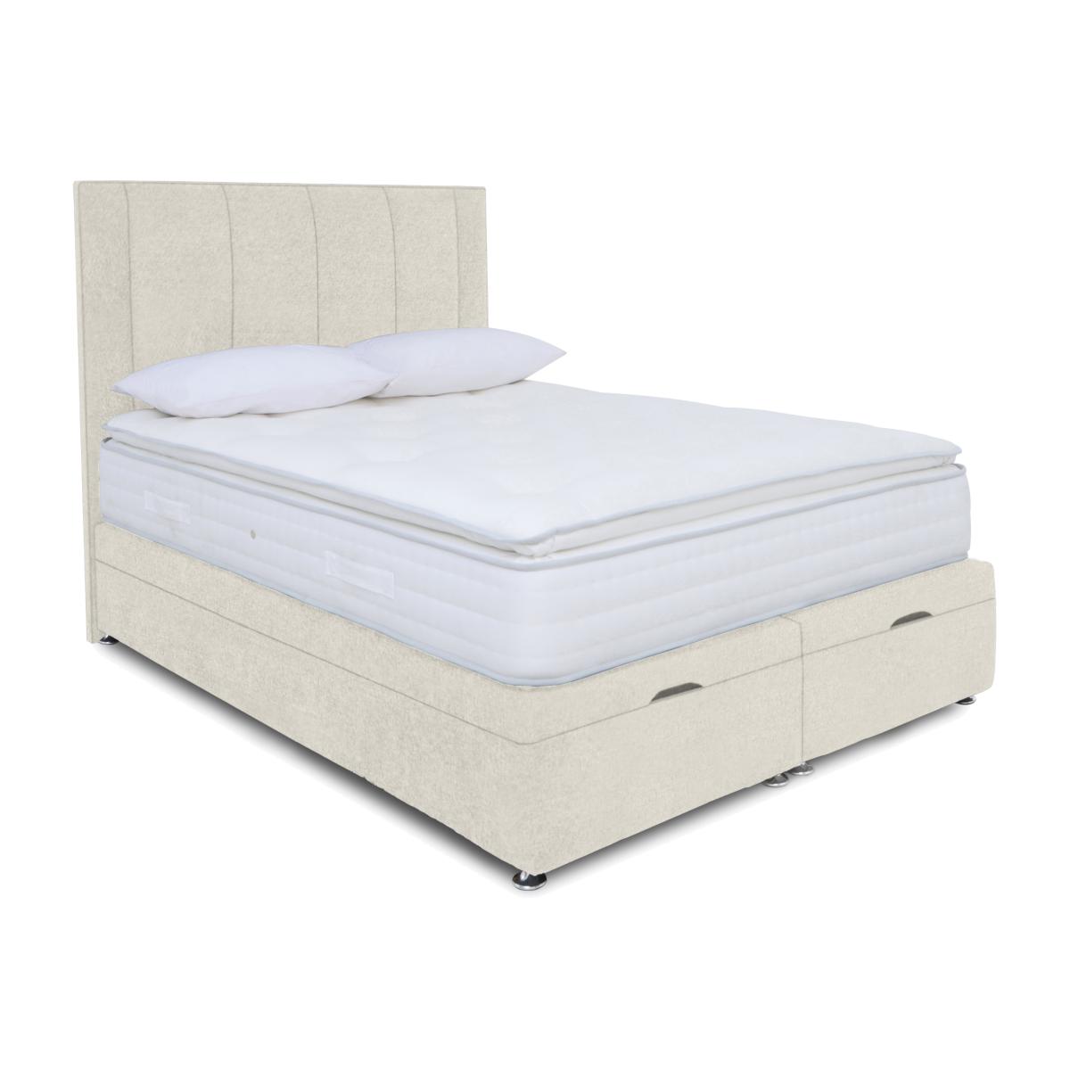 A soft damask cover, a comfort layer of wool, silk and cotton, and an advanced pocket spring system – the mattresses and divan sets in the Sleep Story Pocket Pillowtop range offer luxurious comfort at an exceptional price. Mattresses have 2000 individually pocketed springs in king size so you can count on wonderful medium-feel support. The range also includes a wide choice of beautifully upholstered divan sets with optional built-in storage – spacious drawers and roomy ottoman compartments. There’s even an electric-powered ottoman divan set. The Sleep Story Pocket Pillowtop range is handcrafted in Britain by Highgrove exclusively for Furniture Village. Spacious storage meets cushioning pillowtop matress comfort in this beautiful ottoman divan set, only at Furniture Village. Great price. Why you'll love it The pocket spring pillowtop mattress in this ottoman divan set has a sumptuous all-natural comfort layer. Softness meets support at a great-value price. Luxuriously soft pillow top with wool, cotton and silk fillings for exceptional comfort. AdvantEdge® pocket spring system has 2000 springs in king size. It’s designed to offer total body support across the entire sleep surface. Ensures correct spinal alignment for better quality of sleep. Luxurious damask fabric cover. Hypoallergenic. Divan set includes a platform-top base with end-opening ottoman storage. Available in a wide selection of stylish upholstery fabrics. Made in the UK by Highgrove and exclusive to Furniture Village. This ottoman divan set is part of the Sleep Story Pocket Pillowtop range. Shop the Sleep Story Pocket Pillowtop range for mattresses, divan sets, electric ottoman beds and more. What you need to know Mattress type: Pocket spring. Depth: 30 cm. Weight:Small single 23 kg, single 27.6 kg, small double 36.8 kg, double 41.4 kg, king 46 kg and super king 55.2 kg. Firmness: Medium. Springs: 2000 pocket springs in king size. Pillow top:Yes. Fillings: Wool, cotton and silk. Cover:Viscose damask fabric. Requires turning: No. Base type: Platform top with end-opening ottoman storage. Sizes: Small single, single, small double, double, king and super king. Mattress care:Air for 4 hours before using to remove any odour. Indentations caused by settlement of fillings or body weight are normal and are not considered defects. If used on a slatted bed frame, the space between slats must be no wider than 7.5 cm. Spaces wider than this may cause excess dipping of the mattress and invalidate the guarantee. Always use a mattress protector. Rotate regularly. Divan base care: Clean upholstery weekly using a soft brush or vacuum with the curtain attachment. Professional cleaning advised for oil- and grease-based stains. Be careful care when opening and closing the ottoman base. Ordering a small double, double, king or super king size? Your divan base will be supplied in two halves for easier access.