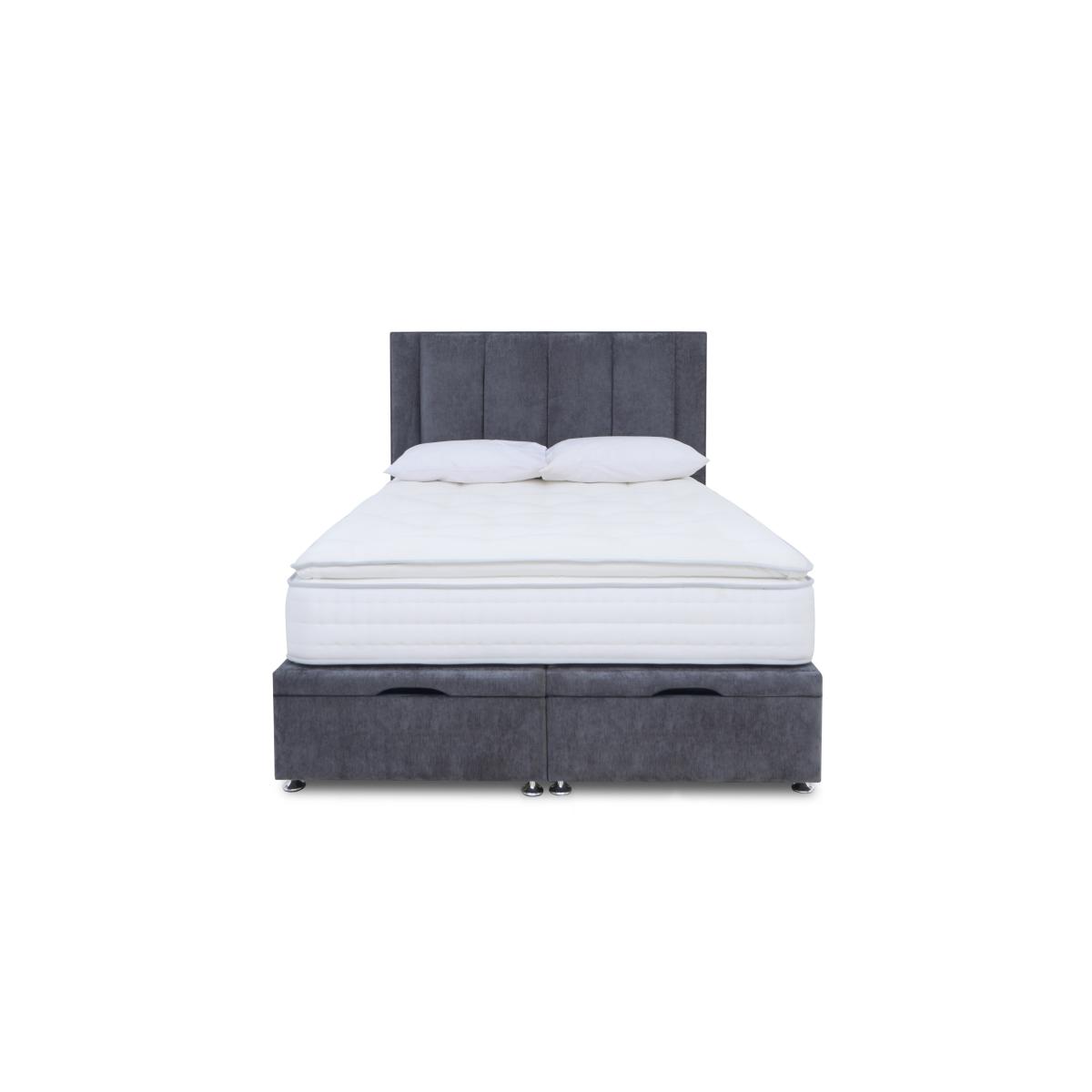 A soft damask cover, a comfort layer of wool, silk and cotton, and an advanced pocket spring system – the mattresses and divan sets in the Sleep Story Pocket Pillowtop range offer luxurious comfort at an exceptional price. Mattresses have 2000 individually pocketed springs in king size so you can count on wonderful medium-feel support. The range also includes a wide choice of beautifully upholstered divan sets with optional built-in storage – spacious drawers and roomy ottoman compartments. There’s even an electric-powered ottoman divan set. The Sleep Story Pocket Pillowtop range is handcrafted in Britain by Highgrove exclusively for Furniture Village. Spacious storage meets cushioning pillowtop matress comfort in this beautiful ottoman divan set, only at Furniture Village. Great price. Why you'll love it The pocket spring pillowtop mattress in this ottoman divan set has a sumptuous all-natural comfort layer. Softness meets support at a great-value price. Luxuriously soft pillow top with wool, cotton and silk fillings for exceptional comfort. AdvantEdge® pocket spring system has 2000 springs in king size. It’s designed to offer total body support across the entire sleep surface. Ensures correct spinal alignment for better quality of sleep. Luxurious damask fabric cover. Hypoallergenic. Divan set includes a platform-top base with end-opening ottoman storage. Available in a wide selection of stylish upholstery fabrics. Made in the UK by Highgrove and exclusive to Furniture Village. This ottoman divan set is part of the Sleep Story Pocket Pillowtop range. Shop the Sleep Story Pocket Pillowtop range for mattresses, divan sets, electric ottoman beds and more. What you need to know Mattress type: Pocket spring. Depth: 30 cm. Weight:Small single 23 kg, single 27.6 kg, small double 36.8 kg, double 41.4 kg, king 46 kg and super king 55.2 kg. Firmness: Medium. Springs: 2000 pocket springs in king size. Pillow top:Yes. Fillings: Wool, cotton and silk. Cover:Viscose damask fabric. Requires turning: No. Base type: Platform top with end-opening ottoman storage. Sizes: Small single, single, small double, double, king and super king. Mattress care:Air for 4 hours before using to remove any odour. Indentations caused by settlement of fillings or body weight are normal and are not considered defects. If used on a slatted bed frame, the space between slats must be no wider than 7.5 cm. Spaces wider than this may cause excess dipping of the mattress and invalidate the guarantee. Always use a mattress protector. Rotate regularly. Divan base care: Clean upholstery weekly using a soft brush or vacuum with the curtain attachment. Professional cleaning advised for oil- and grease-based stains. Be careful care when opening and closing the ottoman base. Ordering a small double, double, king or super king size? Your divan base will be supplied in two halves for easier access.