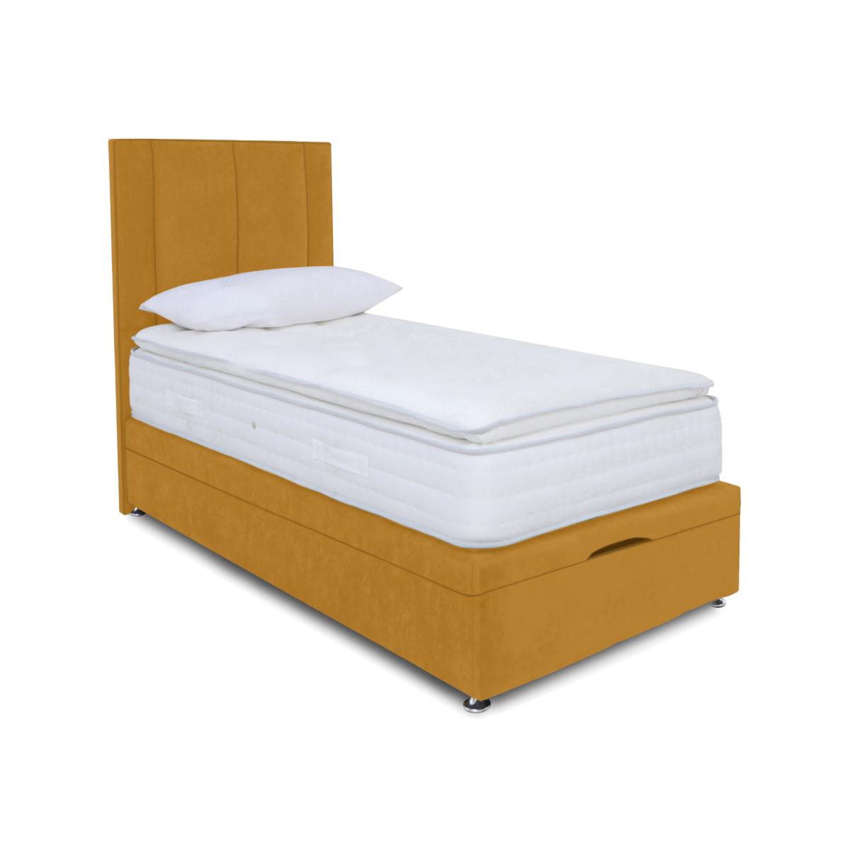 A soft damask cover, a comfort layer of wool, silk and cotton, and an advanced pocket spring system – the mattresses and divan sets in the Sleep Story Pocket Pillowtop range offer luxurious comfort at an exceptional price. Mattresses have 2000 individually pocketed springs in king size so you can count on wonderful medium-feel support. The range also includes a wide choice of beautifully upholstered divan sets with optional built-in storage – spacious drawers and roomy ottoman compartments. There’s even an electric-powered ottoman divan set. The Sleep Story Pocket Pillowtop range is handcrafted in Britain by Highgrove exclusively for Furniture Village. Spacious storage meets cushioning pillowtop matress comfort in this beautiful ottoman divan set, only at Furniture Village. Great price. Why you'll love it The pocket spring pillowtop mattress in this ottoman divan set has a sumptuous all-natural comfort layer. Softness meets support at a great-value price. Luxuriously soft pillow top with wool, cotton and silk fillings for exceptional comfort. AdvantEdge® pocket spring system has 2000 springs in king size. It’s designed to offer total body support across the entire sleep surface. Ensures correct spinal alignment for better quality of sleep. Luxurious damask fabric cover. Hypoallergenic. Divan set includes a platform-top base with end-opening ottoman storage. Available in a wide selection of stylish upholstery fabrics. Made in the UK by Highgrove and exclusive to Furniture Village. This ottoman divan set is part of the Sleep Story Pocket Pillowtop range. Shop the Sleep Story Pocket Pillowtop range for mattresses, divan sets, electric ottoman beds and more. What you need to know Mattress type: Pocket spring. Depth: 30 cm. Weight:Small single 23 kg, single 27.6 kg, small double 36.8 kg, double 41.4 kg, king 46 kg and super king 55.2 kg. Firmness: Medium. Springs: 2000 pocket springs in king size. Pillow top:Yes. Fillings: Wool, cotton and silk. Cover:Viscose damask fabric. Requires turning: No. Base type: Platform top with end-opening ottoman storage. Sizes: Small single, single, small double, double, king and super king. Mattress care:Air for 4 hours before using to remove any odour. Indentations caused by settlement of fillings or body weight are normal and are not considered defects. If used on a slatted bed frame, the space between slats must be no wider than 7.5 cm. Spaces wider than this may cause excess dipping of the mattress and invalidate the guarantee. Always use a mattress protector. Rotate regularly. Divan base care: Clean upholstery weekly using a soft brush or vacuum with the curtain attachment. Professional cleaning advised for oil- and grease-based stains. Be careful care when opening and closing the ottoman base. Ordering a small double, double, king or super king size? Your divan base will be supplied in two halves for easier access.