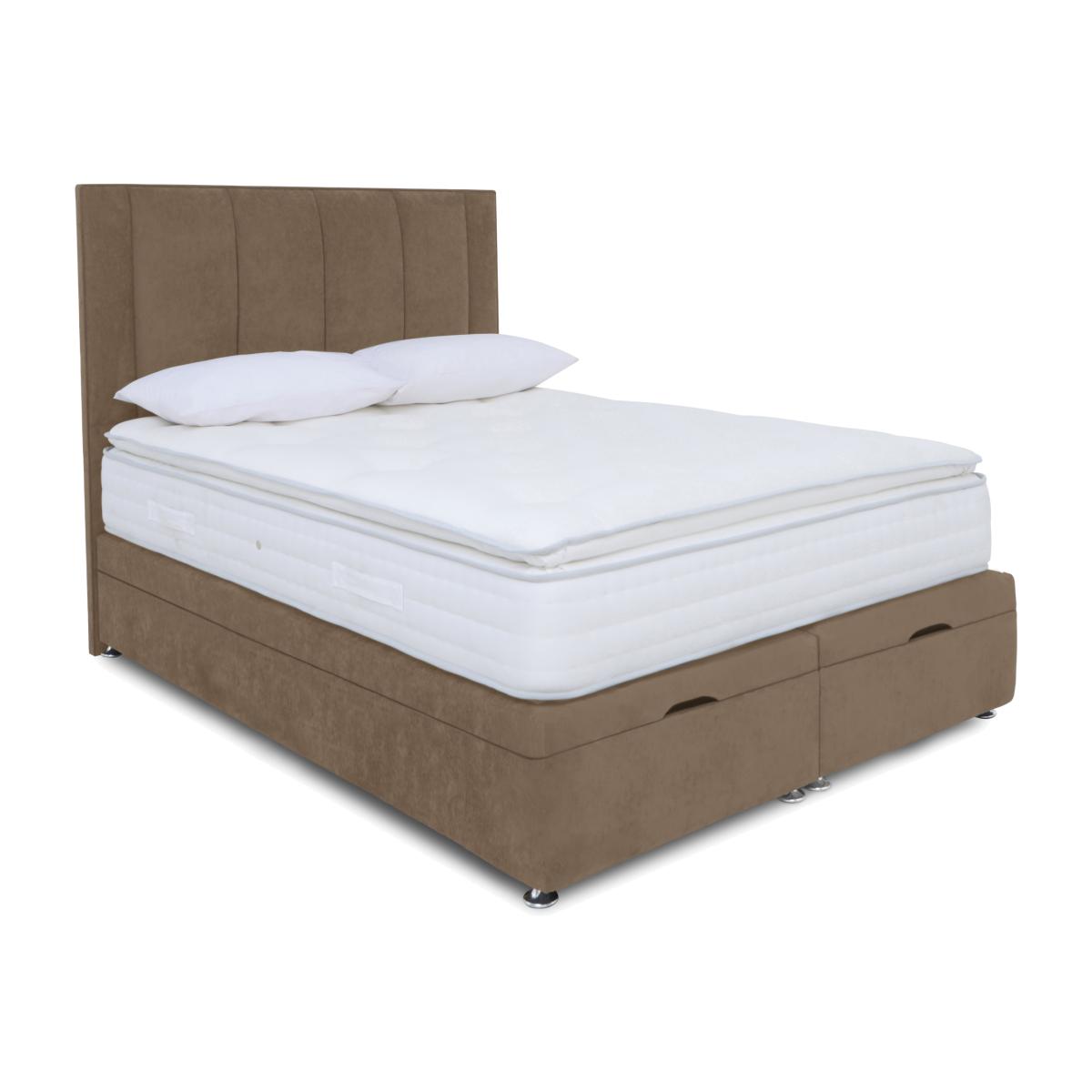 A soft damask cover, a comfort layer of wool, silk and cotton, and an advanced pocket spring system – the mattresses and divan sets in the Sleep Story Pocket Pillowtop range offer luxurious comfort at an exceptional price. Mattresses have 2000 individually pocketed springs in king size so you can count on wonderful medium-feel support. The range also includes a wide choice of beautifully upholstered divan sets with optional built-in storage – spacious drawers and roomy ottoman compartments. There’s even an electric-powered ottoman divan set. The Sleep Story Pocket Pillowtop range is handcrafted in Britain by Highgrove exclusively for Furniture Village. Spacious storage meets cushioning pillowtop matress comfort in this beautiful ottoman divan set, only at Furniture Village. Great price. Why you'll love it The pocket spring pillowtop mattress in this ottoman divan set has a sumptuous all-natural comfort layer. Softness meets support at a great-value price. Luxuriously soft pillow top with wool, cotton and silk fillings for exceptional comfort. AdvantEdge® pocket spring system has 2000 springs in king size. It’s designed to offer total body support across the entire sleep surface. Ensures correct spinal alignment for better quality of sleep. Luxurious damask fabric cover. Hypoallergenic. Divan set includes a platform-top base with end-opening ottoman storage. Available in a wide selection of stylish upholstery fabrics. Made in the UK by Highgrove and exclusive to Furniture Village. This ottoman divan set is part of the Sleep Story Pocket Pillowtop range. Shop the Sleep Story Pocket Pillowtop range for mattresses, divan sets, electric ottoman beds and more. What you need to know Mattress type: Pocket spring. Depth: 30 cm. Weight:Small single 23 kg, single 27.6 kg, small double 36.8 kg, double 41.4 kg, king 46 kg and super king 55.2 kg. Firmness: Medium. Springs: 2000 pocket springs in king size. Pillow top:Yes. Fillings: Wool, cotton and silk. Cover:Viscose damask fabric. Requires turning: No. Base type: Platform top with end-opening ottoman storage. Sizes: Small single, single, small double, double, king and super king. Mattress care:Air for 4 hours before using to remove any odour. Indentations caused by settlement of fillings or body weight are normal and are not considered defects. If used on a slatted bed frame, the space between slats must be no wider than 7.5 cm. Spaces wider than this may cause excess dipping of the mattress and invalidate the guarantee. Always use a mattress protector. Rotate regularly. Divan base care: Clean upholstery weekly using a soft brush or vacuum with the curtain attachment. Professional cleaning advised for oil- and grease-based stains. Be careful care when opening and closing the ottoman base. Ordering a small double, double, king or super king size? Your divan base will be supplied in two halves for easier access.