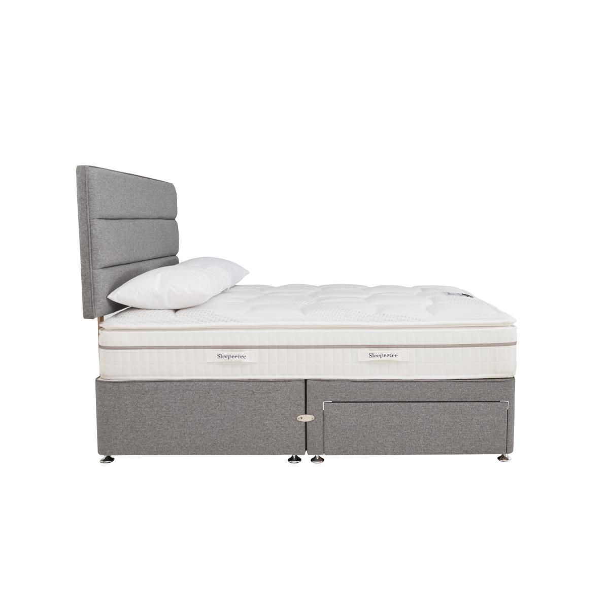 Its the perfect combination of style, comfort and great value and from one of the best- known names in British bed manufacturing that makes the handcrafted Sleepeezee Calm 2200 divan set hard to beat. The superior mattress has a sumptuous body- cushioning pillow top and 2200 individually- nested pocket springs in king size for more responsive support. Soft hypoallergenic white fibre and memory foam fillings ensure that allergy suffers sleep well too. Medium in feel, this mattress is 30 cm deep. The accompanying platform- top divan base is upholstered in your choice of fabric. Choose from a range of optional drawer storage configurations. Made in Britain by Sleepeezee, the Sleepeezee Calm 2200 divan set is part of the Sleepeezee Calm 2200 collection, only at Furniture Village. Sleepeezee has been making fantastic beds since 1924 and holds a Royal Warrant of Appointment granted by HRH The Prince of Wales. Product images are representative. Find out more Please note: The mattress should be aired for four hours after delivery to freshen and remove any aroma from storage. It may take time for your mattress to attain its full size once the springs have settled to the correct position. This is due to the mattress being upright during transit. Settlement of fillings and indentations caused by body weight compressing the fillings are natural and not considered defects. This can be minimised by regular rotating (unless yours is a dual tension mattress).