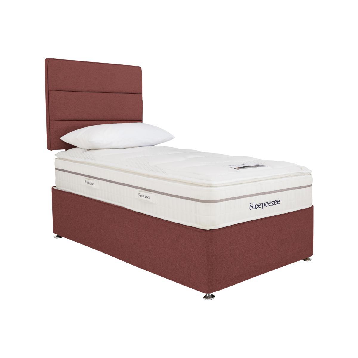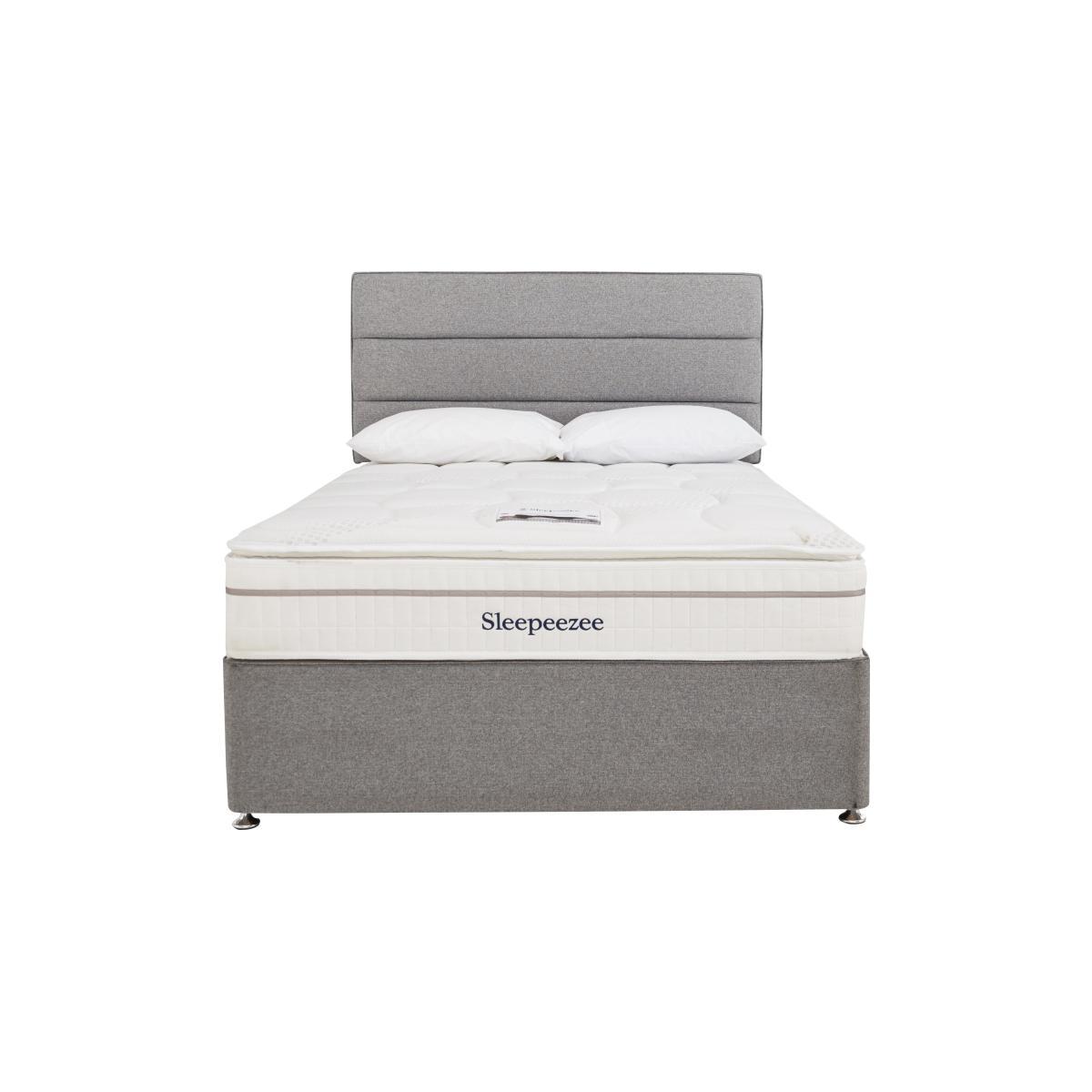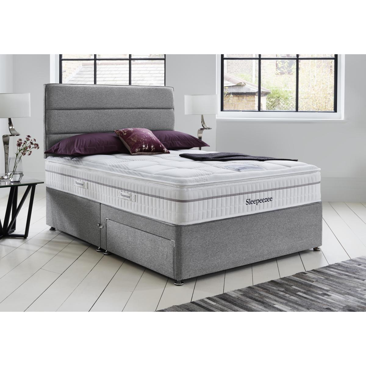 Look forward to more restful sleep with the handcrafted Sleepeezee Calm 2200 collection. The medium-feel 30 cm mattress with luxurious pillow top, 2200 individually-pocketed springs in king size and hypoallergenic white fibre and memory foam fillings provides the perfect combination of softness and support. Beautifully upholstered platform-top divan bases are available in a wide choice of fabrics and offer optional drawer storage in a range of useful configurations. Yours at a great value price, the Sleepeezee Calm 2200 collection is made in Britain by Sleepeezee, holders of a Royal Warrant from HRH The Prince of Wales. A Furniture Village exclusive. Headboard is an optional extra. It’s the perfect combination of style, comfort and great value – and from one of the best-known names in British bed manufacturing – that makes the handcrafted Sleepeezee Calm 2200 divan set hard to beat. The superior mattress has a sumptuous body-cushioning pillow top and 2200 individually-nested pocket springs in king size for more responsive support. Soft hypoallergenic white fibre and memory foam fillings ensure that allergy suffers sleep well too. Medium in feel, this mattress is 30 cm deep. The accompanying platform-top divan base is upholstered in your choice of fabric. Choose from a range of optional drawer storage configurations. Made in Britain by Sleepeezee, the Sleepeezee Calm 2200 divan set is part of the Sleepeezee Calm 2200 collection, only at Furniture Village. Sleepeezee has been making fantastic beds since 1924 and holds a Royal Warrant of Appointment granted by HRH The Prince of Wales. Product images are representative. Find out more. Please note. The mattress should be aired for four hours after delivery to freshen and remove any aroma from storage. It may take time for your mattress to attain its full size once the springs have settled to the correct position. This is due to the mattress being upright during transit. Settlement of fillings and indentations caused by body weight compressing the fillings are natural and not considered defects. This can be minimised by regular rotating (unless yours is a dual tension mattress).