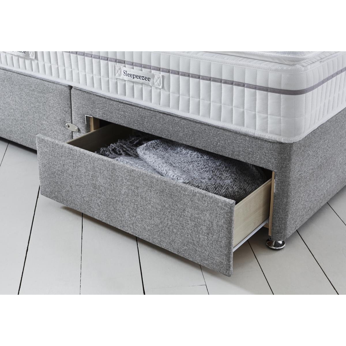 Look forward to more restful sleep with the handcrafted Sleepeezee Calm 2200 collection. The medium-feel 30 cm mattress with luxurious pillow top, 2200 individually-pocketed springs in king size and hypoallergenic white fibre and memory foam fillings provides the perfect combination of softness and support. Beautifully upholstered platform-top divan bases are available in a wide choice of fabrics and offer optional drawer storage in a range of useful configurations. Yours at a great value price, the Sleepeezee Calm 2200 collection is made in Britain by Sleepeezee, holders of a Royal Warrant from HRH The Prince of Wales. A Furniture Village exclusive. Headboard is an optional extraIt’s the perfect combination of style, comfort and great value – and from one of the best-known names in British bed manufacturing – that makes the handcrafted Sleepeezee Calm 2200 divan set hard to beat. The superior mattress has a sumptuous body-cushioning pillow top and 2200 individually-nested pocket springs in king size for more responsive support. Soft hypoallergenic white fibre and memory foam fillings ensure that allergy suffers sleep well too. Medium in feel, this mattress is 30 cm deep. The accompanying platform-top divan base is upholstered in your choice of fabric. Choose from a range of optional drawer storage configurations. Made in Britain by Sleepeezee, the Sleepeezee Calm 2200 divan set is part of the Sleepeezee Calm 2200 collection, only at Furniture Village. Sleepeezee has been making fantastic beds since 1924 and holds a Royal Warrant of Appointment granted by HRH The Prince of Wales. Product images are representative. Find out morePlease note: The mattress should be aired for four hours after delivery to freshen and remove any aroma from storage. It may take time for your mattress to attain its full size once the springs have settled to the correct position. This is due to the mattress being upright during transit. Settlement of fillings and indentations caused by body weight compressing the fillings are natural and not considered defects. This can be minimised by regular rotating (unless yours is a dual tension mattress).
