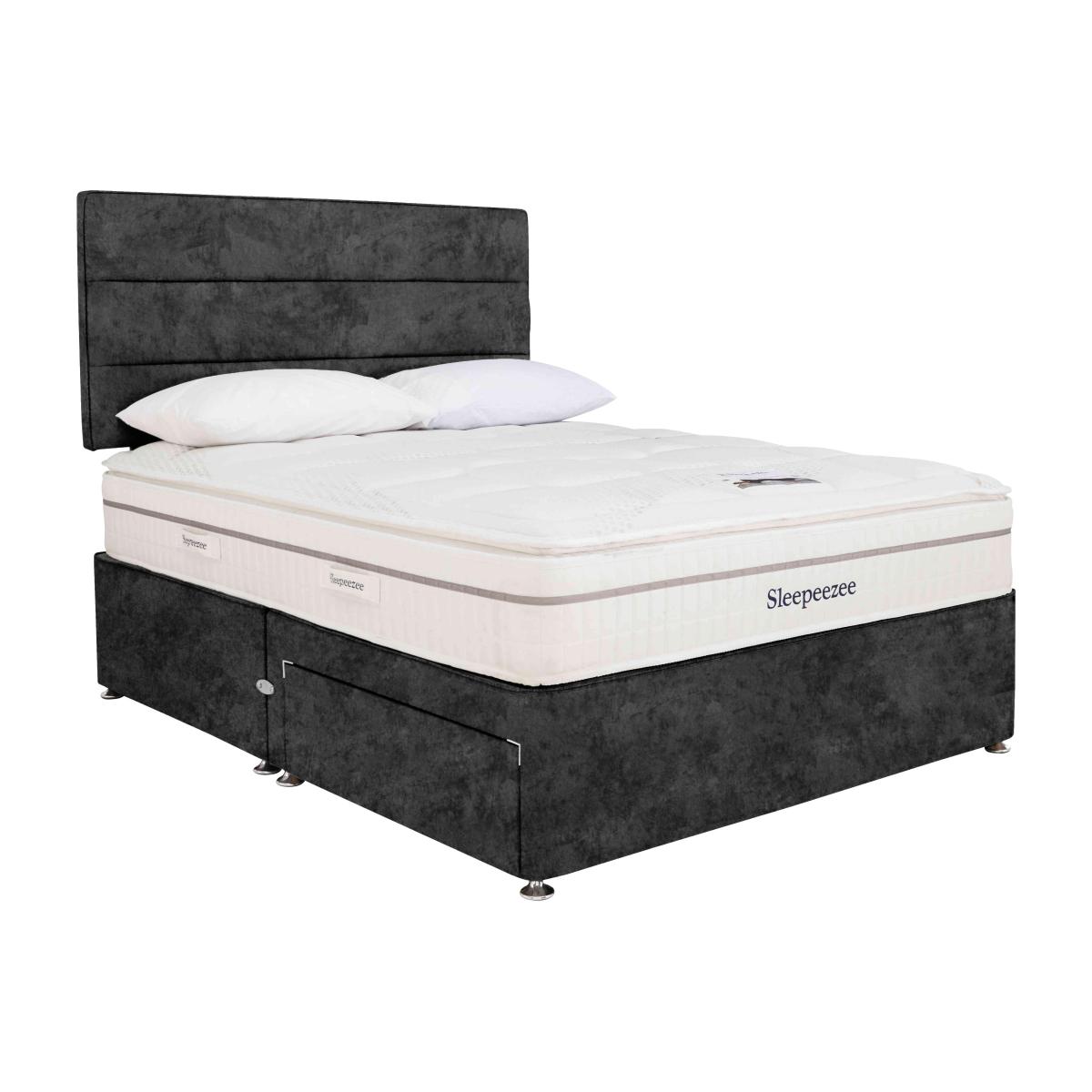 Look forward to more restful sleep with the handcrafted Sleepeezee Calm 2200 collection. The medium-feel 30 cm mattress with luxurious pillow top, 2200 individually-pocketed springs in king size and hypoallergenic white fibre and memory foam fillings provides the perfect combination of softness and support. Beautifully upholstered platform-top divan bases are available in a wide choice of fabrics and offer optional drawer storage in a range of useful configurations. Yours at a great value price, the Sleepeezee Calm 2200 collection is made in Britain by Sleepeezee, holders of a Royal Warrant from HRH The Prince of Wales. A Furniture Village exclusive. Headboard is an optional extraIt’s the perfect combination of style, comfort and great value – and from one of the best-known names in British bed manufacturing – that makes the handcrafted Sleepeezee Calm 2200 divan set hard to beat. The superior mattress has a sumptuous body-cushioning pillow top and 2200 individually-nested pocket springs in king size for more responsive support. Soft hypoallergenic white fibre and memory foam fillings ensure that allergy suffers sleep well too. Medium in feel, this mattress is 30 cm deep. The accompanying platform-top divan base is upholstered in your choice of fabric. Choose from a range of optional drawer storage configurations. Made in Britain by Sleepeezee, the Sleepeezee Calm 2200 divan set is part of the Sleepeezee Calm 2200 collection, only at Furniture Village. Sleepeezee has been making fantastic beds since 1924 and holds a Royal Warrant of Appointment granted by HRH The Prince of Wales. Product images are representative. Find out morePlease note: The mattress should be aired for four hours after delivery to freshen and remove any aroma from storage. It may take time for your mattress to attain its full size once the springs have settled to the correct position. This is due to the mattress being upright during transit. Settlement of fillings and indentations caused by body weight compressing the fillings are natural and not considered defects. This can be minimised by regular rotating (unless yours is a dual tension mattress).