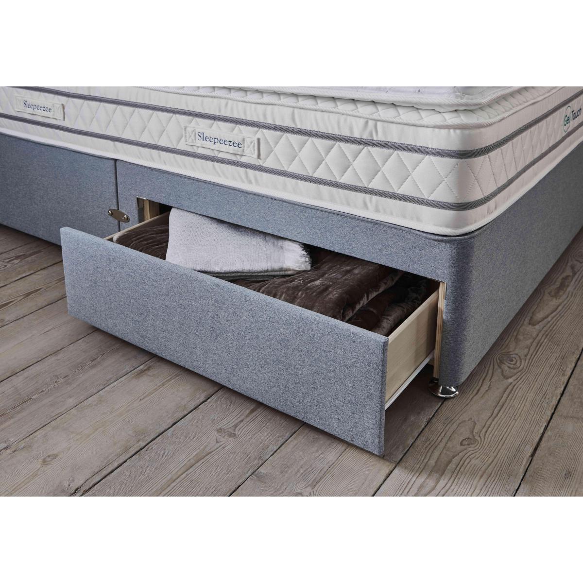 Beautiful Sleepeezee divan base in a wide choice of fabrics. Available with useful built-in storage drawers. Handcrafted in Britain and exclusive to Furniture Village. Need the perfect base for your new mattress? Take a look at the Sleepeezee divan base. Handcrafted in Britain by Sleepeezee, one of the nation’s most respected bed and mattress makers, this sturdy traditional-style platform-top divan base provides the perfect support to any type of mattress. It’s also an extremely practical choice as it comes with optional storage drawers in a variety of configurations – so handy if yours is a compact bedroom with limited storage furniture. It also scores very highly on the style front. Neatly upholstered, this divan bed base is available in a huge choice of fabric styles including tweed, plush and woven, and in a fabulous range of colours, from subtle and sophisticated hues to bolder contemporary tones. The stylish and practical Sleepeezee divan bed base with optional drawers is exclusively available at Furniture Village. If you need even more storage, be sure to look at the Sleepeezee divan bed base with side-lift ottoman storage. Please note. Headboard and mattress shown may be purchased separately.