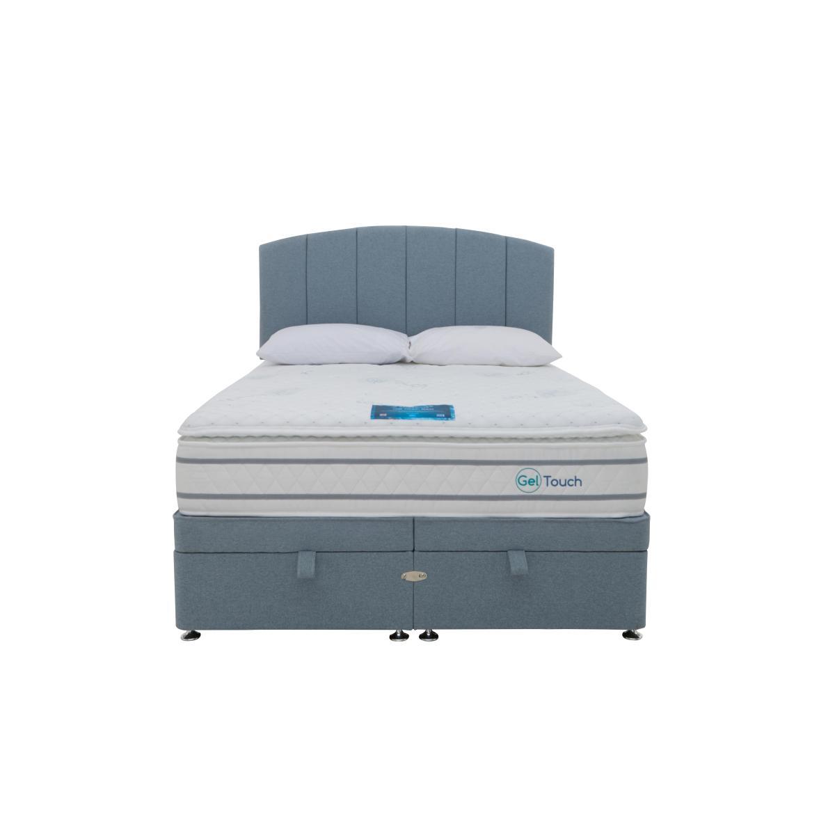 Enjoy a cooler and more comfortable night’s sleep with the Sleepeezee Gel Touch 3000 collection. Featuring Sleepeezee’s advanced technology, the mattress in this collection has a deep double layer of revolutionary StayCool™ gel foam to relieve pressure and dissipate heat, and is finished with a unique cool-touch mattress cover. You’ll also enjoy exceptional firmer-feel support from two tiers of traditional and mini pocket springs. The collection also includes a beautiful upholstered divan set with optional drawer or side lift ottoman storage. The Sleepeezee Gel Touch 3000 collection is handcrafted in Britain and exclusively available at Furniture Village. Sleepeezee holds a Royal Warrant from HRH The Prince of Wales. Sleep cooler, sleep better. This fabulous Sleepeezee divan set has a mattress with a double-depth layer of pressure-sensitive StayCool™ gel foam and a cool-touch cover. And let’s not forget the very handy end-lift ottoman base. Why you’ll love it. Cooling mattress comfort plus end-lift ottoman storage. Over 3000 responsive pocket springs in king size. Double layer of Sleepeezee’s body-conforming StayCool™ gel foam. Wide choice of fabrics for the upholstered divan base. The range also includes a standalone mattress and a choice of storage divan sets. Sleepeezee holds a Royal Warrant of Appointment granted by HRH The Prince of Wales. Handcrafted in Britain and exclusive to Furniture Village. What you need to know. Mattress type: Pocket spring. Depth: 35.5 cm. Firmness: Firm. Springs: 1200 traditional pocket springs and 2000 mini springs in two tiers in king size. Pillow top: Yes. Fillings: 40 mm layer of Sleepeezee’s StayCool gel foam. Edge support: Yes. Cover: Made of a knitted cool-touch fabric. Requires turning: No. Base type: Platform top with end-lift ottoman storage. Sizes: Single, double, king and super king. Mattress care: Air for 4 hours before using to remove any odour. Allow at least 4 hours for springs to settle and for mattress to attain its full size. Indentations caused by settlement of fillings or body weight are normal and are not considered defects. If used on a slatted bed frame, slats must be no more than 7 cm apart. Rotate regularly.