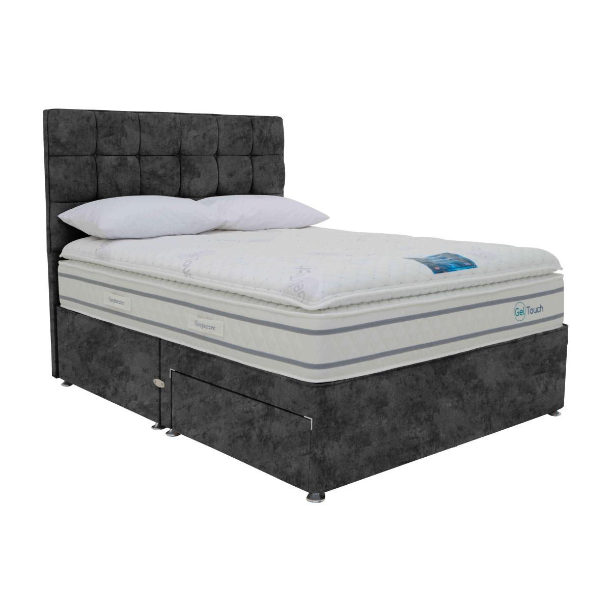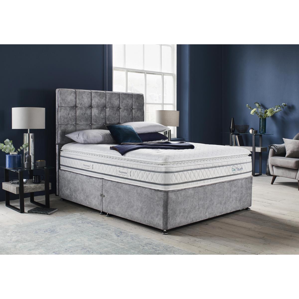 If heat keeps you awake at night, look forward to cooler and more restful sleep with the luxurious Sleepeezee Gel Touch 4000 range. The mattress in this collection has a unique cool-touch mattress cover and features a double depth layer of Sleepeezee’s revolutionary StayCool™ gel foam which is pressure sensitive – so it adapts to the shape and weight of your body – and helps regulate your body temperature to keep you comfortably cool. Two tiers of traditional and mini pocket springs are individually responsive and provide firmer-feel support. Pair your mattress with a beautifully upholstered divan base from the collection and add optional drawer or side lift ottoman storage. The Sleepeezee Gel Touch 4000 collection is handcrafted in Britain and only available at Furniture Village. Sleepeezee holds a Royal Warrant to HRH The Prince of Wales.. Sumptuous mattress with StayCool™ gel and 4300 pocket springs in king size. Divan base with optional drawer storage in a wide choice of fabrics. Handcrafted in Britain and exclusive to Furniture VillageLook forward to a wonderfully comfortable night’s sleep – and an instantly more stylish bedroom – with the Sleepeezee Gel Touch 4000 divan set. The 33 cm mattress in this divan set is a one of a kind. Hypoallergenic, it has a double-depth layer of Sleepeezee StayCool™ gel. This innovative pressure-sensitive gel foam is designed for cooling comfort – it conforms to the shape of your body and helps regulate body temperature. Extra coolness comes from the knitted cool-touch cover, and extra comfort from the built in pillow top. The 4300 individually-pocketed springs in king size – 800 traditional pocket springs and 3500 responsive mini springs – provide medium to firm support. Fully encapsulated, the spring system promises superior edge support. Select from a wide choice of fabric styles and colours for the upholstered platform top divan base, and increase you bedroom storage by choosing optional drawers. Handcrafted in Britain and only available at Furniture Village, the Sleepeezee Gel Touch 4000 divan set is part of the Sleepeezee Gel Touch 4000 range. Product images are representative. Find out moreDid you know? : This mattress should be aired for four hours after delivery to freshen and remove any aroma from storage. It may take time for your mattress to attain its full size once the springs have settled to the correct position. This is due to the mattress being upright during transit. Settlement of fillings and indentations caused by body weight compressing the fillings are natural and not considered defects. This can be minimised by regular rotating. This is a non-turn mattress. We recommend the use of a mattress protector..