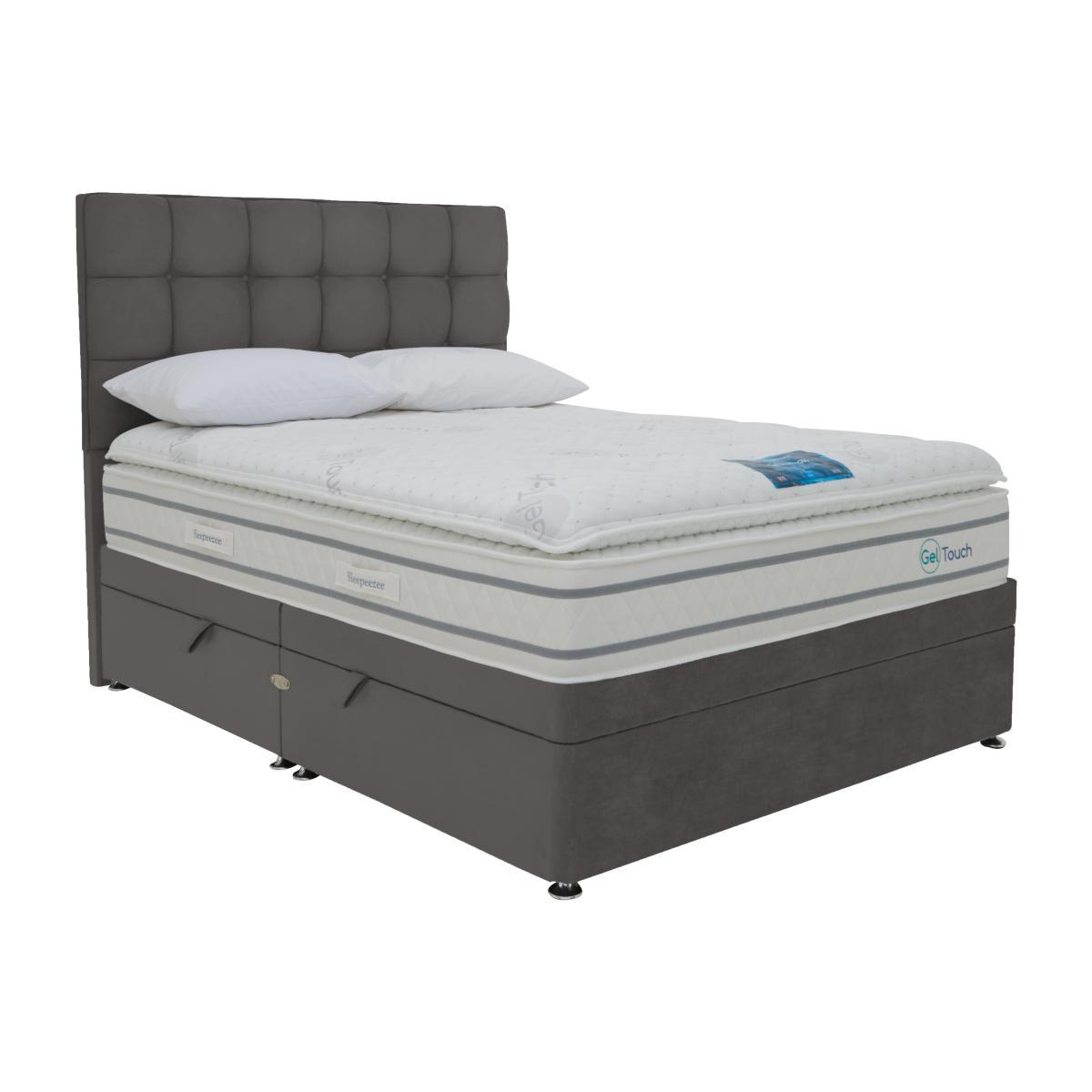 If heat keeps you awake at night, look forward to cooler and more restful sleep with the luxurious Sleepeezee Gel Touch 4000 range. The mattress in this collection has a unique cool-touch mattress cover and features a double depth layer of Sleepeezee’s revolutionary StayCool™ gel foam which is pressure sensitive – so it adapts to the shape and weight of your body – and helps regulate your body temperature to keep you comfortably cool. Two tiers of traditional and mini pocket springs are individually responsive and provide firmer-feel support. Pair your mattress with a beautifully upholstered divan base from the collection and add optional drawer or side lift ottoman storage. The Sleepeezee Gel Touch 4000 collection is handcrafted in Britain and only available at Furniture Village. Sleepeezee holds a Royal Warrant to HRH The Prince of Wales. Internal dimensions. Single: Height 25cm, Length 182cm, Width 88cm. Double: Height 25cm, Length 178cm, Width 133cm. King: Height 25cm,Length 188cm, Width 148m. Super King: Height 25cm, Length 188cm,Width 178cm. Sumptuous mattress with StayCool™ gel and 4300 pocket springs in king size. Divan base with side lift ottoman in a wide choice of fabrics. Handcrafted in Britain and exclusive to Furniture Village. You can’t help but sleep better when you choose the hypoallergenic Sleepeezee Gel Touch 4000 side-lift ottoman divan set. Designed for cooling comfort, the sumptuous 33 cm mattress has a double-depth layer of Sleepeezee StayCool™ gel, a unique pressure-sensitive gel foam that conforms to the shape of your body while helping to regulate your body temperature to keep you comfortably cool. This cooling effect is enhanced by the knitted cool-touch cover, and a built in pillow top provides extra cushioning comfort. Superb medium to firm support is provided by the 4300 individually-pocketed springs in king size - 800 traditional pocket springs and 3500 responsive mini springs. This spring system is fully encapsulated for fantastic edge support. The upholstered platform top divan base incorporating side life ottoman storage is offered in a wide choice of fabrics and colours. Handcrafted in Britain, the Sleepeezee Gel Touch 4000 side-lift ottoman divan set is part of the Sleepeezee Gel Touch 4000 range which also includes a superb standalone mattress. Only at Furniture Village. Did you know?. This mattress should be aired for four hours after delivery to freshen and remove any aroma from storage. It may take time for your mattress to attain its full size once the springs have settled to the correct position. This is due to the mattress being upright during transit. Settlement of fillings and indentations caused by body weight compressing the fillings are natural and not considered defects. This can be minimised by regular rotating. This is a non-turn mattress. We recommend the use of a mattress protector.