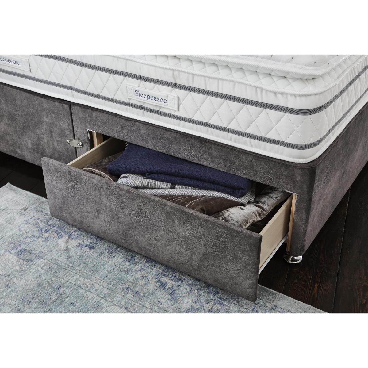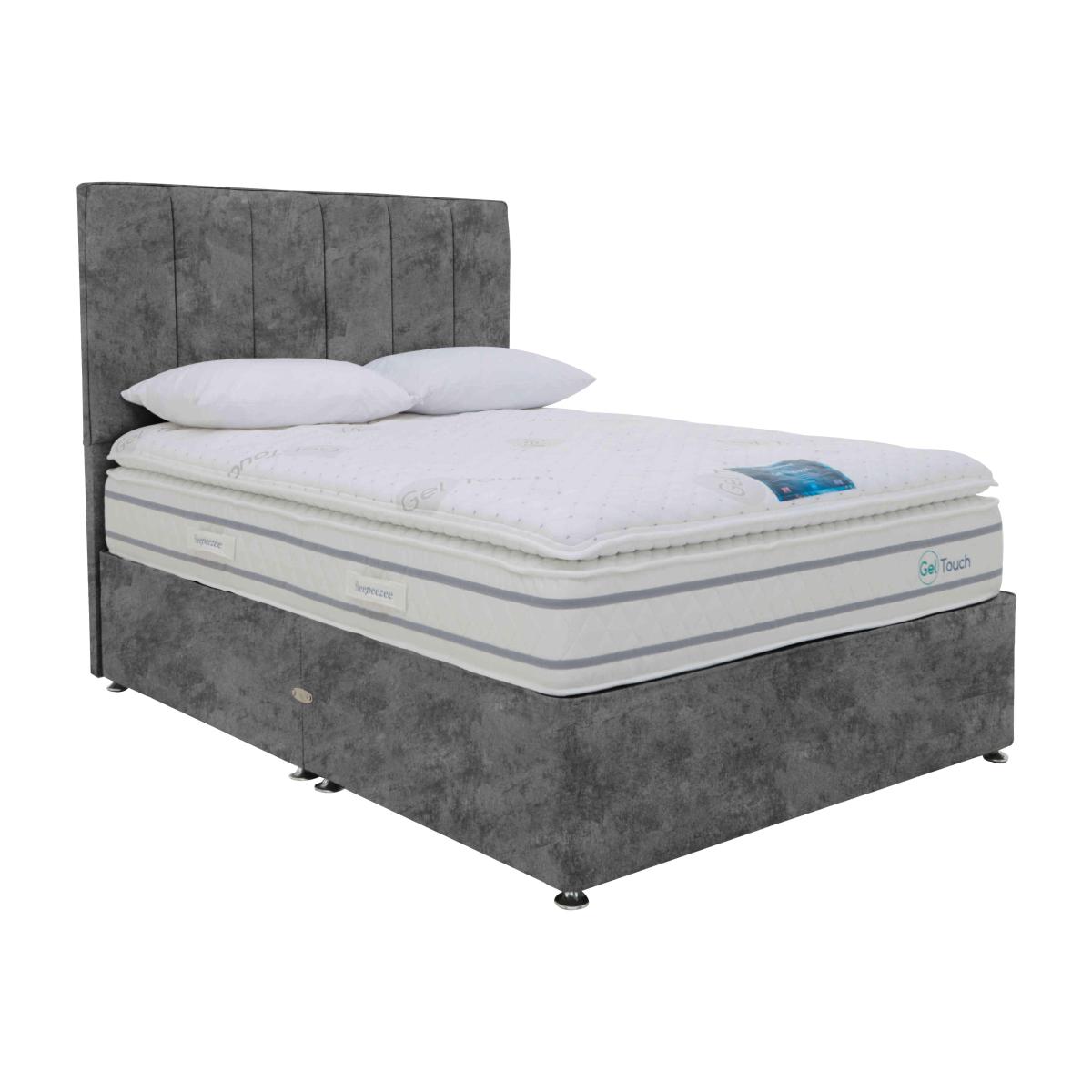 Sleep in luxurious comfort and stay cool all night long with the fantastic Sleepeezee Gel Touch 5000 collection. Beautifully handcrafted, the innovative mattress offer truly cooling comfort and features a special cool-touch mattress cover plus a triple-depth layer of Sleepeezee’s StayCool™ gel, a pressure-sensitive foam that conforms to your body and helps regulate body temperature for more restful sleep. This medium feel mattress has two tiers of traditional and mini pocket springs and pairs beautifully with the collection’s upholstered divan base, available with a choice of useful built in drawers and side-lift ottoman storage options. The Sleepeezee Gel Touch 5000 collection is handcrafted in Britain and exclusively available at Furniture Village. Sleepeezee holds a Royal Warrant from HRH The Prince of Wales.. Ultimate cooling mattress with StayCool™ gel and 5200 pocket springs in king size. Divan base in a wide choice of fabrics and with optional storage. Handcrafted in Britain and exclusive to Furniture VillageAmazing cooling mattress comfort plus a beautiful divan base - the hypoallergenic Sleepeezee Gel Touch 5000 divan set promises better sleep and a more stylish bedroom. At 38 cm deep, the medium-feel pillow top mattress has a 60 mm triple-depth layer of Sleepeezee’s StayCool gel, a unique pressure-sensitive gel foam that conforms to your body while helping to regulate body temperature for the ultimate in cool comfort, plus 5200 pocket springs in king size. There are 1200 traditional pocket springs and a layer of 4000 mini springs which together promise fantastic personalised support. The spring system is fully encapsulated for edge support. A cool-touch cover enhances the overall cooling feel, ensuring you wake fully rested. The platform top divan base is offered with a choice of optional storage features - roomy drawers or space-saving side-lift ottoman. Choose from a range of fabrics in an extensive choice of colours. Handcrafted in Britain, the fantastic Sleepeezee Gel Touch 5000 divan set is part of the Sleepeezee Gel Touch 5000 collection which also includes the matching mattress. A Furniture Village exclusive. Did you know? : This mattress should be aired for four hours after delivery to freshen and remove any aroma from storage. It may take time for your mattress to attain its full size once the springs have settled to the correct position. This is due to the mattress being upright during transit. Settlement of fillings and indentations caused by body weight compressing the fillings are natural and not considered defects. This can be minimised by regular rotating. This is a non-turn mattress. We recommend the use of a mattress protector..