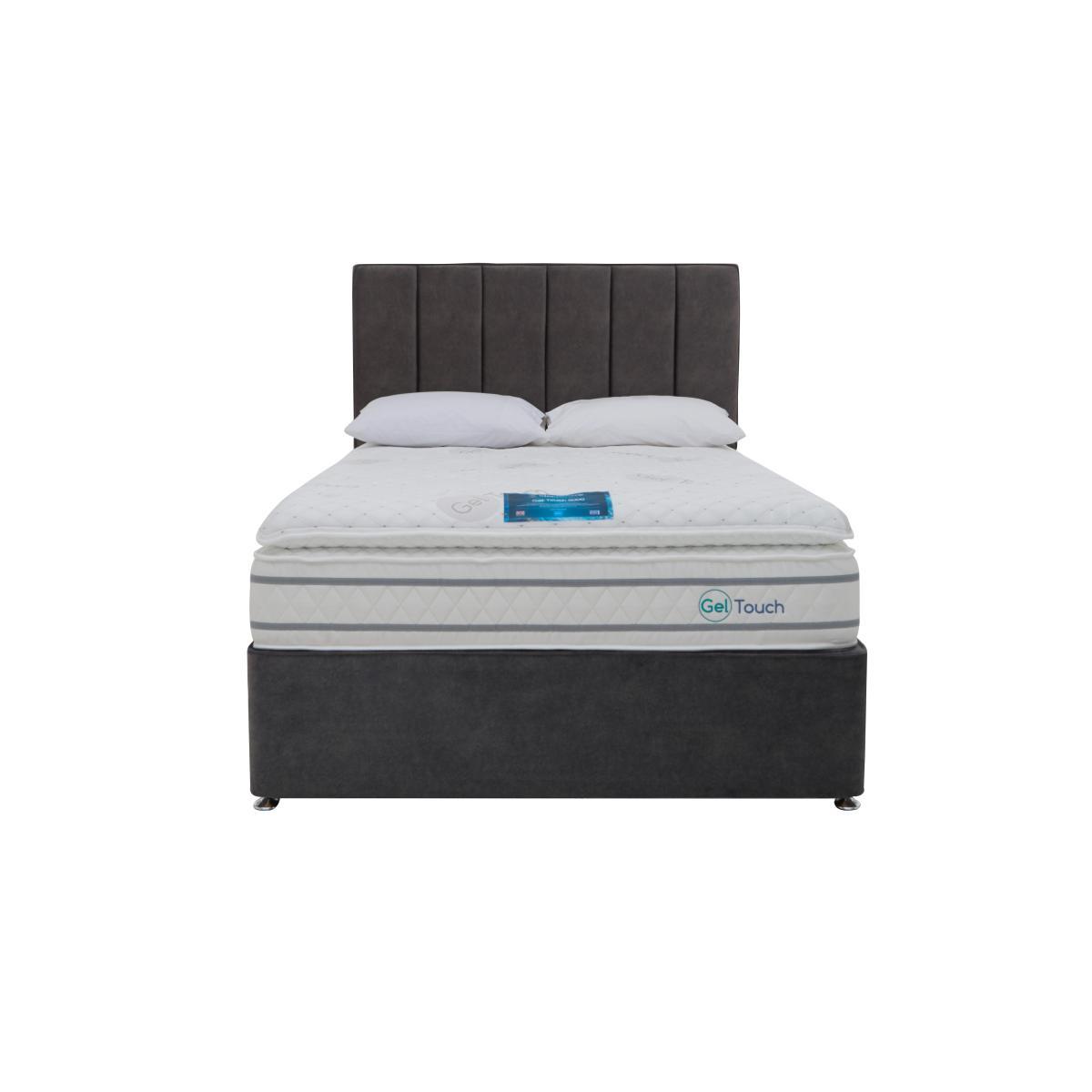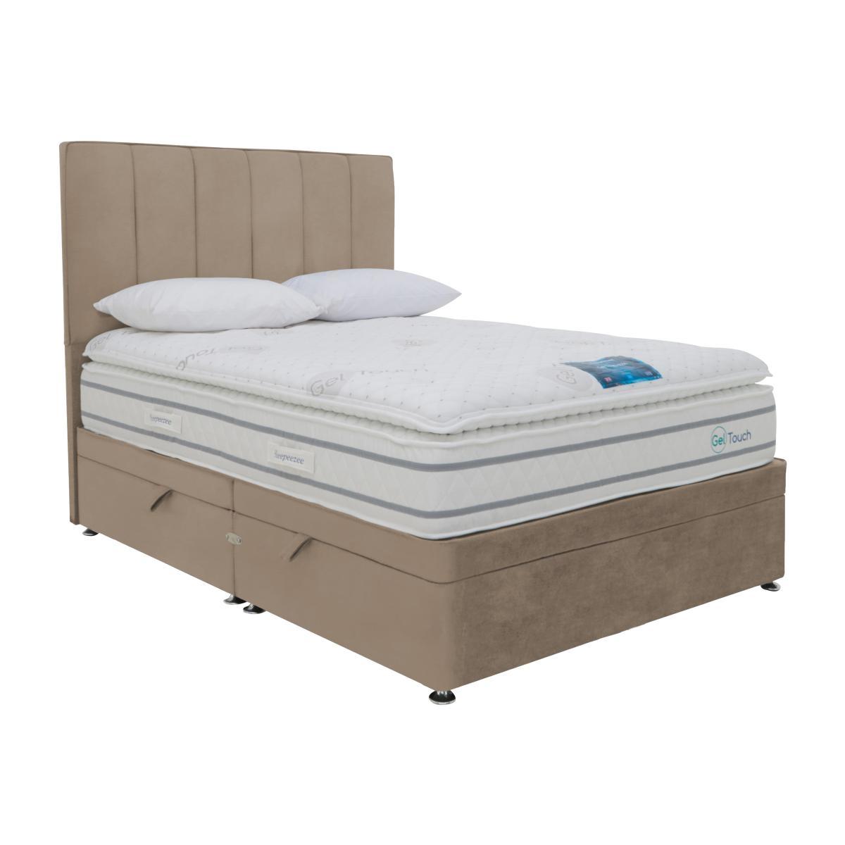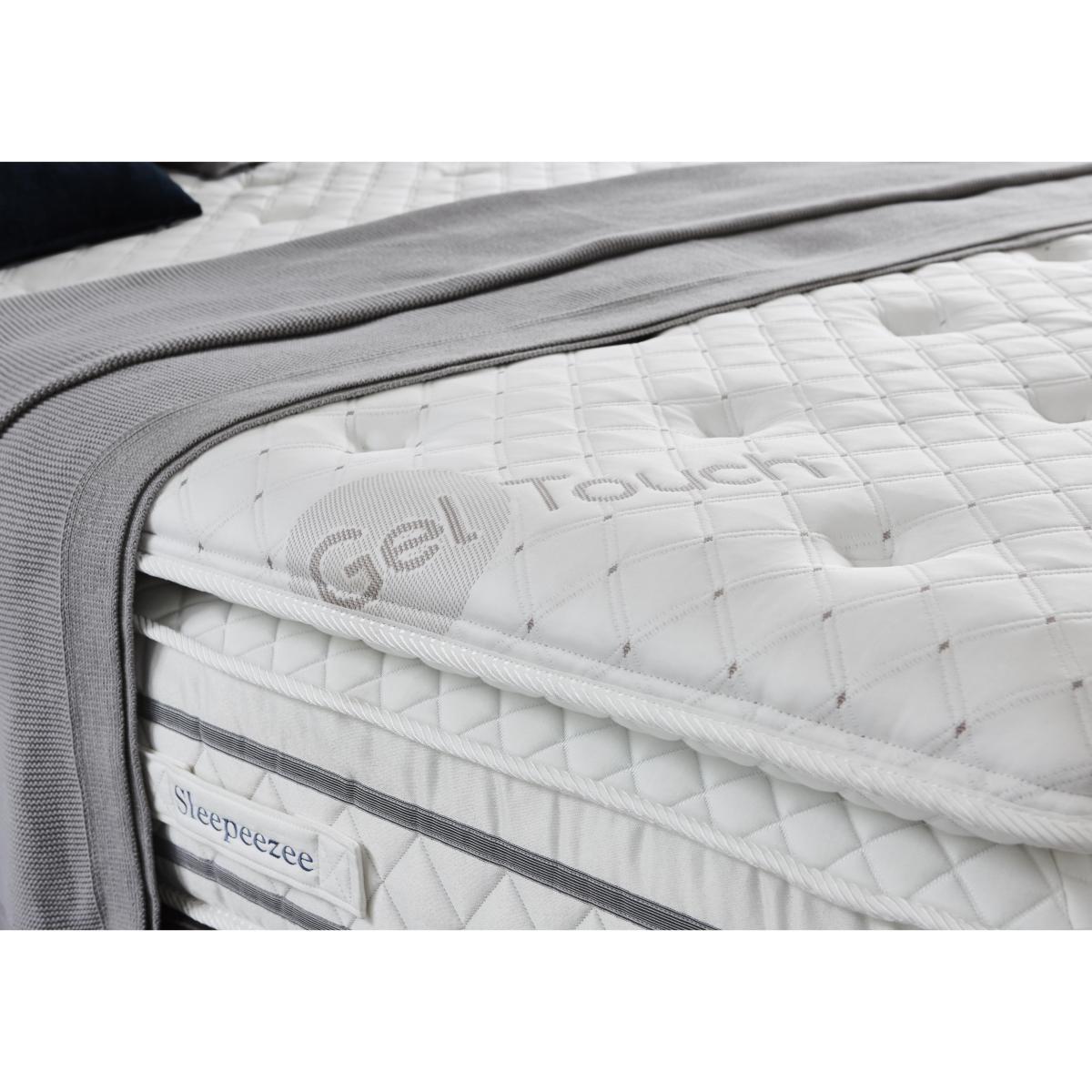 Sleep in luxurious comfort and stay cool all night long with the fantastic Sleepeezee Gel Touch 5000 collection. Beautifully handcrafted, the innovative mattress offer truly cooling comfort and features a special cool-touch mattress cover plus a triple-depth layer of Sleepeezee’s StayCool™ gel, a pressure-sensitive foam that conforms to your body and helps regulate body temperature for more restful sleep. This medium feel mattress has two tiers of traditional and mini pocket springs and pairs beautifully with the collection’s upholstered divan base, available with a choice of useful built in drawers and side-lift ottoman storage options. The Sleepeezee Gel Touch 5000 collection is handcrafted in Britain and exclusively available at Furniture Village. Sleepeezee holds a Royal Warrant from HRH The Prince of Wales. Looking for the ultimate in cooling mattress comfort – plus ergonomic bedroom storage? Here’s your bed. Enjoy a triple layer of cooling gel, a soft pillow top and a cool-touch cover plus a space-saving side-lift ottoman base. Why you’ll love it. The last word in cooling mattress comfort plus side-lift ottoman storage. Over 5000 responsive pocket springs in king size. Triple layer of Sleepeezee’s body-conforming StayCool™ gel foam. Wide choice of fabrics for the upholstered divan base. The range also includes a standalone mattress and a choice of storage divan sets. Sleepeezee holds a Royal Warrant of Appointment granted by HRH The Prince of Wales. Handcrafted in Britain and exclusive to Furniture Village. What you need to know. Mattress type: Pocket spring. Depth: 38 cm. Firmness: Medium. Springs: 1200 traditional pocket springs and 4000 mini springs in two tiers in king size. Pillow top: Yes. Fillings: 60 mm layer of Sleepeezee’s StayCool gel foam. Edge support: Yes. Cover: Made of a knitted cool-touch fabric. Requires turning: No. Base type: Platform top with side-lift ottoman storage. Sizes: Single, double, king and super king. Mattress care: Air for 4 hours before using to remove any odour. Allow at least 4 hours for springs to settle and for mattress to attain its full size. Indentations caused by settlement of fillings or body weight are normal and are not considered defects. If used on a slatted bed frame, slats must be no more than 7 cm apart. Rotate regularly.