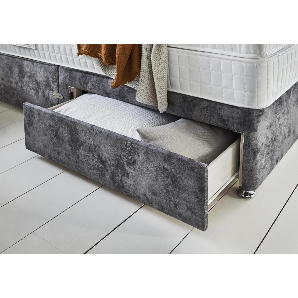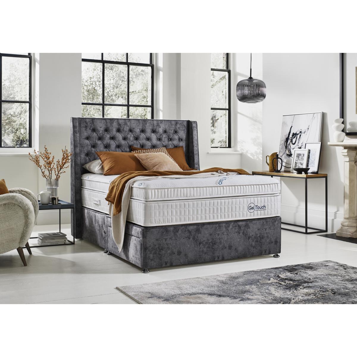 The Sleepeezee Geltouch Advanced 10000 collection puts your comfort front and centre – especially if you tend to get too warm at night. The range’s handcrafted pocket sprung mattresses feature Temperature. Smart™ cooling strips that effectively disperse body heat and help you maintain an optimal sleep temperature all night long, plus layers of cushioning StayCool™ gel to regulate body temperature. And with a generous 10,000 pocket springs in king size, ultra-comfortable memory foam and full-width mattress support, everything about this mattress is destined to help you sleep better and for longer. Pair yours with the range's beautiful upholstered divan base and add the storage solution – drawers or ottoman base – of your choice. The Sleepeezee Geltouch Advanced 10000 range is exclusive to Furniture Village. Everything about this Sleepeezee divan set is designed for better sleep – from the advanced mattress with built-in temperature control to the supportive platform-top divan base. Why you'll love it This exceptional divan set delivers cooling comfort with plenty of bedroom style. Outstanding pocket sprung mattress promises better sleep 5 ways. 10,000 pocket springs in king size ensure exceptional support. TemperatureSmart™ cooling strips disperse heat and help you maintain a consistent temperature. Layers of ultra-comfortable pressure-sensitive StayCool™ gel help regulate body temperature. Slow-release memory foam gives you that wonderfully relaxing floating feeling. Fully encapsulated construction means edge to edge support and a larger sleep surface. Choose from a fantastic choice of colours for the upholstered divan base. With optional storage drawers. Also available as end-lift and side-lift ottoman divan sets. Handmade in England and exclusive to Furniture Village. This divan set is part of the Sleepeezee Geltouch Advanced 10000 range. What you need to know Headboard shown is the Sleepeezee Pendleton headboard, available separately. Mattress type: Pocket spring. Depth: 38 cm. Firmness: Medium. Springs: 10,000 in king size. Pillow top: No. Fillings: Memory foam, polyester. Cover: Knitted, woven. Requires turning: No. Base type: Platform-top with optional storage. Sizes: Single, small double, double, king, super king. Mattress care:Air for 4 hours before using to remove any odour. Allow at least 4 hours for springs to settle and for mattress to attain its full size. Indentations caused by settlement of fillings or body weight are normal and are not considered defects. If used on a slatted bed frame, the space between slats must be no wider than 7.5 cm. Spaces wider than this may cause excess dipping of the mattress and invalidate the guarantee. Always use a mattress protector. Rotate regularly. Divan base care: Clean upholstery weekly using a soft brush or vacuum with the curtain attachment. Professional cleaning advised for oil- and grease-based stains. Some fabrics can show wear on areas of more use or in direct sunlight.