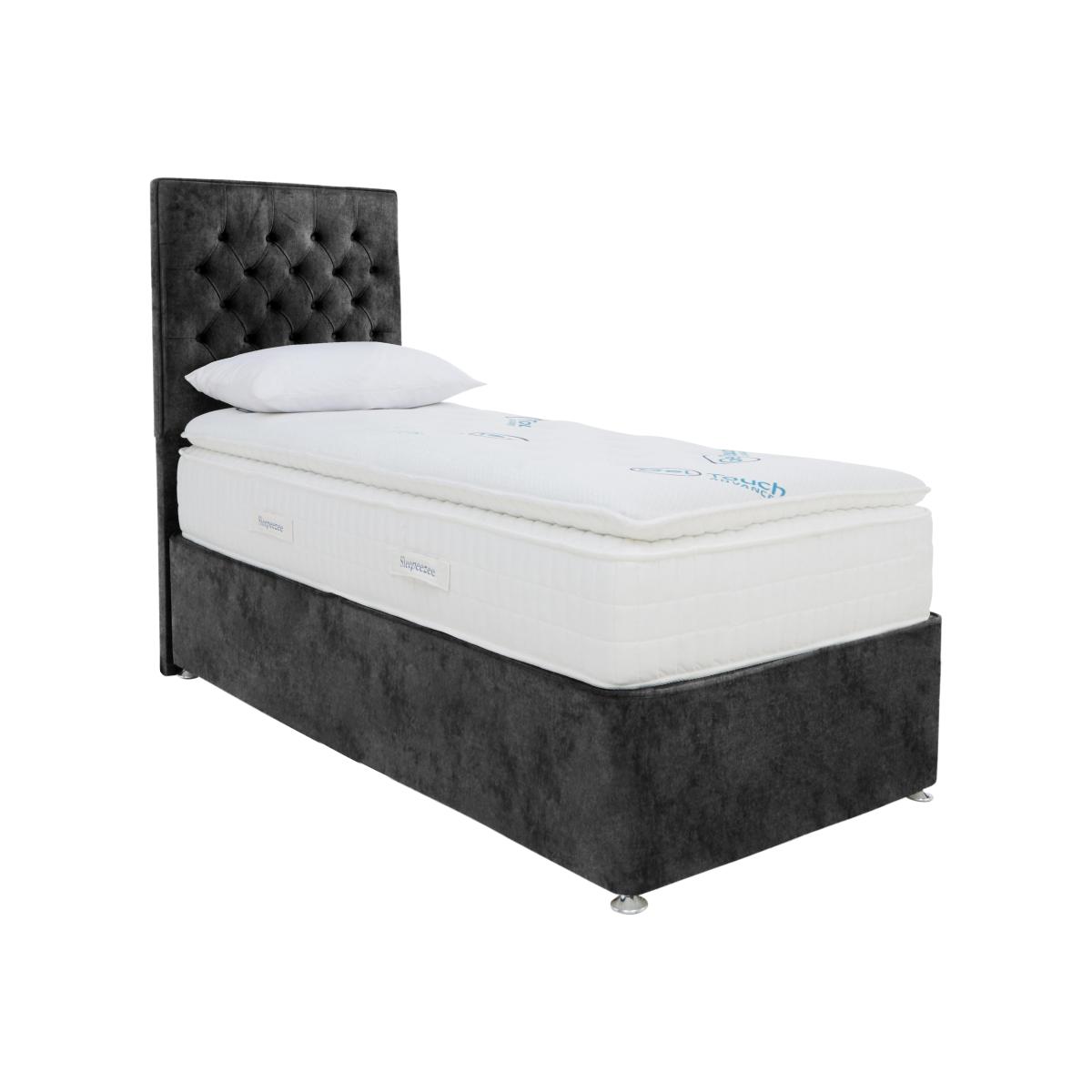 The Sleepeezee Geltouch Advanced 10000 collection puts your comfort front and centre – especially if you tend to get too warm at night. The range’s handcrafted pocket sprung mattresses feature Temperature. Smart™ cooling strips that effectively disperse body heat and help you maintain an optimal sleep temperature all night long, plus layers of cushioning StayCool™ gel to regulate body temperature. And with a generous 10,000 pocket springs in king size, ultra-comfortable memory foam and full-width mattress support, everything about this mattress is destined to help you sleep better and for longer. Pair yours with the range's beautiful upholstered divan base and add the storage solution – drawers or ottoman base – of your choice. The Sleepeezee Geltouch Advanced 10000 range is exclusive to Furniture Village. Everything about this Sleepeezee divan set is designed for better sleep – from the advanced mattress with built-in temperature control to the supportive platform-top divan base. Why you'll love it This exceptional divan set delivers cooling comfort with plenty of bedroom style. Outstanding pocket sprung mattress promises better sleep 5 ways. 10,000 pocket springs in king size ensure exceptional support. TemperatureSmart™ cooling strips disperse heat and help you maintain a consistent temperature. Layers of ultra-comfortable pressure-sensitive StayCool™ gel help regulate body temperature. Slow-release memory foam gives you that wonderfully relaxing floating feeling. Fully encapsulated construction means edge to edge support and a larger sleep surface. Choose from a fantastic choice of colours for the upholstered divan base. With optional storage drawers. Also available as end-lift and side-lift ottoman divan sets. Handmade in England and exclusive to Furniture Village. This divan set is part of the Sleepeezee Geltouch Advanced 10000 range. What you need to know Headboard shown is the Sleepeezee Pendleton headboard, available separately. Mattress type: Pocket spring. Depth: 38 cm. Firmness: Medium. Springs: 10,000 in king size. Pillow top: No. Fillings: Memory foam, polyester. Cover: Knitted, woven. Requires turning: No. Base type: Platform-top with optional storage. Sizes: Single, small double, double, king, super king. Mattress care:Air for 4 hours before using to remove any odour. Allow at least 4 hours for springs to settle and for mattress to attain its full size. Indentations caused by settlement of fillings or body weight are normal and are not considered defects. If used on a slatted bed frame, the space between slats must be no wider than 7.5 cm. Spaces wider than this may cause excess dipping of the mattress and invalidate the guarantee. Always use a mattress protector. Rotate regularly. Divan base care: Clean upholstery weekly using a soft brush or vacuum with the curtain attachment. Professional cleaning advised for oil- and grease-based stains. Some fabrics can show wear on areas of more use or in direct sunlight.