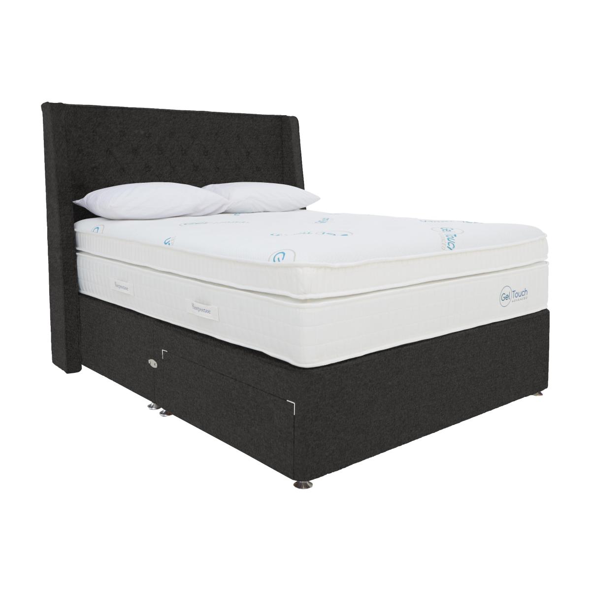 The Sleepeezee Geltouch Advanced 10000 collection puts your comfort front and centre – especially if you tend to get too warm at night. The range’s handcrafted pocket sprung mattresses feature Temperature. Smart™ cooling strips that effectively disperse body heat and help you maintain an optimal sleep temperature all night long, plus layers of cushioning StayCool™ gel to regulate body temperature. And with a generous 10,000 pocket springs in king size, ultra-comfortable memory foam and full-width mattress support, everything about this mattress is destined to help you sleep better and for longer. Pair yours with the range's beautiful upholstered divan base and add the storage solution – drawers or ottoman base – of your choice. The Sleepeezee Geltouch Advanced 10000 range is exclusive to Furniture Village. Everything about this Sleepeezee divan set is designed for better sleep – from the advanced mattress with built-in temperature control to the supportive platform-top divan base. Why you'll love it This exceptional divan set delivers cooling comfort with plenty of bedroom style. Outstanding pocket sprung mattress promises better sleep 5 ways. 10,000 pocket springs in king size ensure exceptional support. TemperatureSmart™ cooling strips disperse heat and help you maintain a consistent temperature. Layers of ultra-comfortable pressure-sensitive StayCool™ gel help regulate body temperature. Slow-release memory foam gives you that wonderfully relaxing floating feeling. Fully encapsulated construction means edge to edge support and a larger sleep surface. Choose from a fantastic choice of colours for the upholstered divan base. With optional storage drawers. Also available as end-lift and side-lift ottoman divan sets. Handmade in England and exclusive to Furniture Village. This divan set is part of the Sleepeezee Geltouch Advanced 10000 range. What you need to know Headboard shown is the Sleepeezee Pendleton headboard, available separately. Mattress type: Pocket spring. Depth: 38 cm. Firmness: Medium. Springs: 10,000 in king size. Pillow top: No. Fillings: Memory foam, polyester. Cover: Knitted, woven. Requires turning: No. Base type: Platform-top with optional storage. Sizes: Single, small double, double, king, super king. Mattress care:Air for 4 hours before using to remove any odour. Allow at least 4 hours for springs to settle and for mattress to attain its full size. Indentations caused by settlement of fillings or body weight are normal and are not considered defects. If used on a slatted bed frame, the space between slats must be no wider than 7.5 cm. Spaces wider than this may cause excess dipping of the mattress and invalidate the guarantee. Always use a mattress protector. Rotate regularly. Divan base care: Clean upholstery weekly using a soft brush or vacuum with the curtain attachment. Professional cleaning advised for oil- and grease-based stains. Some fabrics can show wear on areas of more use or in direct sunlight.