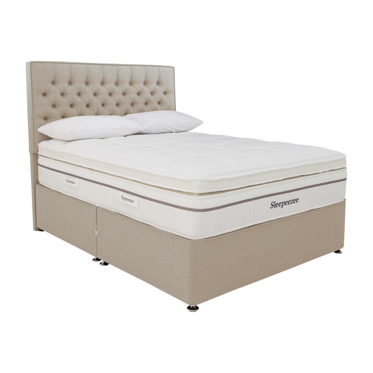 Luxurious mattress comfort meets traditional well-crafted divan style in the Sleepeezee Harmony 3500 collection. The superb medium-feel hypoallergenic mattress, complete with sumptuous pillow top, features three layers of memory foam and three tiers of individually-responsive pocket springs, a combination that’s precisely engineered for the optimum in comfort and support. Divan bases are beautifully upholstered in a choice of plush-feel, tweed and woven fabrics and come with optional storage drawers or an ottoman base. Handcrafted in the UK by Sleepeezee exclusively for Furniture Village. Superior pillow top, memory foam and pocket spring mattress. Beautifully upholstered divan base with optional storage. Handcrafted in the UK for Furniture Village. Superb layered mattress comfort, classic divan base style, optional storage drawers – there’s so much to love about the Sleepeezee Harmony 3500 divan set. Featuring a fabulous and innovatively-designed mattress with three tiers of individually-pocketed springs – a full 3500 in king size – and three layers of body-confirming memory foam, this deep 35 cm hypoallergenic mattress is topped with a soft and sumptuous pillow top. The overall comfort feel is medium, and you’ll appreciate the precisely-engineered combination of cushioning comfort and responsive support. It rests on a classic platform top-style divan base that’s beautifully upholstered. Choose from a huge range of fabric colours that include subtle neutrals as well as sophisticated modern hues, and then add optional drawer or ottoman storage. Handcrafted in the UK exclusively for Furniture Village, the Sleepeezee Harmony 3500 divan set is part of the Sleepeezee Harmony 3500 collection which also includes a standalone mattress. Sleepeezee holds a Royal Warrant of Appointment granted by HRH The Prince of Wales. Product images are representative. Find out more. Did you know?. The mattress should be aired for four hours after delivery to freshen and remove any aroma from storage. It may take time for your mattress to attain its full size once the springs have settled to the correct position. This is due to the mattress being upright during transit. Settlement of fillings and indentations caused by body weight compressing the fillings are natural and not considered defects. This can be minimised by regular rotating.