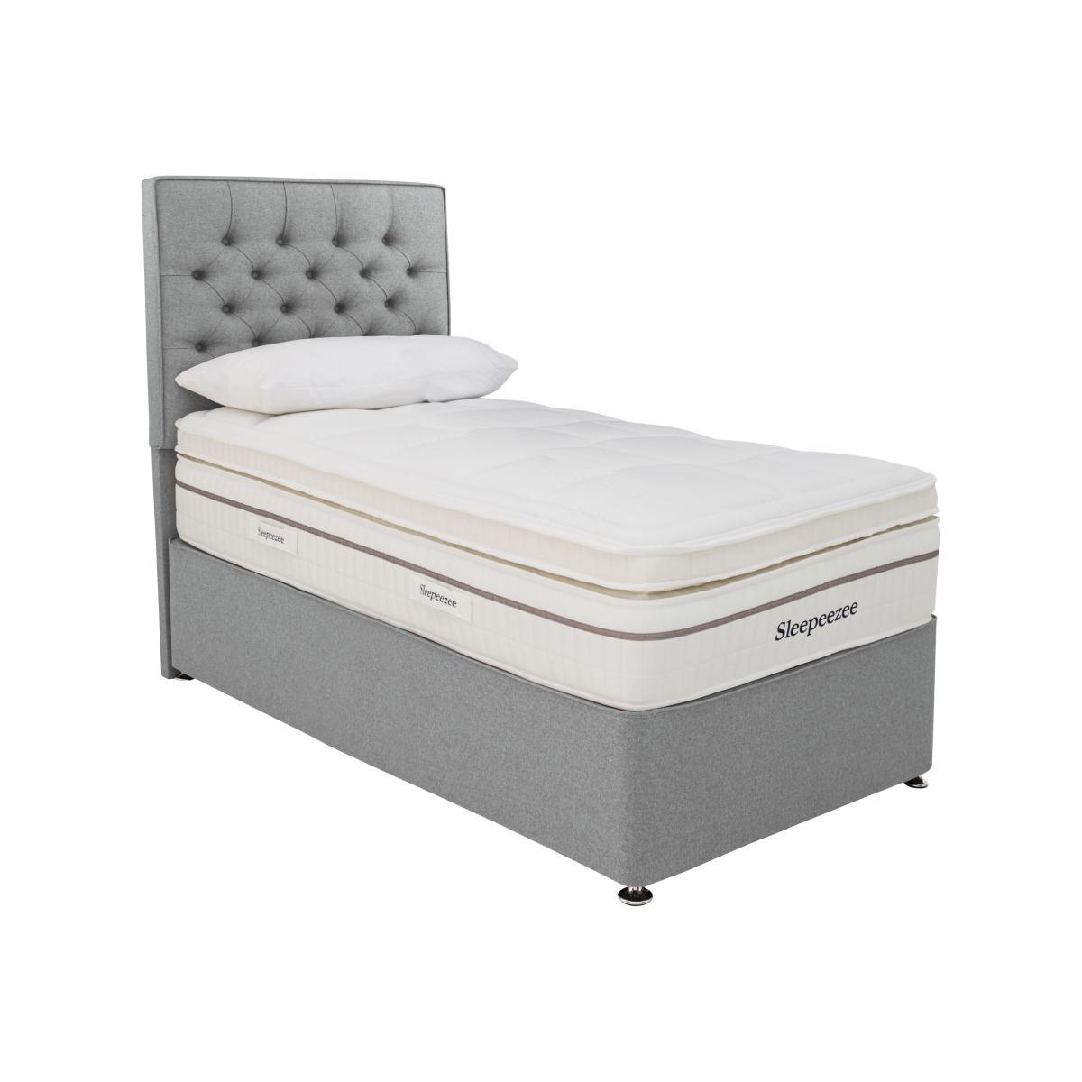 Luxurious mattress comfort meets traditional well-crafted divan style in the Sleepeezee Harmony 3500 collection. The superb medium-feel hypoallergenic mattress, complete with sumptuous pillow top, features three layers of memory foam and three tiers of individually-responsive pocket springs, a combination that’s precisely engineered for the optimum in comfort and support. Divan bases are beautifully upholstered in a choice of plush-feel, tweed and woven fabrics and come with optional storage drawers or an ottoman base. Handcrafted in the UK by Sleepeezee exclusively for Furniture Village. Superior pillow top, memory foam and pocket spring mattress. Beautifully upholstered divan base with optional storage. Handcrafted in the UK for Furniture Village. Superb layered mattress comfort, classic divan base style, optional storage drawers – there’s so much to love about the Sleepeezee Harmony 3500 divan set. Featuring a fabulous and innovatively-designed mattress with three tiers of individually-pocketed springs – a full 3500 in king size – and three layers of body-confirming memory foam, this deep 35 cm hypoallergenic mattress is topped with a soft and sumptuous pillow top. The overall comfort feel is medium, and you’ll appreciate the precisely-engineered combination of cushioning comfort and responsive support. It rests on a classic platform top-style divan base that’s beautifully upholstered. Choose from a huge range of fabric colours that include subtle neutrals as well as sophisticated modern hues, and then add optional drawer or ottoman storage. Handcrafted in the UK exclusively for Furniture Village, the Sleepeezee Harmony 3500 divan set is part of the Sleepeezee Harmony 3500 collection which also includes a standalone mattress. Sleepeezee holds a Royal Warrant of Appointment granted by HRH The Prince of Wales. Product images are representative. Find out more. Did you know?. The mattress should be aired for four hours after delivery to freshen and remove any aroma from storage. It may take time for your mattress to attain its full size once the springs have settled to the correct position. This is due to the mattress being upright during transit. Settlement of fillings and indentations caused by body weight compressing the fillings are natural and not considered defects. This can be minimised by regular rotating.