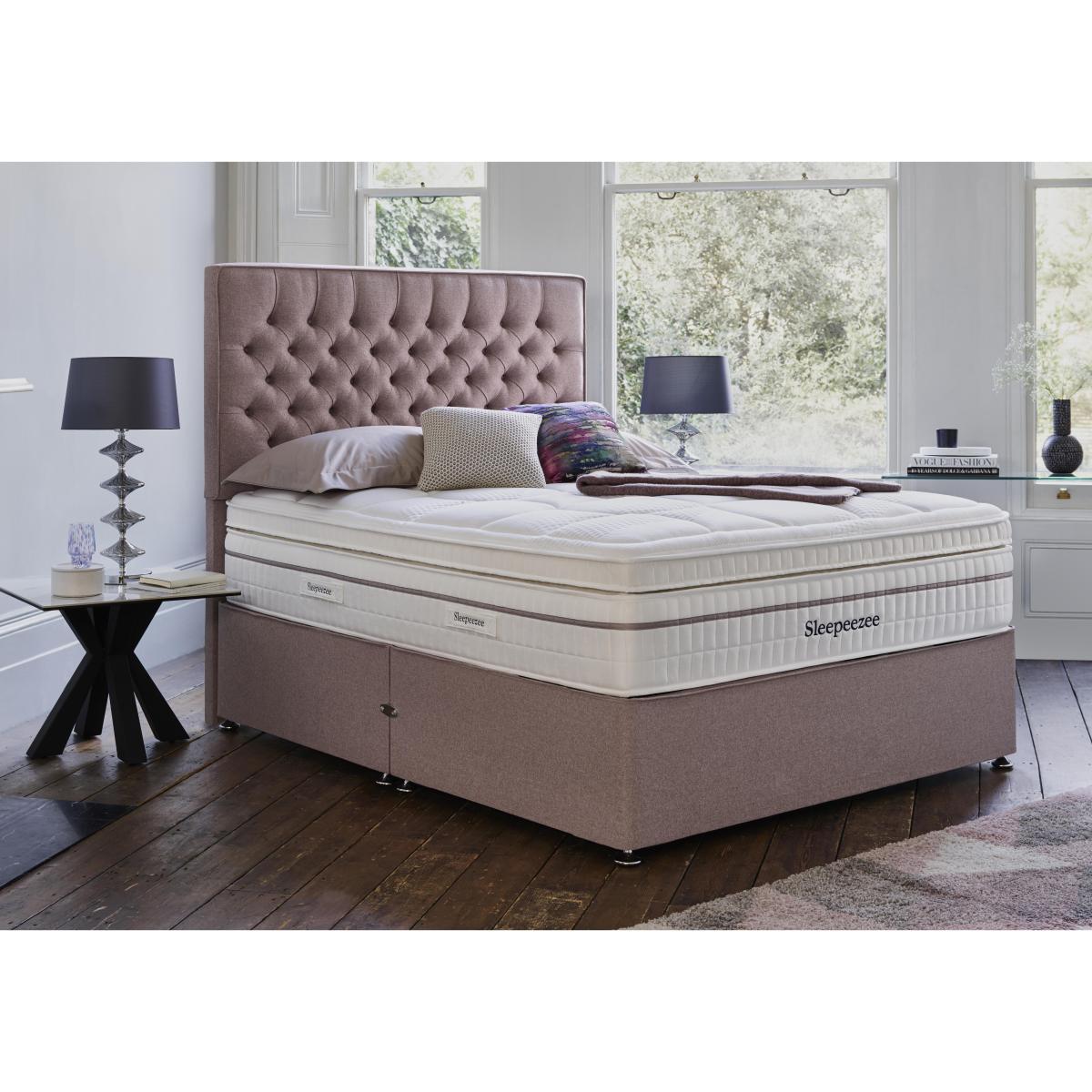 Luxurious mattress comfort meets traditional well-crafted divan style in the Sleepeezee Harmony 3500 collection. The superb medium-feel hypoallergenic mattress, complete with sumptuous pillow top, features three layers of memory foam and three tiers of individually-responsive pocket springs, a combination that’s precisely engineered for the optimum in comfort and support. Divan bases are beautifully upholstered in a choice of plush-feel, tweed and woven fabrics and come with optional storage drawers or an ottoman base. Handcrafted in the UK by Sleepeezee exclusively for Furniture Village. Superior pillow top, memory foam and pocket spring mattress Beautifully upholstered divan base with optional storage Handcrafted in the UK for Furniture Village Superb layered mattress comfort, classic divan base style, optional storage drawers – there’s so much to love about the Sleepeezee Harmony 3500 divan set. Featuring a fabulous and innovatively-designed mattress with three tiers of individually-pocketed springs – a full 3500 in king size – and three layers of body-confirming memory foam, this deep 35 cm hypoallergenic mattress is topped with a soft and sumptuous pillow top. The overall comfort feel is medium, and you’ll appreciate the precisely-engineered combination of cushioning comfort and responsive support. It rests on a classic platform top-style divan base that’s beautifully upholstered. Choose from a huge range of fabric colours that include subtle neutrals as well as sophisticated modern hues, and then add optional drawer or ottoman storage. Handcrafted in the UK exclusively for Furniture Village, the Sleepeezee Harmony 3500 divan set is part of the Sleepeezee Harmony 3500 collection which also includes a standalone mattress. Sleepeezee holds a Royal Warrant of Appointment granted by HRH The Prince of Wales. Product images are representative. Find out moreDid you know? The mattress should be aired for four hours after delivery to freshen and remove any aroma from storage. It may take time for your mattress to attain its full size once the springs have settled to the correct position. This is due to the mattress being upright during transit. Settlement of fillings and indentations caused by body weight compressing the fillings are natural and not considered defects. This can be minimised by regular rotating.