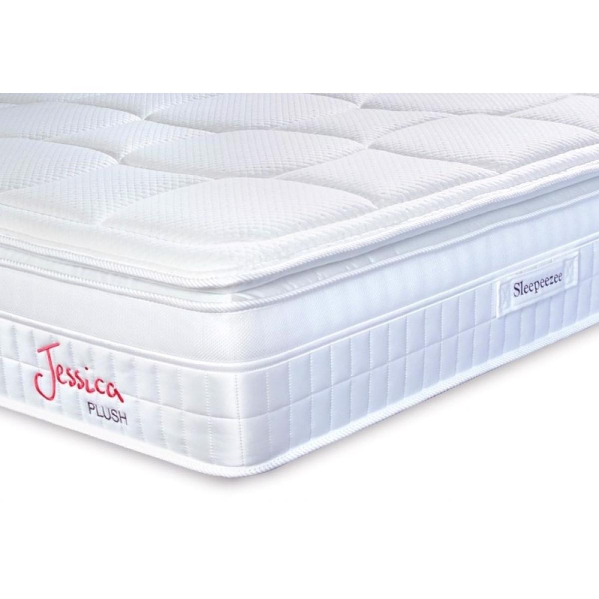 Note - The headboard pictured is not included but is available to purchase separately. The base or frame pictured in the image may not be representative of the specific base you require. Please contact us for more information, if needed. Introducing the Jessica Plush, a medium-soft encapsulated mattress complete with Dreamzone Foam that contours to your body, adjusting to your every movement, and with the perfect blend of technologies, you're guaranteed to sleep soundly all night long. Sleep like a champion to get the most out of every day with the Jessica Plush mattress. The Jessica range, named for Dame Jessica Ennis-Hill, is perfect for those with an active lifestyle. It combines the best of our sleep technology with Hypoallergenic & Staycool Gel. Softer Support - Soft mattresses are ideal for those who love to sink into their mattress, providing a gentle support base, contouring to your natural body shape. Perfect for side sleepers. Hypoallergenic - Contains white fibre filling to cushion spring movement and reduce allergens. Non Turn - Easy care non-turn mattress that saves time and effort. Pillow Top - A sumptuous pillow top layer providing extra comfort. Dream Zone Foam - Profiled zoned foam that will contour to your body adjusting to your every movement providing superior support during the night. 2200 Pocketed springs (in a 150cm size) A combination of traditional and Softech springs that move independently, contouring to your body providing optimum support and posture. Non turn, easy care mattress - There's no need to turn the mattress over - just rotate head to foot, with the seasons, to ensure longevity and continued comfort. Platinum fibres - Designed to provide superior comfort and support night after night, whilst offering increased breathability by wicking away moisture. Dreamzone foam - Profiled foam that will contour to your body adjusting to your every movement providing superior support during the night. White fibre & soft polyester layers - Providing added comfort with excellent recovery and rebound properties to give enhanced support. Soft knitted cover - A soft, sumptuous finish that gives enhanced comfort and a truly luxurious feel. Flag-stitched handles - Flag-stitching gives ultimate strength to each of the handles, making it easier to rotate or move the mattress when required. 10 Year Guarantee - Here at Sleepeezee we are confident all of our beds are made to the highest standards. Therefore we offer a ten-year guarantee on our Jessica Plush mattress. Made in the UK - Each mattress is handmade by our expert team at our factory in Kent and then shipped directly to retailers across the UK. Dimensions: Platform Top Base Height: 30.5cm/12 inches Ottoman Base Height: 35.6cm/14 inches All screens vary in colour reproduction and whilst every effort has been made to display the colour as accurately as possible it is for guidance only.