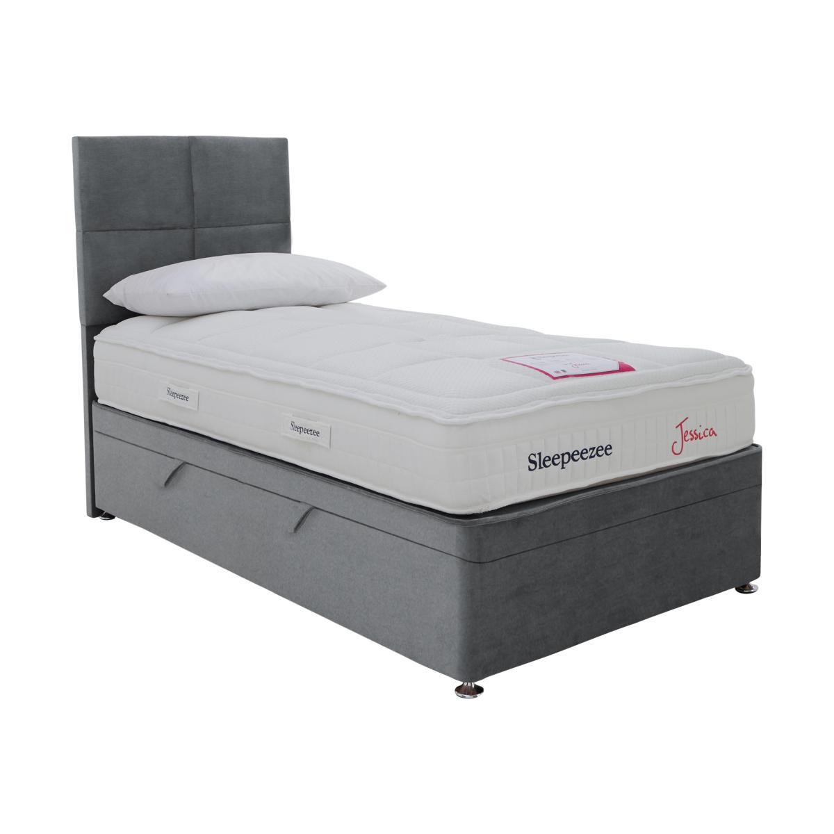 The Sleepeezee Jessica range was designed in partnership with elite athlete and Sleepeezee Ambassador Jessica Ennis-Hill. And now its cooling, supportive, luxurious and hypoallergenic medium to firm feel mattress has won a Which? Best Buy award. Enjoy the comfort of edge-to-edge support, temperature regulating StayCool® foam, memory foam, traditional springs and body-contouring SoftTech® springs. Choose from beautiful side ottoman and drawer divan bases covered in a choice of attractive fabrics and colours. A donation to Ennis-Hill’s Hospital charity is made with every mattress sold. Medium to firm comfort with temperature regulating StayCool® foam. 1800 pocket springs in king size, including innovative SoftTech® springs. Side ottoman divan base in a choice of gorgeous fabrics. Headboard is an optional extra. Proudly handcrafted here in the UK and designed in partnership with Sleepeezee Brand Ambassador Jessica Ennis-Hill, the Sleepeezee Jessica side ottoman divan set has lots to recommend it. There’s plenty of useful storage in the easy open side-ottoman base, luxuriously upholstered in a choice of lovely fabrics and colours. Then there’s supportive, pampering, medium to firm feel comfort of the Which? Best Buy mattress – designed to give you a cooling, comfy, hypoallergenic night’s sleep on responsive pocket springs. The 25cm deep mattress has a soft knitted, quilted cover with damask border. Working from the base upwards you’ll find traditional pocket springs, a further layer of responsive SoftTech® springs for posture-friendly support, a deep layer of StayCool® foam and finally memory foam topped with soft, hypoallergenic white fibres. The single sided, no turn mattress is fully encapsulated with a firm edge so there’s no roll-together. The side ottoman divan base is made from high quality timber and materials and robustly constructed. It’s available in all the standard bed sizes. Product images are representative. Find out more. The mattress is a non-turn mattress. We recommend the use of a mattress protector. Please note:. The mattress should be aired for four hours after delivery to freshen and remove any aroma from storage. It may take time for your mattress to attain its full size once the springs have settled to the correct position. This is due to the mattress being upright during transit. Settlement of fillings and indentations caused by body weight compressing the fillings are natural and not considered defects. This can be minimised by regular rotating.