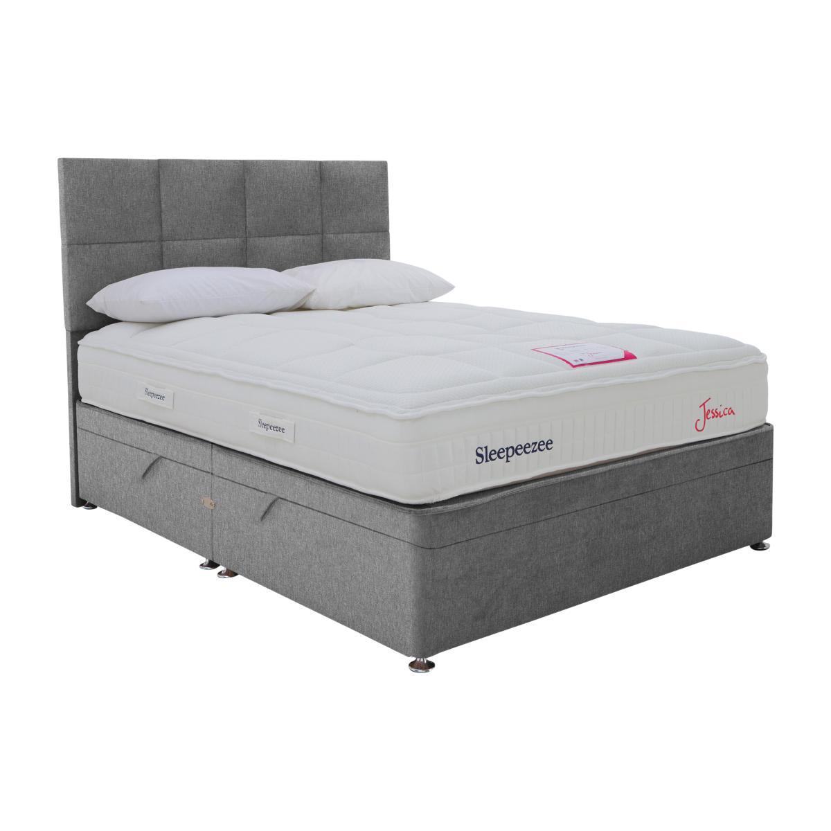 Medium to firm comfort with temperature regulating StayCool foam 1800 pocket springs in king size, including innovative SoftTech springs Side ottoman divan base in a choice of gorgeous fabrics Proudly handcrafted here in the UK and designed in partnership with Sleepeezee Brand Ambassador Jessica Ennis- Hill, the Sleepeezee Jessica side ottoman divan set has lots to recommend it. Theres plenty of useful storage in the easy open side- ottoman base, luxuriously upholstered in a choice of lovely fabrics and colours. Then theres supportive, pampering, medium to firm feel comfort of the Which? Best Buy mattress designed to give you a cooling, comfy, hypoallergenic nights sleep on responsive pocket springs. The 25cm deep mattress has a soft knitted, quilted cover with damask border. Working from the base upwards youll find traditional pocket springs, a further layer of responsive SoftTech springs for posture- friendly support, a deep layer of StayCool foam and finally memory foam topped with soft, hypoallergenic white fibres. The single sided, no turn mattress is fully encapsulated with a firm edge so theres no roll- together. The side ottoman divan base is made from high quality timber and materials and robustly constructed. Its available in all the standard bed sizes. Product images are representative. Find out more The mattress is a non- turn mattress. We recommend the use of a mattress protector. Please note: The mattress should be aired for four hours after delivery to freshen and remove any aroma from storage. It may take time for your mattress to attain its full size once the springs have settled to the correct position. This is due to the mattress being upright during transit. Settlement of fillings and indentations caused by body weight compressing the fillings are natural and not considered defects. This can be minimised by regular rotating.