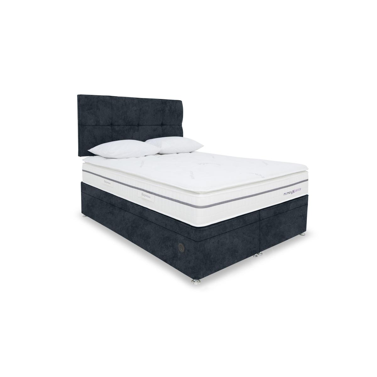 If you sleep better on cushioning, cocooning memory foam but worry about getting too hot at night, a bed or mattress from our Sleepeezee Memory Sense collection is going to be perfect for you. These pocket spring mattresses feature a unique type of ultra-comfortable memory foam infused with graphite that helps disperse body heat. Mattress covers are made with Oxysnse, a material that’s designed to increase your body’s oxygen levels to reduce muscle fatigue, help prevent the risk of sleep apnea and facilitate deeper sleep. Choose a medium or ortho firm feel mattress and pair it with a divan base with optional storage space. The Sleepeezee Memory Sense is exclusive to Furniture Village. Make life easy with this power ottoman divan set. As well as spacious, easy-lift storage, you’ll love the pocket spring mattress that’s designed to keep you cool and comfortable. Why you'll love it Refreshing sleep is yours with this Memory Sense 2300 power ottoman divan set. Mattress has individually pocketed springs for personalised medium-feel support. Layer of graphite-infused memory foam takes heat away from the body. Moulds to the shape of your body for excellent pressure relief. Helps distribute weight more evenly for better circulation. With an Oxysense cover which increases the body’s oxygen levels. Reduces muscle fatigue, helps prevent the risk of sleep apnea and facilitates deep sleep. Encapsulated edge-to-edge support helps prevent roll off. No turning required. With handles to make rotating easier. Hypoallergenic. Power ottoman base – all the storage, none of the lifting. Beautiful upholstered in a wide choice of fabrics. Made by hand in the UK and only at Furniture Village. This power ottoman divan set is part of our Sleepeezee Memory Sense 2300 range. What you need to know Mattress type: Pocket spring. Depth: 29 cm. Weight:Single 26 kg, small double 33 kg, double 38 kg, king 42 kg and super king 50 kg. Firmness: Medium. Springs: 2,300 in king size. Pillow top: No. Fillings: Polyester-encapsulated border, graphite memory foam. Cover: Oxysense fabric. Requires turning: No. Base type: Platform top with electric-powered end-ottoman storage. Sizes: Single, small double, double, king and super king. Mattress care:Air for 4 hours before using to remove any odour. Indentations caused by settlement of fillings or body weight are normal and are not considered defects. If used on a slatted bed frame, the space between slats must be no wider than 7.5 cm. Spaces wider than this may cause excess dipping of the mattress and invalidate the guarantee. Always use a mattress protector. Rotate regularly. Divan base care: Clean upholstery weekly using a soft brush or vacuum with the curtain attachment. Professional cleaning advised for oil- and grease-based stains. Some fabrics can show wear on areas of more use or in direct sunlight. The ottoman base is powered by mains electricity. Please ensure that you will be able to connect it to a power source before ordering.