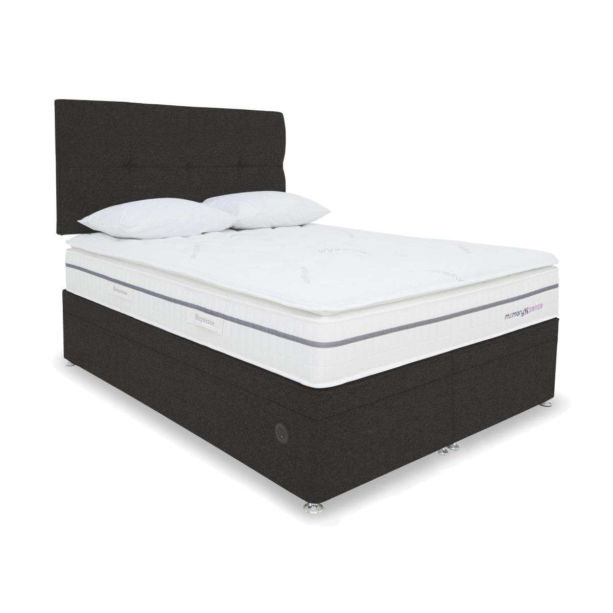 If you sleep better on cushioning, cocooning memory foam but worry about getting too hot at night, a bed or mattress from our Sleepeezee Memory Sense collection is going to be perfect for you. These pocket spring mattresses feature a unique type of ultra-comfortable memory foam infused with graphite that helps disperse body heat. Mattress covers are made with Oxysnse, a material that’s designed to increase your body’s oxygen levels to reduce muscle fatigue, help prevent the risk of sleep apnea and facilitate deeper sleep. Choose a medium or ortho firm feel mattress and pair it with a divan base with optional storage space. The Sleepeezee Memory Sense is exclusive to Furniture Village. Make life easy with this power ottoman divan set. As well as spacious, easy-lift storage, you’ll love the pocket spring mattress that’s designed to keep you cool and comfortable. Why you'll love it Refreshing sleep is yours with this Memory Sense 2300 power ottoman divan set. Mattress has individually pocketed springs for personalised medium-feel support. Layer of graphite-infused memory foam takes heat away from the body. Moulds to the shape of your body for excellent pressure relief. Helps distribute weight more evenly for better circulation. With an Oxysense cover which increases the body’s oxygen levels. Reduces muscle fatigue, helps prevent the risk of sleep apnea and facilitates deep sleep. Encapsulated edge-to-edge support helps prevent roll off. No turning required. With handles to make rotating easier. Hypoallergenic. Power ottoman base – all the storage, none of the lifting. Beautiful upholstered in a wide choice of fabrics. Made by hand in the UK and only at Furniture Village. This power ottoman divan set is part of our Sleepeezee Memory Sense 2300 range. What you need to know Mattress type: Pocket spring. Depth: 29 cm. Weight:Single 26 kg, small double 33 kg, double 38 kg, king 42 kg and super king 50 kg. Firmness: Medium. Springs: 2,300 in king size. Pillow top: No. Fillings: Polyester-encapsulated border, graphite memory foam. Cover: Oxysense fabric. Requires turning: No. Base type: Platform top with electric-powered end-ottoman storage. Sizes: Single, small double, double, king and super king. Mattress care:Air for 4 hours before using to remove any odour. Indentations caused by settlement of fillings or body weight are normal and are not considered defects. If used on a slatted bed frame, the space between slats must be no wider than 7.5 cm. Spaces wider than this may cause excess dipping of the mattress and invalidate the guarantee. Always use a mattress protector. Rotate regularly. Divan base care: Clean upholstery weekly using a soft brush or vacuum with the curtain attachment. Professional cleaning advised for oil- and grease-based stains. Some fabrics can show wear on areas of more use or in direct sunlight. The ottoman base is powered by mains electricity. Please ensure that you will be able to connect it to a power source before ordering.