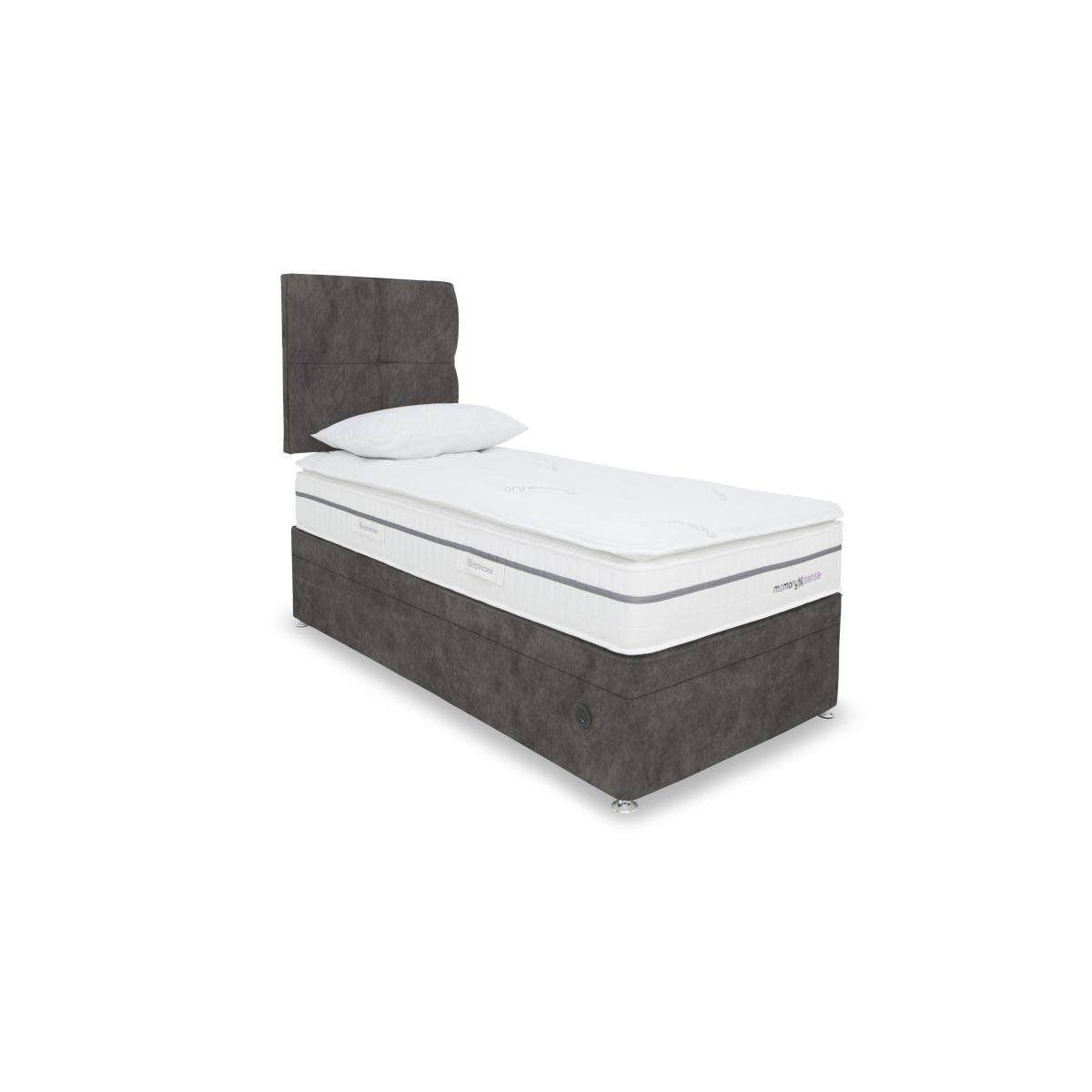 If you sleep better on cushioning, cocooning memory foam but worry about getting too hot at night, a bed or mattress from our Sleepeezee Memory Sense collection is going to be perfect for you. These pocket spring mattresses feature a unique type of ultra-comfortable memory foam infused with graphite that helps disperse body heat. Mattress covers are made with Oxysnse, a material that’s designed to increase your body’s oxygen levels to reduce muscle fatigue, help prevent the risk of sleep apnea and facilitate deeper sleep. Choose a medium or ortho firm feel mattress and pair it with a divan base with optional storage space. The Sleepeezee Memory Sense is exclusive to Furniture Village. Make life easy with this power ottoman divan set. As well as spacious, easy-lift storage, you’ll love the pocket spring mattress that’s designed to keep you cool and comfortable. Why you'll love it Refreshing sleep is yours with this Memory Sense 2300 power ottoman divan set. Mattress has individually pocketed springs for personalised medium-feel support. Layer of graphite-infused memory foam takes heat away from the body. Moulds to the shape of your body for excellent pressure relief. Helps distribute weight more evenly for better circulation. With an Oxysense cover which increases the body’s oxygen levels. Reduces muscle fatigue, helps prevent the risk of sleep apnea and facilitates deep sleep. Encapsulated edge-to-edge support helps prevent roll off. No turning required. With handles to make rotating easier. Hypoallergenic. Power ottoman base – all the storage, none of the lifting. Beautiful upholstered in a wide choice of fabrics. Made by hand in the UK and only at Furniture Village. This power ottoman divan set is part of our Sleepeezee Memory Sense 2300 range. What you need to know Mattress type: Pocket spring. Depth: 29 cm. Weight:Single 26 kg, small double 33 kg, double 38 kg, king 42 kg and super king 50 kg. Firmness: Medium. Springs: 2,300 in king size. Pillow top: No. Fillings: Polyester-encapsulated border, graphite memory foam. Cover: Oxysense fabric. Requires turning: No. Base type: Platform top with electric-powered end-ottoman storage. Sizes: Single, small double, double, king and super king. Mattress care:Air for 4 hours before using to remove any odour. Indentations caused by settlement of fillings or body weight are normal and are not considered defects. If used on a slatted bed frame, the space between slats must be no wider than 7.5 cm. Spaces wider than this may cause excess dipping of the mattress and invalidate the guarantee. Always use a mattress protector. Rotate regularly. Divan base care: Clean upholstery weekly using a soft brush or vacuum with the curtain attachment. Professional cleaning advised for oil- and grease-based stains. Some fabrics can show wear on areas of more use or in direct sunlight. The ottoman base is powered by mains electricity. Please ensure that you will be able to connect it to a power source before ordering.
