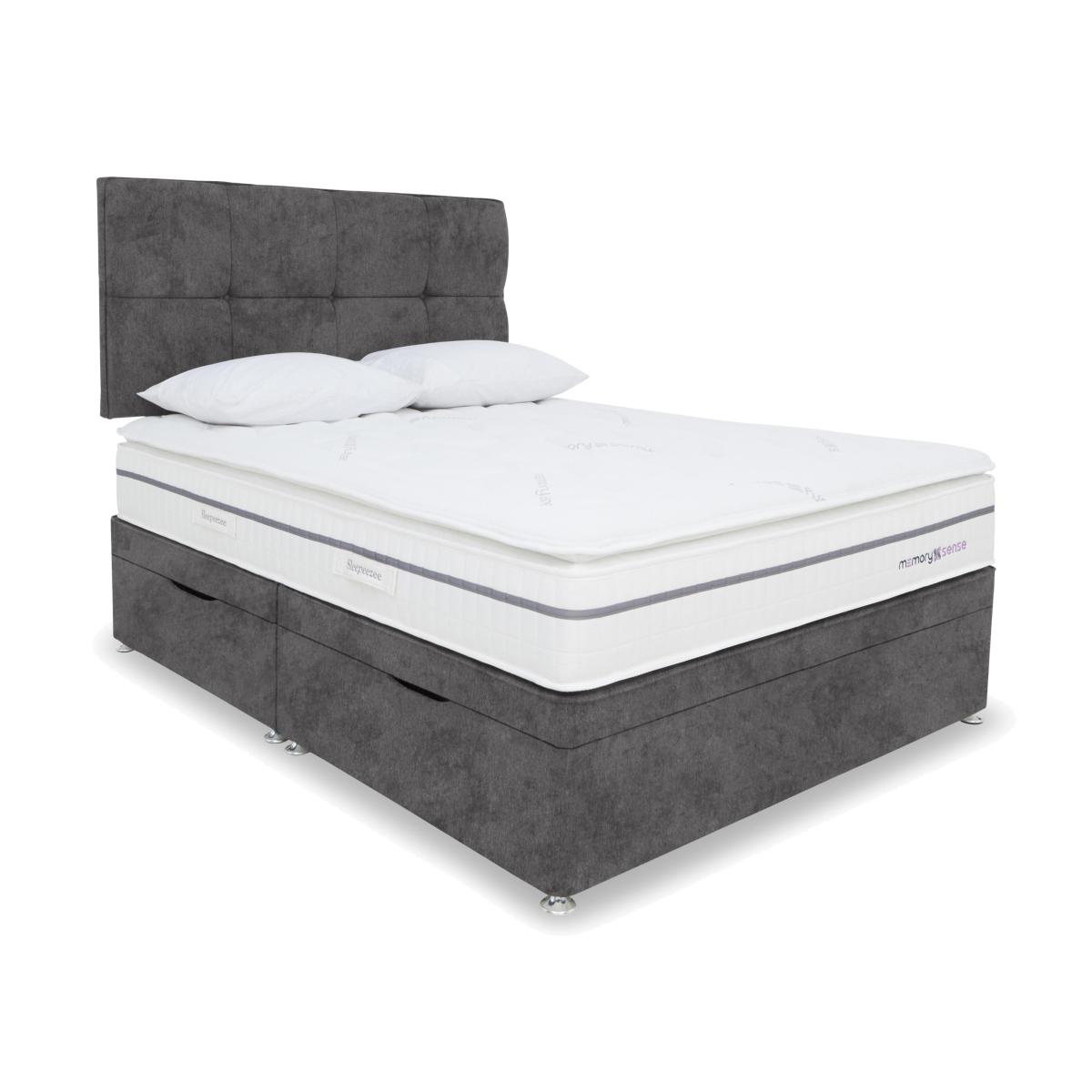 If you sleep better on cushioning, cocooning memory foam but worry about getting too hot at night, a bed or mattress from our Sleepeezee Memory Sense collection is going to be perfect for you. These pocket spring mattresses feature a unique type of ultra-comfortable memory foam infused with graphite that helps disperse body heat. Mattress covers are made with Oxysnse, a material that’s designed to increase your body’s oxygen levels to reduce muscle fatigue, help prevent the risk of sleep apnea and facilitate deeper sleep. Choose a medium or ortho firm feel mattress and pair it with a divan base with optional storage space. The Sleepeezee Memory Sense is exclusive to Furniture Village. This space-saving ottoman divan set also keeps you cool and comfortable all night long, thanks to the mattress’s heat-dispersing memory foam layer and Oxysense cover. Why you'll love it Refreshing sleep is yours with this Memory Sense 2300 ottoman divan set. Mattress has individually pocketed springs for personalised medium-feel support. Layer of graphite-infused memory foam takes heat away from the body. Moulds to the shape of your body for excellent pressure relief. Helps distribute weight more evenly for better circulation. With an Oxysense cover which increases the body’s oxygen levels. Reduces muscle fatigue, helps prevent the risk of sleep apnea and facilitates deep sleep. Encapsulated edge-to-edge support helps prevent roll off. No turning required. With handles to make rotating easier. Hypoallergenic. Beautiful upholstered ottoman storage base. Wide choice of fabrics. Made by hand in the UK and only at Furniture Village. This side ottoman divan set is part of our Sleepeezee Memory Sense 2300 range. What you need to know Mattress type: Pocket spring. Depth: 29 cm. Weight:Single 26 kg, small double 33 kg, double 38 kg, king 42 kg and super king 50 kg. Firmness: Medium. Springs: 2,300 in king size. Pillow top: No. Fillings: Polyester-encapsulated border, graphite memory foam. Cover: Oxysense fabric. Requires turning: No. Base type: Platform top with side-ottoman storage. Sizes: Single, small double, double, king and super king. Mattress care:Air for 4 hours before using to remove any odour. Indentations caused by settlement of fillings or body weight are normal and are not considered defects. If used on a slatted bed frame, the space between slats must be no wider than 7.5 cm. Spaces wider than this may cause excess dipping of the mattress and invalidate the guarantee. Always use a mattress protector. Rotate regularly. Divan base care: Clean upholstery weekly using a soft brush or vacuum with the curtain attachment. Professional cleaning advised for oil- and grease-based stains. Some fabrics can show wear on areas of more use or in direct sunlight.