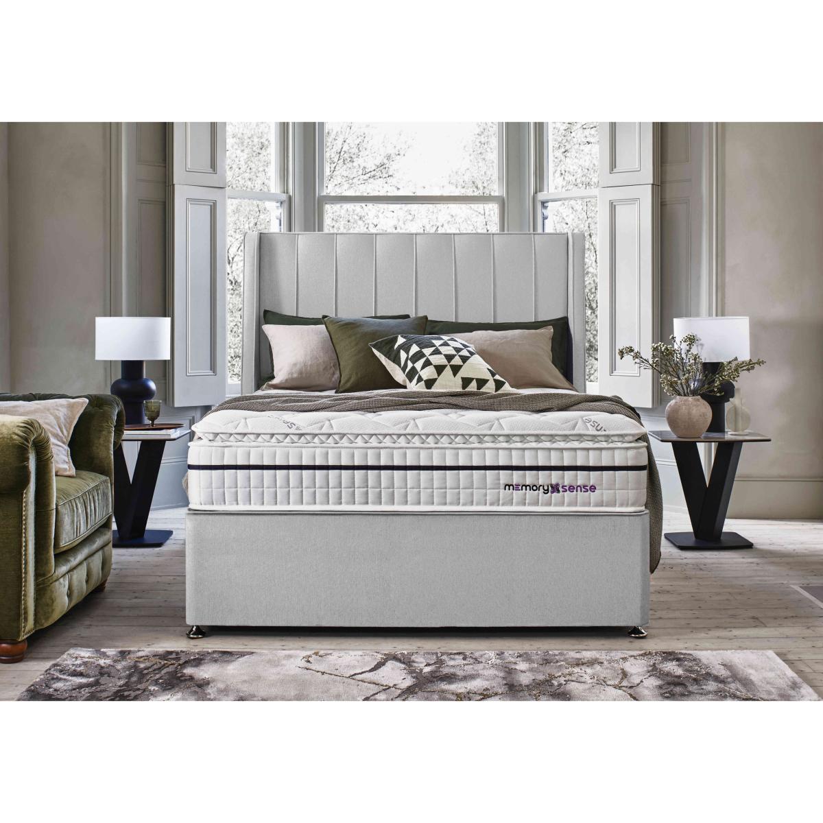 If you sleep better on cushioning, cocooning memory foam but worry about getting too hot at night, a bed or mattress from our Sleepeezee Memory Sense collection is going to be perfect for you. These pocket spring mattresses feature a unique type of ultra-comfortable memory foam infused with graphite that helps disperse body heat. Mattress covers are made with Oxysnse, a material that’s designed to increase your body’s oxygen levels to reduce muscle fatigue, help prevent the risk of sleep apnea and facilitate deeper sleep. Choose a medium or ortho firm feel mattress and pair it with a divan base with optional storage space. The Sleepeezee Memory Sense is exclusive to Furniture Village. This Sleepeezee divan set ticks all the boxes. Beautifully upholstered with optional storage, it comes complete with a superb pocket spring and memory foam mattress with cooling comfort built in. Why you'll love it Revitalising sleep is yours with this Memory Sense 2800 divan set. Mattress has individually pocketed springs for superb, body-responsive medium-feel support. Layer of graphite-infused memory foam takes heat away from the body. Moulds to the shape of your body for excellent pressure relief. Helps distribute weight more evenly for better circulation. With an Oxysense cover which increases the body’s oxygen levels. Reduces muscle fatigue, helps prevent the risk of sleep apnea and facilitates deep sleep. Encapsulated edge-to-edge support helps prevent roll off. No turning required. With handles to make rotating easier. Hypoallergenic. Beautiful upholstered base with optional storage drawers. Wide choice of fabrics. Made by hand in the UK and only at Furniture Village. This divan set is part of our Sleepeezee Memory Sense 2800 range. What you need to know Mattress type: Pocket spring. Depth: 30 cm. Weight:Single 28 kg, small double 35 kg, double 41 kg, king 45 kg and super king 54 kg. Firmness: Medium. Springs: 2,800 in king size. Pillow top: No. Fillings: Polyester-encapsulated border, graphite memory foam. Cover: Oxysense fabric. Requires turning: No. Base type: Platform top with optional storage drawers. Sizes:Single, small double, double, king and super king. Mattress care:Air for 4 hours before using to remove any odour. Indentations caused by settlement of fillings or body weight are normal and are not considered defects. If used on a slatted bed frame, the space between slats must be no wider than 7.5 cm. Spaces wider than this may cause excess dipping of the mattress and invalidate the guarantee. Always use a mattress protector. Rotate regularly. Divan base care: Clean upholstery weekly using a soft brush or vacuum with the curtain attachment. Professional cleaning advised for oil- and grease-based stains. Some fabrics can show wear on areas of more use or in direct sunlight.