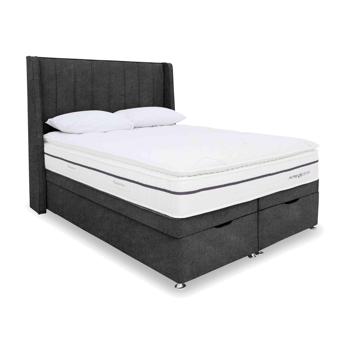 If you sleep better on cushioning, cocooning memory foam but worry about getting too hot at night, a bed or mattress from our Sleepeezee Memory Sense collection is going to be perfect for you. These pocket spring mattresses feature a unique type of ultra-comfortable memory foam infused with graphite that helps disperse body heat. Mattress covers are made with Oxysnse, a material that’s designed to increase your body’s oxygen levels to reduce muscle fatigue, help prevent the risk of sleep apnea and facilitate deeper sleep. Choose a medium or ortho firm feel mattress and pair it with a divan base with optional storage space. The Sleepeezee Memory Sense is exclusive to Furniture Village. If you need more bedroom storage, here’s your divan set. Handmade by Sleepeezee, it features roomy end-opening storage and a luxurious pocket spring mattress with built-in cooling technology. Why you'll love it Revitalising sleep is yours with this Memory Sense 2800 ottoman divan set. Mattress has individually pocketed springs for superb, body-responsive medium-feel support. Layer of graphite-infused memory foam takes heat away from the body. Moulds to the shape of your body for excellent pressure relief. Helps distribute weight more evenly for better circulation. With an Oxysense cover which increases the body’s oxygen levels. Reduces muscle fatigue, helps prevent the risk of sleep apnea and facilitates deep sleep. Encapsulated edge-to-edge support helps prevent roll off. No turning required. With handles to make rotating easier. Hypoallergenic. Beautiful upholstered ottoman storage base. Wide choice of fabrics. Made by hand in the UK and only at Furniture Village. This end ottoman divan set is part of our Sleepeezee Memory Sense 2800 range. What you need to know Mattress type: Pocket spring. Depth: 30 cm. Weight:Single 28 kg, small double 35 kg, double 41 kg, king 45 kg and super king 54 kg. Firmness: Medium. Springs: 2,800 in king size. Pillow top: No. Fillings: Polyester-encapsulated border, graphite memory foam. Cover: Oxysense fabric. Requires turning: No. Base type: Platform top with end-ottoman storage. Sizes: Single, small double, double, king and super king. Mattress care:Air for 4 hours before using to remove any odour. Indentations caused by settlement of fillings or body weight are normal and are not considered defects. If used on a slatted bed frame, the space between slats must be no wider than 7.5 cm. Spaces wider than this may cause excess dipping of the mattress and invalidate the guarantee. Always use a mattress protector. Rotate regularly. Divan base care: Clean upholstery weekly using a soft brush or vacuum with the curtain attachment. Professional cleaning advised for oil- and grease-based stains. Some fabrics can show wear on areas of more use or in direct sunlight.