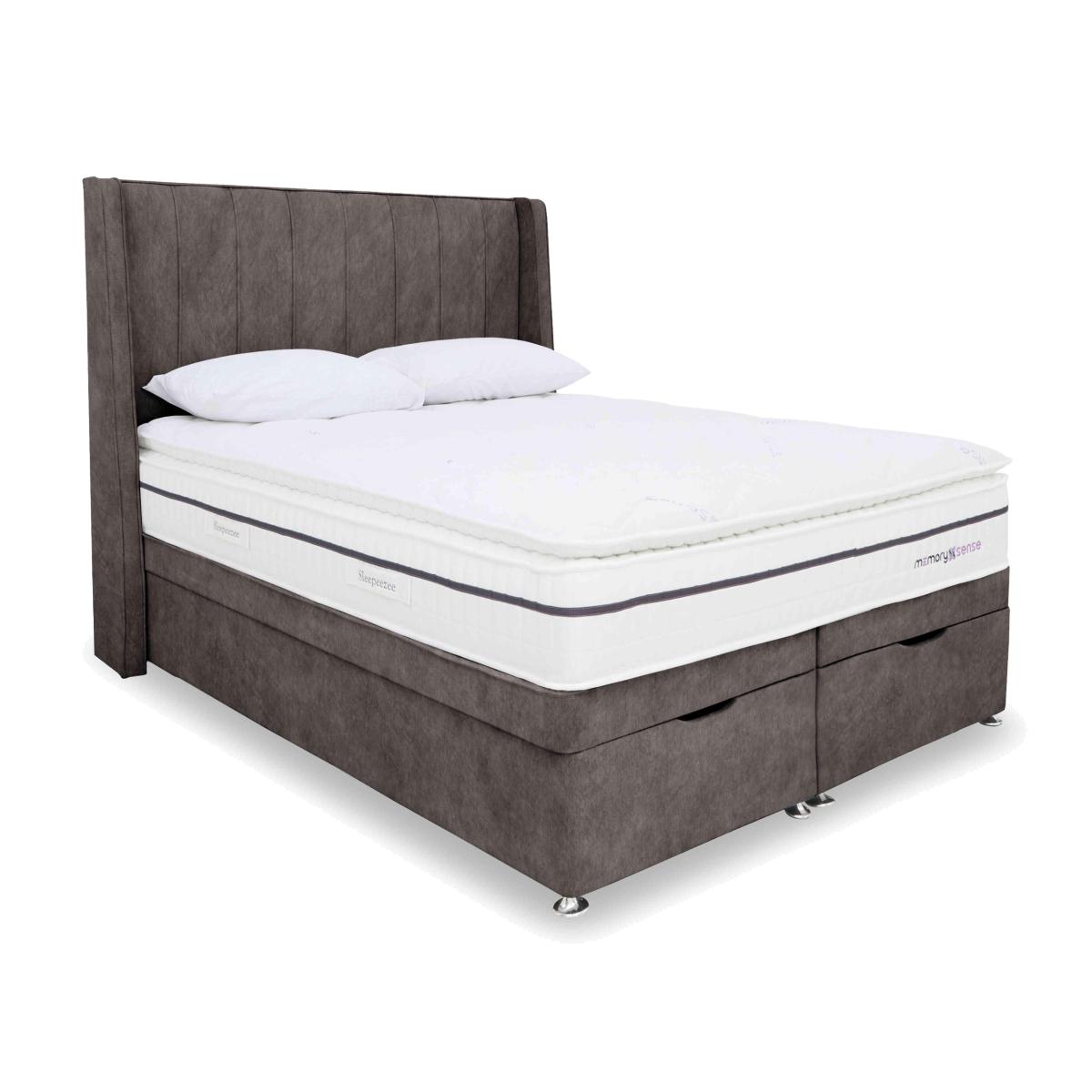 If you sleep better on cushioning, cocooning memory foam but worry about getting too hot at night, a bed or mattress from our Sleepeezee Memory Sense collection is going to be perfect for you. These pocket spring mattresses feature a unique type of ultra-comfortable memory foam infused with graphite that helps disperse body heat. Mattress covers are made with Oxysnse, a material that’s designed to increase your body’s oxygen levels to reduce muscle fatigue, help prevent the risk of sleep apnea and facilitate deeper sleep. Choose a medium or ortho firm feel mattress and pair it with a divan base with optional storage space. The Sleepeezee Memory Sense is exclusive to Furniture Village. If you need more bedroom storage, here’s your divan set. Handmade by Sleepeezee, it features roomy end-opening storage and a luxurious pocket spring mattress with built-in cooling technology. Why you'll love it Revitalising sleep is yours with this Memory Sense 2800 ottoman divan set. Mattress has individually pocketed springs for superb, body-responsive medium-feel support. Layer of graphite-infused memory foam takes heat away from the body. Moulds to the shape of your body for excellent pressure relief. Helps distribute weight more evenly for better circulation. With an Oxysense cover which increases the body’s oxygen levels. Reduces muscle fatigue, helps prevent the risk of sleep apnea and facilitates deep sleep. Encapsulated edge-to-edge support helps prevent roll off. No turning required. With handles to make rotating easier. Hypoallergenic. Beautiful upholstered ottoman storage base. Wide choice of fabrics. Made by hand in the UK and only at Furniture Village. This end ottoman divan set is part of our Sleepeezee Memory Sense 2800 range. What you need to know Mattress type: Pocket spring. Depth: 30 cm. Weight:Single 28 kg, small double 35 kg, double 41 kg, king 45 kg and super king 54 kg. Firmness: Medium. Springs: 2,800 in king size. Pillow top: No. Fillings: Polyester-encapsulated border, graphite memory foam. Cover: Oxysense fabric. Requires turning: No. Base type: Platform top with end-ottoman storage. Sizes: Single, small double, double, king and super king. Mattress care:Air for 4 hours before using to remove any odour. Indentations caused by settlement of fillings or body weight are normal and are not considered defects. If used on a slatted bed frame, the space between slats must be no wider than 7.5 cm. Spaces wider than this may cause excess dipping of the mattress and invalidate the guarantee. Always use a mattress protector. Rotate regularly. Divan base care: Clean upholstery weekly using a soft brush or vacuum with the curtain attachment. Professional cleaning advised for oil- and grease-based stains. Some fabrics can show wear on areas of more use or in direct sunlight.