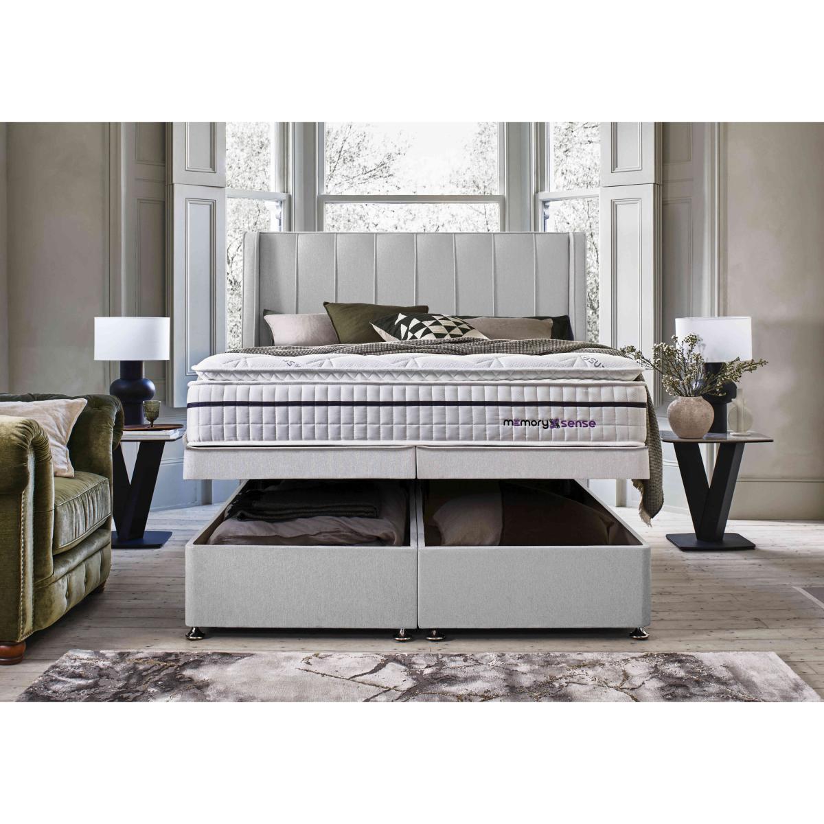 If you sleep better on cushioning, cocooning memory foam but worry about getting too hot at night, a bed or mattress from our Sleepeezee Memory Sense collection is going to be perfect for you. These pocket spring mattresses feature a unique type of ultra-comfortable memory foam infused with graphite that helps disperse body heat. Mattress covers are made with Oxysnse, a material that’s designed to increase your body’s oxygen levels to reduce muscle fatigue, help prevent the risk of sleep apnea and facilitate deeper sleep. Choose a medium or ortho firm feel mattress and pair it with a divan base with optional storage space. The Sleepeezee Memory Sense is exclusive to Furniture Village. Power up your comfort with this fabulous Sleepeezee power ottoman divan set. There's no heavy lifting for you and you’ll love the accompanying cooling pocket spring mattress. Why you'll love it Revitalising sleep is yours with this Memory Sense 2800 power ottoman divan set. Mattress has individually pocketed springs for superb, body-responsive medium-feel support. Layer of graphite-infused memory foam takes heat away from the body. Moulds to the shape of your body for excellent pressure relief. Helps distribute weight more evenly for better circulation. With an Oxysense cover which increases the body’s oxygen levels. Reduces muscle fatigue, helps prevent the risk of sleep apnea and facilitates deep sleep. Encapsulated edge-to-edge support helps prevent roll off. No turning required. With handles to make rotating easier. Hypoallergenic. Power ottoman base – all the storage, none of the lifting. Beautiful upholstered in a wide choice of fabrics. Made by hand in the UK and only at Furniture Village. This power ottoman divan set is part of our Sleepeezee Memory Sense 2800 range. What you need to know Mattress type: Pocket spring. Depth: 30 cm. Weight:Single 28 kg, small double 35 kg, double 41 kg, king 45 kg and super king 54 kg. Firmness: Medium. Springs: 2,800 in king size. Pillow top: No. Fillings: Polyester-encapsulated border, graphite memory foam. Cover: Oxysense fabric. Requires turning: No. Base type: Platform top with electric-powered end-ottoman storage. Sizes: Single, small double, double, king and super king. Mattress care:Air for 4 hours before using to remove any odour. Indentations caused by settlement of fillings or body weight are normal and are not considered defects. If used on a slatted bed frame, the space between slats must be no wider than 7.5 cm. Spaces wider than this may cause excess dipping of the mattress and invalidate the guarantee. Always use a mattress protector. Rotate regularly. Divan base care: Clean upholstery weekly using a soft brush or vacuum with the curtain attachment. Professional cleaning advised for oil- and grease-based stains. Some fabrics can show wear on areas of more use or in direct sunlight. The ottoman base is powered by mains electricity. Please ensure that you will be able to connect it to a power source before ordering.