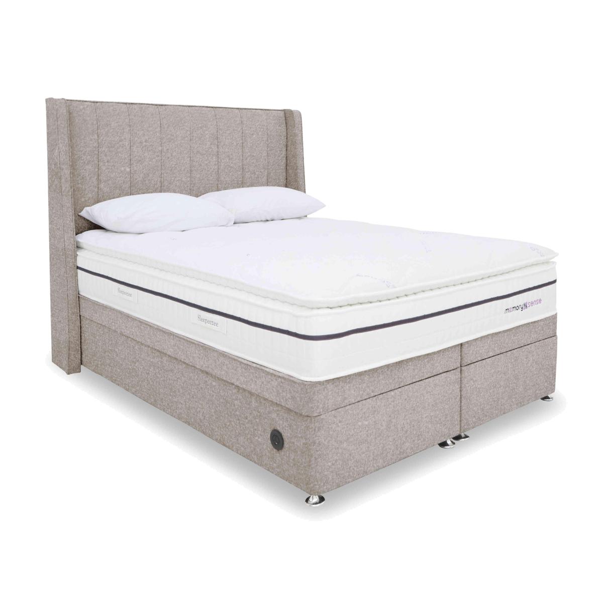 If you sleep better on cushioning, cocooning memory foam but worry about getting too hot at night, a bed or mattress from our Sleepeezee Memory Sense collection is going to be perfect for you. These pocket spring mattresses feature a unique type of ultra-comfortable memory foam infused with graphite that helps disperse body heat. Mattress covers are made with Oxysnse, a material that’s designed to increase your body’s oxygen levels to reduce muscle fatigue, help prevent the risk of sleep apnea and facilitate deeper sleep. Choose a medium or ortho firm feel mattress and pair it with a divan base with optional storage space. The Sleepeezee Memory Sense is exclusive to Furniture Village. Power up your comfort with this fabulous Sleepeezee power ottoman divan set. There's no heavy lifting for you and you’ll love the accompanying cooling pocket spring mattress. Why you'll love it Revitalising sleep is yours with this Memory Sense 2800 power ottoman divan set. Mattress has individually pocketed springs for superb, body-responsive medium-feel support. Layer of graphite-infused memory foam takes heat away from the body. Moulds to the shape of your body for excellent pressure relief. Helps distribute weight more evenly for better circulation. With an Oxysense cover which increases the body’s oxygen levels. Reduces muscle fatigue, helps prevent the risk of sleep apnea and facilitates deep sleep. Encapsulated edge-to-edge support helps prevent roll off. No turning required. With handles to make rotating easier. Hypoallergenic. Power ottoman base – all the storage, none of the lifting. Beautiful upholstered in a wide choice of fabrics. Made by hand in the UK and only at Furniture Village. This power ottoman divan set is part of our Sleepeezee Memory Sense 2800 range. What you need to know Mattress type: Pocket spring. Depth: 30 cm. Weight:Single 28 kg, small double 35 kg, double 41 kg, king 45 kg and super king 54 kg. Firmness: Medium. Springs: 2,800 in king size. Pillow top: No. Fillings: Polyester-encapsulated border, graphite memory foam. Cover: Oxysense fabric. Requires turning: No. Base type: Platform top with electric-powered end-ottoman storage. Sizes: Single, small double, double, king and super king. Mattress care:Air for 4 hours before using to remove any odour. Indentations caused by settlement of fillings or body weight are normal and are not considered defects. If used on a slatted bed frame, the space between slats must be no wider than 7.5 cm. Spaces wider than this may cause excess dipping of the mattress and invalidate the guarantee. Always use a mattress protector. Rotate regularly. Divan base care: Clean upholstery weekly using a soft brush or vacuum with the curtain attachment. Professional cleaning advised for oil- and grease-based stains. Some fabrics can show wear on areas of more use or in direct sunlight. The ottoman base is powered by mains electricity. Please ensure that you will be able to connect it to a power source before ordering.