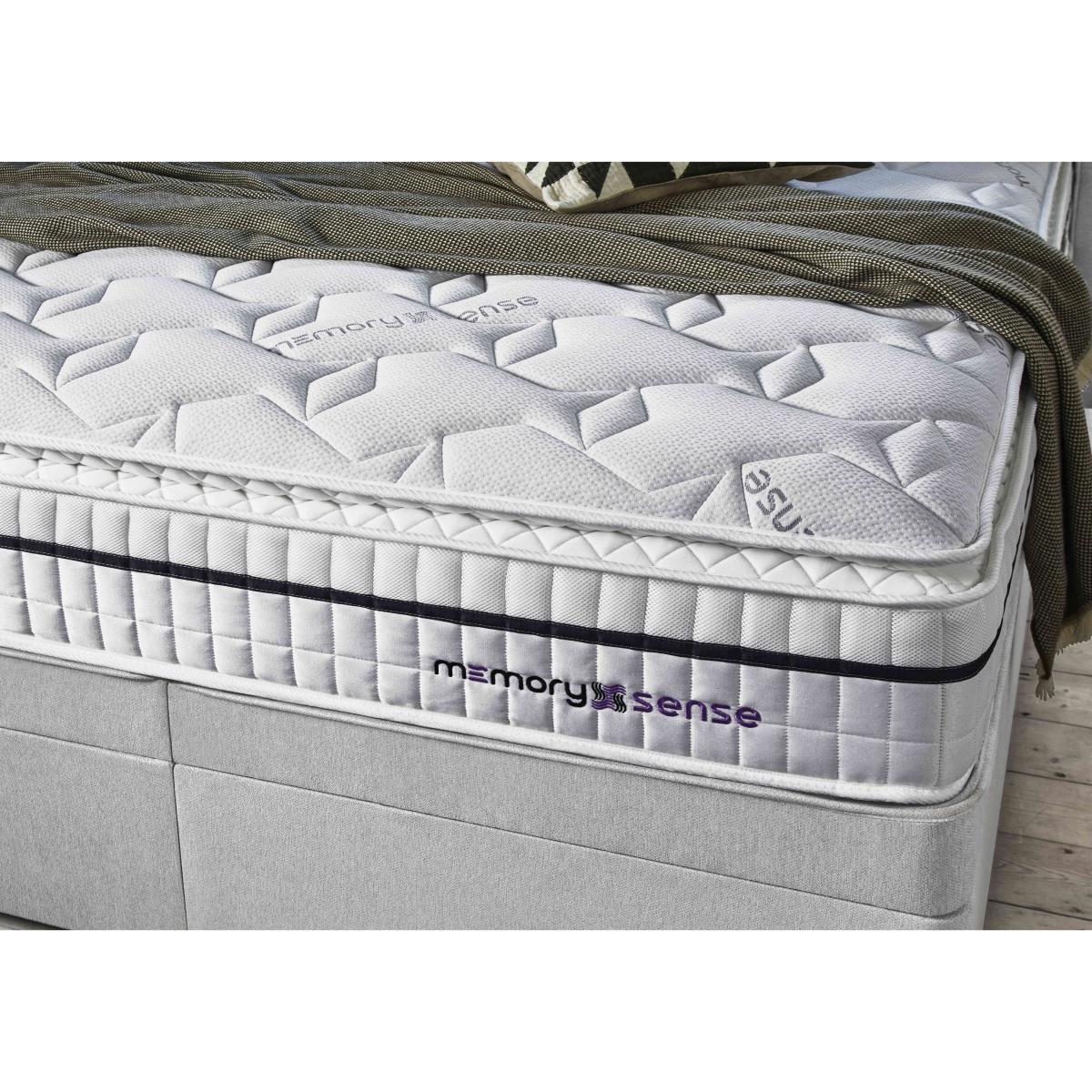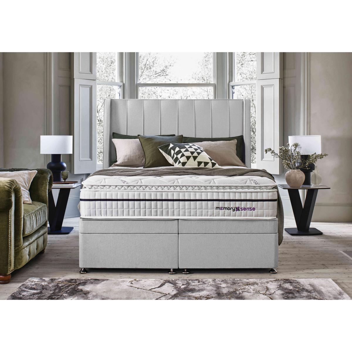 If you sleep better on cushioning, cocooning memory foam but worry about getting too hot at night, a bed or mattress from our Sleepeezee Memory Sense collection is going to be perfect for you. These pocket spring mattresses feature a unique type of ultra-comfortable memory foam infused with graphite that helps disperse body heat. Mattress covers are made with Oxysnse, a material that’s designed to increase your body’s oxygen levels to reduce muscle fatigue, help prevent the risk of sleep apnea and facilitate deeper sleep. Choose a medium or ortho firm feel mattress and pair it with a divan base with optional storage space. The Sleepeezee Memory Sense is exclusive to Furniture Village. Power up your comfort with this fabulous Sleepeezee power ottoman divan set. There's no heavy lifting for you and you’ll love the accompanying cooling pocket spring mattress. Why you'll love it Revitalising sleep is yours with this Memory Sense 2800 power ottoman divan set. Mattress has individually pocketed springs for superb, body-responsive medium-feel support. Layer of graphite-infused memory foam takes heat away from the body. Moulds to the shape of your body for excellent pressure relief. Helps distribute weight more evenly for better circulation. With an Oxysense cover which increases the body’s oxygen levels. Reduces muscle fatigue, helps prevent the risk of sleep apnea and facilitates deep sleep. Encapsulated edge-to-edge support helps prevent roll off. No turning required. With handles to make rotating easier. Hypoallergenic. Power ottoman base – all the storage, none of the lifting. Beautiful upholstered in a wide choice of fabrics. Made by hand in the UK and only at Furniture Village. This power ottoman divan set is part of our Sleepeezee Memory Sense 2800 range. What you need to know Mattress type: Pocket spring. Depth: 30 cm. Weight:Single 28 kg, small double 35 kg, double 41 kg, king 45 kg and super king 54 kg. Firmness: Medium. Springs: 2,800 in king size. Pillow top: No. Fillings: Polyester-encapsulated border, graphite memory foam. Cover: Oxysense fabric. Requires turning: No. Base type: Platform top with electric-powered end-ottoman storage. Sizes: Single, small double, double, king and super king. Mattress care:Air for 4 hours before using to remove any odour. Indentations caused by settlement of fillings or body weight are normal and are not considered defects. If used on a slatted bed frame, the space between slats must be no wider than 7.5 cm. Spaces wider than this may cause excess dipping of the mattress and invalidate the guarantee. Always use a mattress protector. Rotate regularly. Divan base care: Clean upholstery weekly using a soft brush or vacuum with the curtain attachment. Professional cleaning advised for oil- and grease-based stains. Some fabrics can show wear on areas of more use or in direct sunlight. The ottoman base is powered by mains electricity. Please ensure that you will be able to connect it to a power source before ordering.