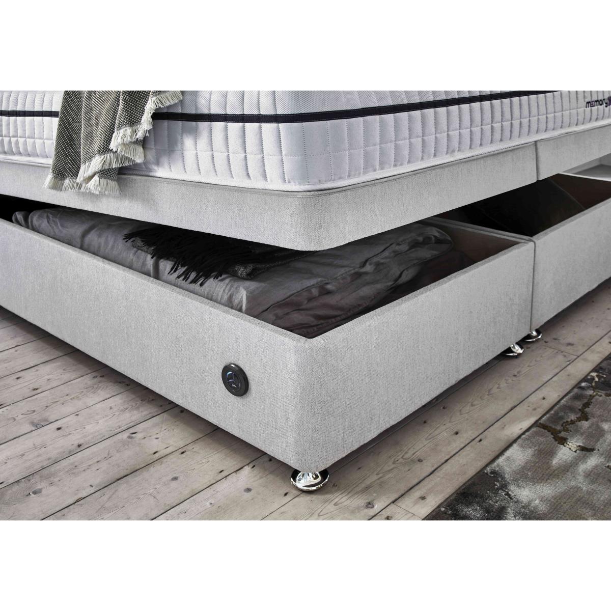 If you sleep better on cushioning, cocooning memory foam but worry about getting too hot at night, a bed or mattress from our Sleepeezee Memory Sense collection is going to be perfect for you. These pocket spring mattresses feature a unique type of ultra-comfortable memory foam infused with graphite that helps disperse body heat. Mattress covers are made with Oxysnse, a material that’s designed to increase your body’s oxygen levels to reduce muscle fatigue, help prevent the risk of sleep apnea and facilitate deeper sleep. Choose a medium or ortho firm feel mattress and pair it with a divan base with optional storage space. The Sleepeezee Memory Sense is exclusive to Furniture Village. Power up your comfort with this fabulous Sleepeezee power ottoman divan set. There's no heavy lifting for you and you’ll love the accompanying cooling pocket spring mattress. Why you'll love it Revitalising sleep is yours with this Memory Sense 2800 power ottoman divan set. Mattress has individually pocketed springs for superb, body-responsive medium-feel support. Layer of graphite-infused memory foam takes heat away from the body. Moulds to the shape of your body for excellent pressure relief. Helps distribute weight more evenly for better circulation. With an Oxysense cover which increases the body’s oxygen levels. Reduces muscle fatigue, helps prevent the risk of sleep apnea and facilitates deep sleep. Encapsulated edge-to-edge support helps prevent roll off. No turning required. With handles to make rotating easier. Hypoallergenic. Power ottoman base – all the storage, none of the lifting. Beautiful upholstered in a wide choice of fabrics. Made by hand in the UK and only at Furniture Village. This power ottoman divan set is part of our Sleepeezee Memory Sense 2800 range. What you need to know Mattress type: Pocket spring. Depth: 30 cm. Weight:Single 28 kg, small double 35 kg, double 41 kg, king 45 kg and super king 54 kg. Firmness: Medium. Springs: 2,800 in king size. Pillow top: No. Fillings: Polyester-encapsulated border, graphite memory foam. Cover: Oxysense fabric. Requires turning: No. Base type: Platform top with electric-powered end-ottoman storage. Sizes: Single, small double, double, king and super king. Mattress care:Air for 4 hours before using to remove any odour. Indentations caused by settlement of fillings or body weight are normal and are not considered defects. If used on a slatted bed frame, the space between slats must be no wider than 7.5 cm. Spaces wider than this may cause excess dipping of the mattress and invalidate the guarantee. Always use a mattress protector. Rotate regularly. Divan base care: Clean upholstery weekly using a soft brush or vacuum with the curtain attachment. Professional cleaning advised for oil- and grease-based stains. Some fabrics can show wear on areas of more use or in direct sunlight. The ottoman base is powered by mains electricity. Please ensure that you will be able to connect it to a power source before ordering.