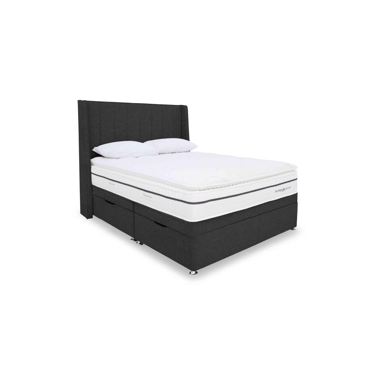 If you sleep better on cushioning, cocooning memory foam but worry about getting too hot at night, a bed or mattress from our Sleepeezee Memory Sense collection is going to be perfect for you. These pocket spring mattresses feature a unique type of ultra-comfortable memory foam infused with graphite that helps disperse body heat. Mattress covers are made with Oxysnse, a material that’s designed to increase your body’s oxygen levels to reduce muscle fatigue, help prevent the risk of sleep apnea and facilitate deeper sleep. Choose a medium or ortho firm feel mattress and pair it with a divan base with optional storage space. The Sleepeezee Memory Sense is exclusive to Furniture Village. We’ve paired this fabulous pocket spring and cooling memory foam mattress with a spacious and practical side-opening ottoman divan base. Only at Furniture Village. Why you'll love it Revitalising sleep is yours with this Memory Sense 2800 ottoman divan set. Mattress has individually pocketed springs for superb, body-responsive medium-feel support. Layer of graphite-infused memory foam takes heat away from the body. Moulds to the shape of your body for excellent pressure relief. Helps distribute weight more evenly for better circulation. With an Oxysense cover which increases the body’s oxygen levels. Reduces muscle fatigue, helps prevent the risk of sleep apnea and facilitates deep sleep. Encapsulated edge-to-edge support helps prevent roll off. No turning required. With handles to make rotating easier. Hypoallergenic. Beautiful upholstered ottoman storage base. Wide choice of fabrics. Made by hand in the UK and only at Furniture Village. This side ottoman divan set is part of our Sleepeezee Memory Sense 2800 range. What you need to know Mattress type: Pocket spring. Depth: 30 cm. Weight:Single 28 kg, small double 35 kg, double 41 kg, king 45 kg and super king 54 kg. Firmness: Medium. Springs: 2,800 in king size. Pillow top: No. Fillings: Polyester-encapsulated border, graphite memory foam. Cover: Oxysense fabric. Requires turning: No. Base type: Platform top with side-ottoman storage. Sizes: Single, small double, double, king and super king. Mattress care:Air for 4 hours before using to remove any odour. Indentations caused by settlement of fillings or body weight are normal and are not considered defects. If used on a slatted bed frame, the space between slats must be no wider than 7.5 cm. Spaces wider than this may cause excess dipping of the mattress and invalidate the guarantee. Always use a mattress protector. Rotate regularly. Divan base care: Clean upholstery weekly using a soft brush or vacuum with the curtain attachment. Professional cleaning advised for oil- and grease-based stains. Some fabrics can show wear on areas of more use or in direct sunlight.
