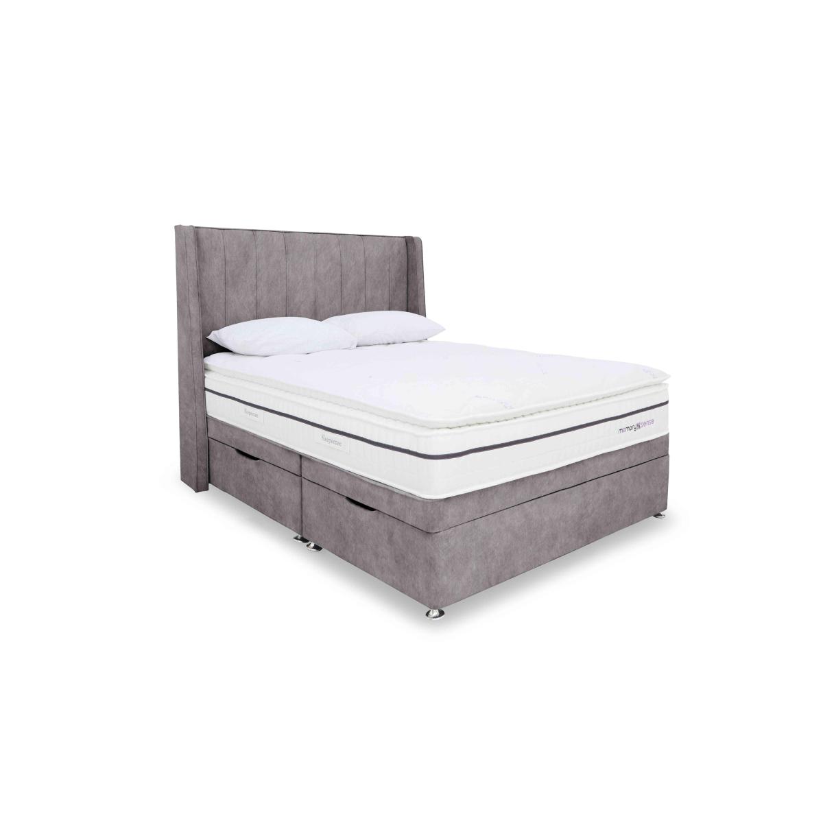 If you sleep better on cushioning, cocooning memory foam but worry about getting too hot at night, a bed or mattress from our Sleepeezee Memory Sense collection is going to be perfect for you. These pocket spring mattresses feature a unique type of ultra-comfortable memory foam infused with graphite that helps disperse body heat. Mattress covers are made with Oxysnse, a material that’s designed to increase your body’s oxygen levels to reduce muscle fatigue, help prevent the risk of sleep apnea and facilitate deeper sleep. Choose a medium or ortho firm feel mattress and pair it with a divan base with optional storage space. The Sleepeezee Memory Sense is exclusive to Furniture Village. We’ve paired this fabulous pocket spring and cooling memory foam mattress with a spacious and practical side-opening ottoman divan base. Only at Furniture Village. Why you'll love it Revitalising sleep is yours with this Memory Sense 2800 ottoman divan set. Mattress has individually pocketed springs for superb, body-responsive medium-feel support. Layer of graphite-infused memory foam takes heat away from the body. Moulds to the shape of your body for excellent pressure relief. Helps distribute weight more evenly for better circulation. With an Oxysense cover which increases the body’s oxygen levels. Reduces muscle fatigue, helps prevent the risk of sleep apnea and facilitates deep sleep. Encapsulated edge-to-edge support helps prevent roll off. No turning required. With handles to make rotating easier. Hypoallergenic. Beautiful upholstered ottoman storage base. Wide choice of fabrics. Made by hand in the UK and only at Furniture Village. This side ottoman divan set is part of our Sleepeezee Memory Sense 2800 range. What you need to know Mattress type: Pocket spring. Depth: 30 cm. Weight:Single 28 kg, small double 35 kg, double 41 kg, king 45 kg and super king 54 kg. Firmness: Medium. Springs: 2,800 in king size. Pillow top: No. Fillings: Polyester-encapsulated border, graphite memory foam. Cover: Oxysense fabric. Requires turning: No. Base type: Platform top with side-ottoman storage. Sizes: Single, small double, double, king and super king. Mattress care:Air for 4 hours before using to remove any odour. Indentations caused by settlement of fillings or body weight are normal and are not considered defects. If used on a slatted bed frame, the space between slats must be no wider than 7.5 cm. Spaces wider than this may cause excess dipping of the mattress and invalidate the guarantee. Always use a mattress protector. Rotate regularly. Divan base care: Clean upholstery weekly using a soft brush or vacuum with the curtain attachment. Professional cleaning advised for oil- and grease-based stains. Some fabrics can show wear on areas of more use or in direct sunlight.