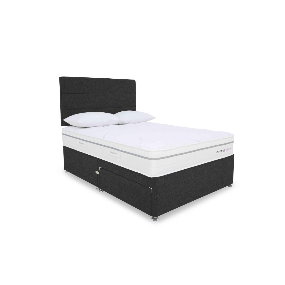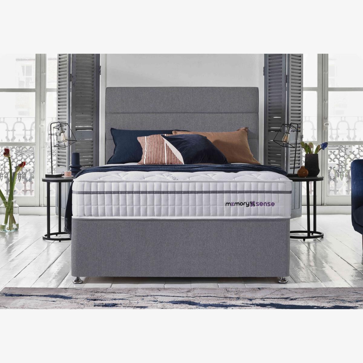If you sleep better on cushioning, cocooning memory foam but worry about getting too hot at night, a bed or mattress from our Sleepeezee Memory Sense collection is going to be perfect for you. These pocket spring mattresses feature a unique type of ultra-comfortable memory foam infused with graphite that helps disperse body heat. Mattress covers are made with Oxysnse, a material that’s designed to increase your body’s oxygen levels to reduce muscle fatigue, help prevent the risk of sleep apnea and facilitate deeper sleep. Choose a medium or ortho firm feel mattress and pair it with a divan base with optional storage space. The Sleepeezee Memory Sense is exclusive to Furniture Village. Enjoy firm-feel mattress comfort with cooling technology – including an Oxysense cover – plus a stylish divan base with optional storage drawers. By Sleepeezee. Why you'll love it Body-comforting sleep is yours with this Memory Sense Ortho divan set. Mattress has individually pocketed springs for that firm-mattress feel you love. Layer of graphite-infused memory foam takes heat away from the body. Moulds to the shape of your body for excellent pressure relief. Helps distribute weight more evenly for better circulation. With an Oxysense cover which increases the body’s oxygen levels. Reduces muscle fatigue, helps prevent the risk of sleep apnea and facilitates deep sleep. Encapsulated edge-to-edge support helps prevent roll off. No turning required. With handles to make rotating easier. Hypoallergenic. Beautiful upholstered base with optional storage drawers. Wide choice of fabrics. Made by hand in the UK and only at Furniture Village. This divan set is part of our Sleepeezee Memory Sense Ortho range. What you need to know Mattress type: Pocket spring. Depth: 28 cm. Weight:Single 22 kg, small double 28 kg, double 33 kg, king 36 kg and super king 43 kg. Firmness: Firm. Springs: 800 in king size. Pillow top: No. Fillings: Polyester-encapsulated border, graphite memory foam. Cover: Oxysense fabric. Requires turning: No. Base type: Platform top with optional storage drawers. Sizes:Single, small double, double, king and super king. Mattress care:Air for 4 hours before using to remove any odour. Indentations caused by settlement of fillings or body weight are normal and are not considered defects. If used on a slatted bed frame, the space between slats must be no wider than 7.5 cm. Spaces wider than this may cause excess dipping of the mattress and invalidate the guarantee. Always use a mattress protector. Rotate regularly. Divan base care: Clean upholstery weekly using a soft brush or vacuum with the curtain attachment. Professional cleaning advised for oil- and grease-based stains. Some fabrics can show wear on areas of more use or in direct sunlight.