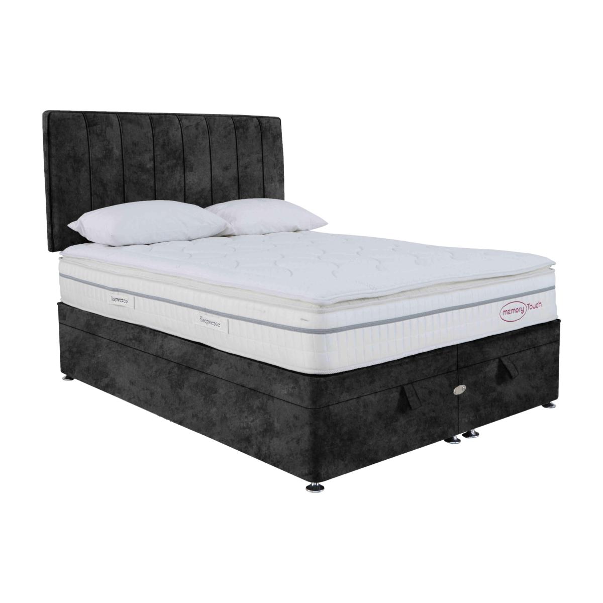 Style plus storage plus a fabulous night's sleep. It’s all yours with this beautifully tailored and wonderfully comfortable ottoman divan set with pillow top mattress. Only at Furniture Village. Why you’ll love it. Lovely divan set with sumptuous pillow top mattress and ottoman storage.. Mattress has 2200 individually-pocketed springs in king size for superior support.. Body-cushioning memory foam layers offer extra comfort.. Hypoallergenic fillings make it a good choice for allergy sufferers.. Large under bed storage space for duvets, pillows and clothing.. Huge choice of fabrics and colours for the divan base. Range also includes divan sets with optional storage drawers and side-lift ottoman.. Sleepeezee holds a Royal Warrant of Appointment granted by HRH The Prince of Wales.. Handcrafted in Britain and exclusive to Furniture Village. What you need to know. Headboard shown is available seperately.. Mattress type: Pocket spring.. Depth: 30 cm.. Firmness: Medium.. Springs: 2200 in king size.. Pillow top:Yes.. Fillings: Memory foam and soft white fibre.. Cover:Soft knit quilted fabric.. Requires turning: No.. Base type: Platform top. Sizes: Single, double, king, super king.. Mattress care:Air for 4 hours before using to remove any odour. Allow at least 4 hours for springs to settle and for mattress to attain its full size. Indentations caused by settlement of fillings or body weight are normal and are not considered defects. If used on a slatted bed frame, slats must be no more than 7 cm apart. Rotate regularly..