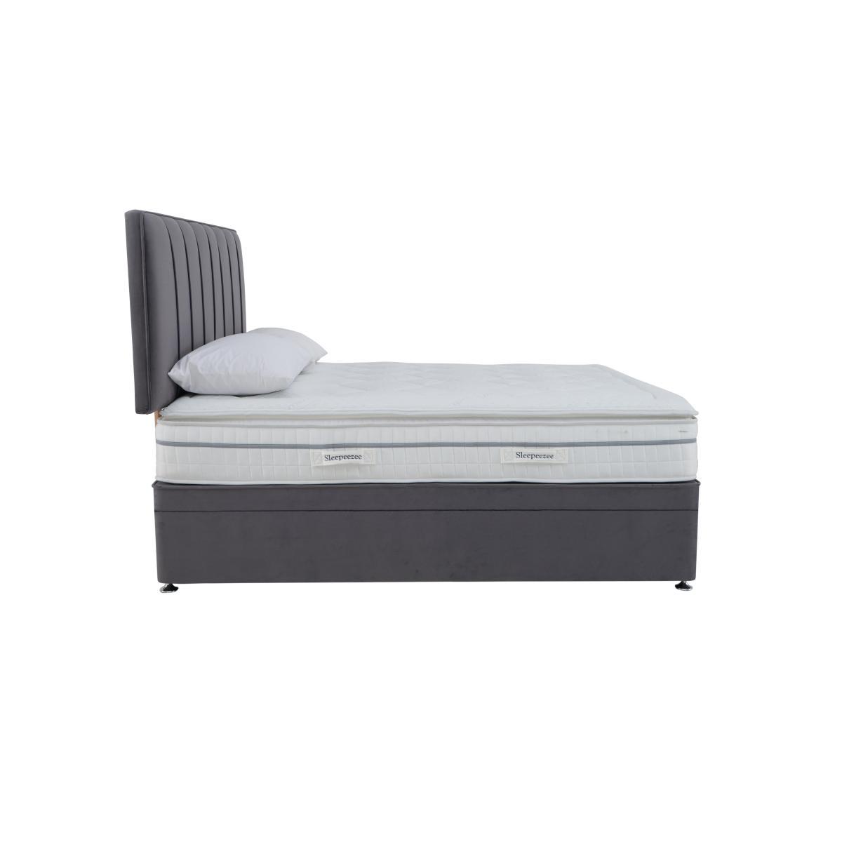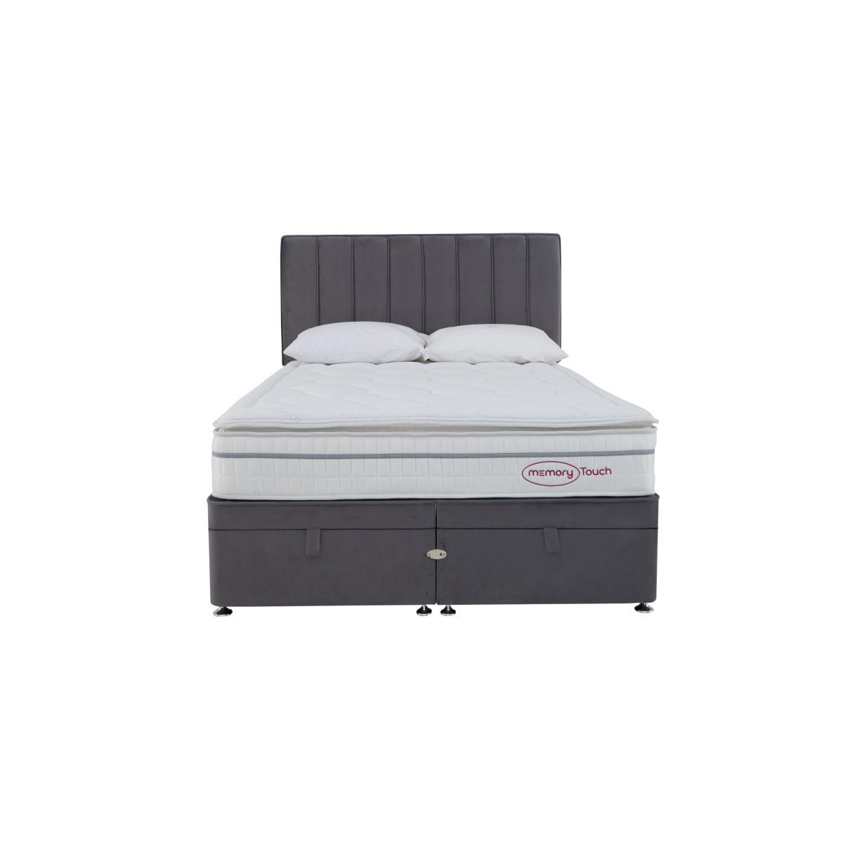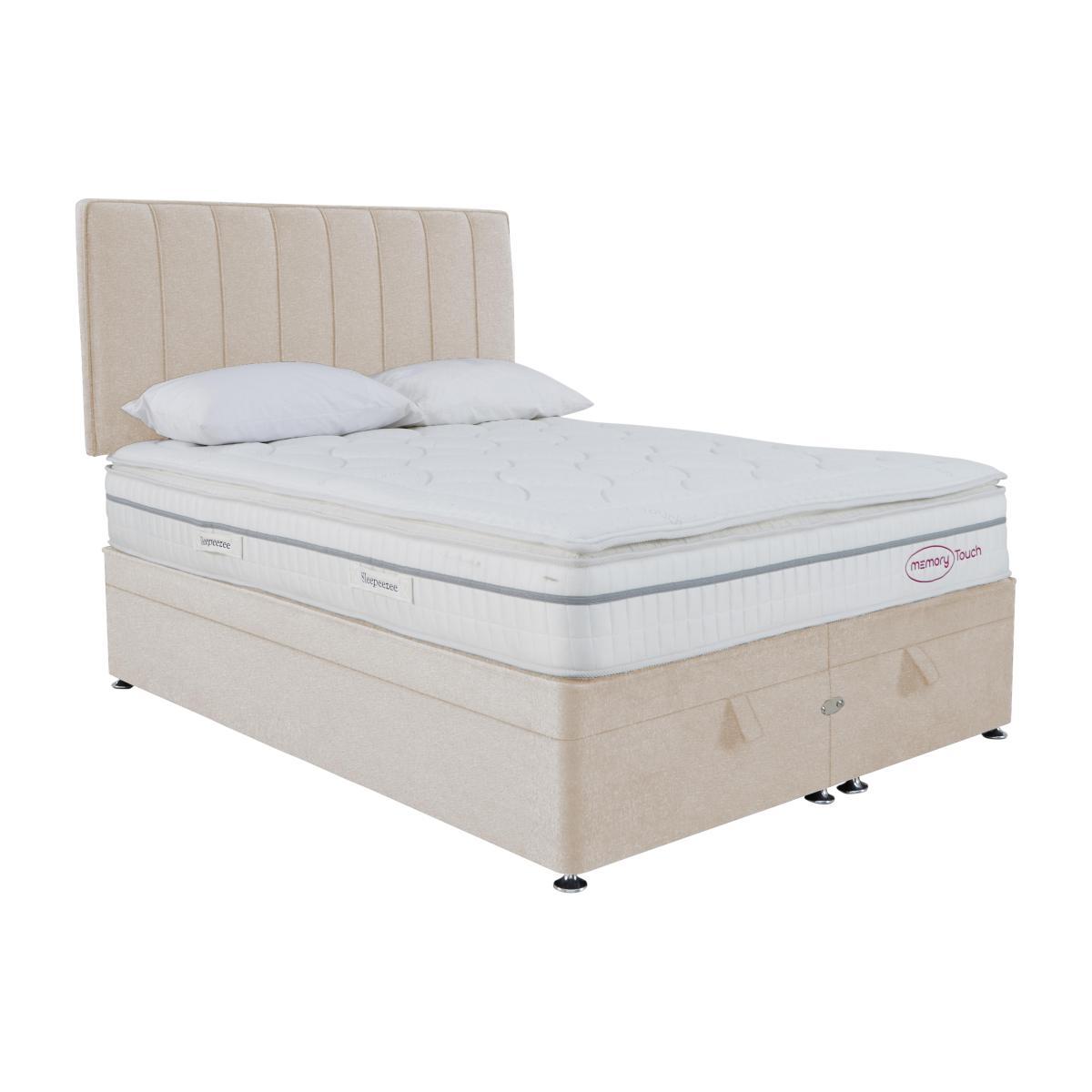 Style plus storage plus a fabulous night's sleep. It’s all yours with this beautifully tailored and wonderfully comfortable ottoman divan set with pillow top mattress. Only at Furniture Village. Why you’ll love it. Lovely divan set with sumptuous pillow top mattress and ottoman storage. Mattress has 2200 individually-pocketed springs in king size for superior support. Body-cushioning memory foam layers offer extra comfort. Hypoallergenic fillings make it a good choice for allergy sufferers. Large under bed storage space for duvets, pillows and clothing. Huge choice of fabrics and colours for the divan base. Range also includes divan sets with optional storage drawers and side-lift ottoman. Sleepeezee holds a Royal Warrant of Appointment granted by HRH The Prince of Wales. Handcrafted in Britain and exclusive to Furniture Village. What you need to know. Headboard shown is available seperately. Mattress type: Pocket spring. Depth: 30 cm. Firmness: Medium. Springs: 2200 in king size. Pillow top: Yes. Fillings: Memory foam and soft white fibre. Cover: Soft knit quilted fabric. Requires turning: No. Base type: Platform top. Sizes: Single, double, king, super king. Mattress care: Air for 4 hours before using to remove any odour. Allow at least 4 hours for springs to settle and for mattress to attain its full size. Indentations caused by settlement of fillings or body weight are normal and are not considered defects. If used on a slatted bed frame, slats must be no more than 7 cm apart. Rotate regularly.