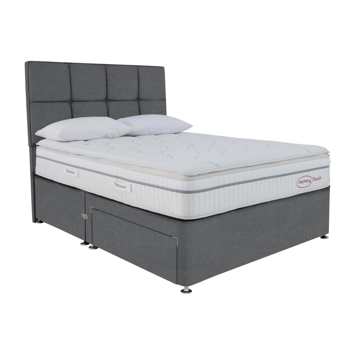 Offering more than a touch of handcrafted comfort, this Sleepeezee divan set delivers memory foam cushioning, pocket spring support and pillow top softness, all atop a divan base with optional storage. Why you’ll love it. Fabulous divan set with sumptuous pillow top mattress. Mattress has 2800 individually-pocketed springs in king size for exceptional support. Memory foam layers offer extra comfort. Hypoallergenic fillings make it a good choice for allergy sufferers. Huge choice of fabrics and colours for the divan base. Offered with 2, 2 + 2 or 4 optional storage drawers. Range also includes standalone mattress, storage divans and end-lift and side-lift ottoman divan sets. Sleepeezee holds a Royal Warrant of Appointment granted by HRH The Prince of Wales. Handcrafted in Britain and exclusive to Furniture Village. What you need to know. Headboard shown is available seperately. Mattress type: Pocket spring. Depth: 33 cm. Firmness: Medium. Springs: 2800 in king size. Pillow top: Yes. Fillings: Memory foam and soft white fibre. Cover: Soft knit quilted fabric. Requires turning: No. Base type: Platform top. Sizes: Single, double, king, super king. Mattress care: Air for 4 hours before using to remove any odour. Allow at least 4 hours for springs to settle and for mattress to attain its full size. Indentations caused by settlement of fillings or body weight are normal and are not considered defects. If used on a slatted bed frame, slats must be no more than 7 cm apart. Rotate regularly.