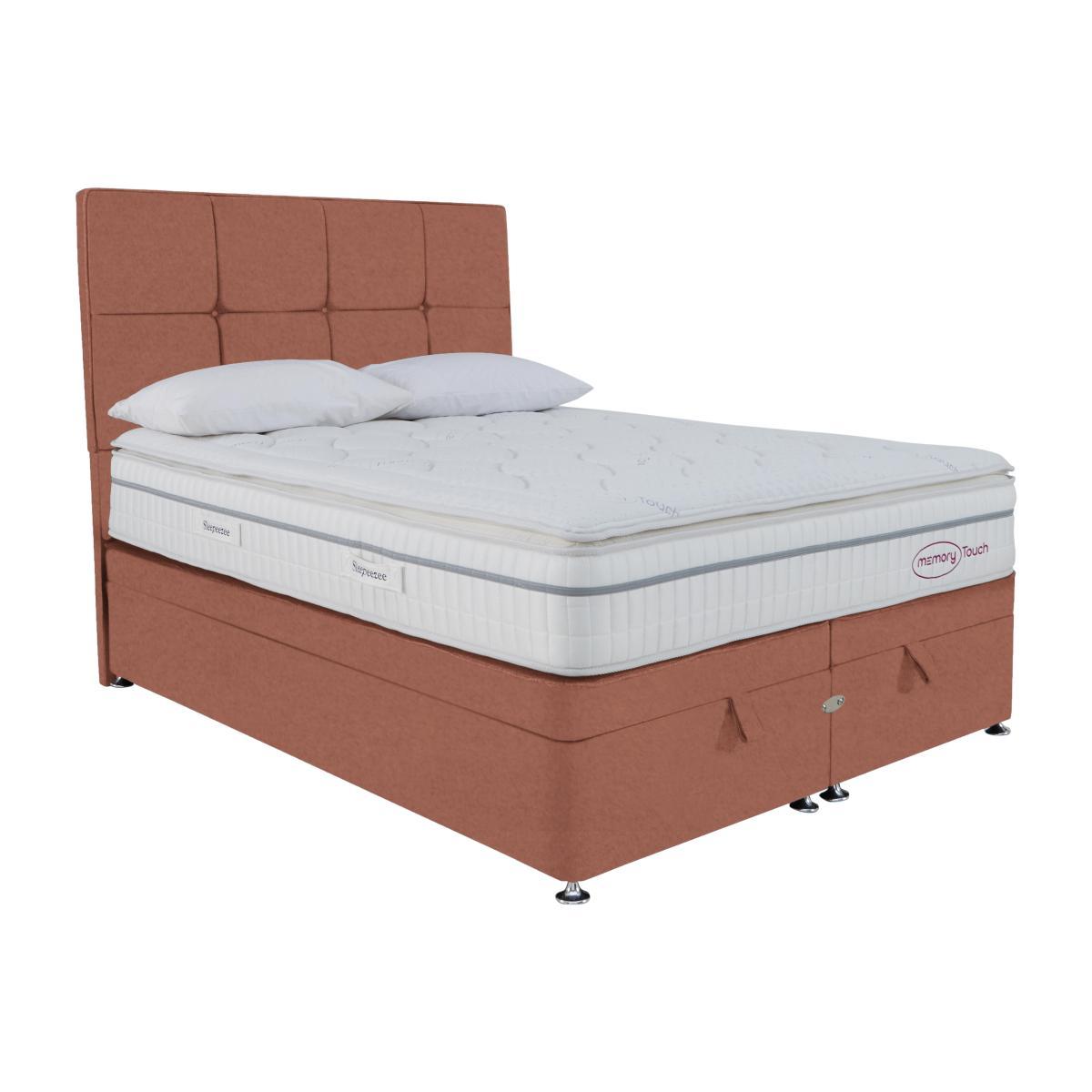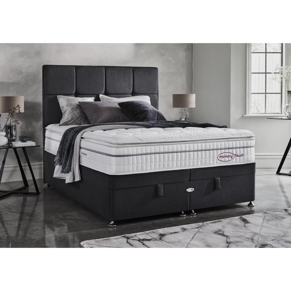 Looking for a new level of comfort plus functional bedroom storage? Meet your new favourite divan set. It comes complete with a handcrafted pillow top mattress and divan base with roomy ottoman storage. Why you’ll love it. Fabulous divan set with sumptuous pillow top mattress. Mattress has 2800 individually-pocketed springs in king size for exceptional support. Memory foam layers offer extra comfort. Hypoallergenic fillings make it a good choice for allergy sufferers. Large under bed storage space for duvets, pillows and clothing. Huge choice of fabrics and colours for the divan base. Range also includes divan sets with optional storage drawers and side-lift ottoman. Sleepeezee holds a Royal Warrant of Appointment granted by HRH The Prince of Wales. Handcrafted in Britain and exclusive to Furniture Village. What you need to know. Headboard shown is available seperately. Mattress type: Pocket spring. Depth: 33 cm. Firmness: Medium. Springs: 2800 in king size. Pillow top: Yes. Fillings: Memory foam and soft white fibre. Cover: Soft knit quilted fabric. Requires turning: No. Base type: Platform top. Sizes: Single, double, king, super king. Mattress care: Air for 4 hours before using to remove any odour. Allow at least 4 hours for springs to settle and for mattress to attain its full size. Indentations caused by settlement of fillings or body weight are normal and are not considered defects. If used on a slatted bed frame, slats must be no more than 7 cm apart. Rotate regularly.