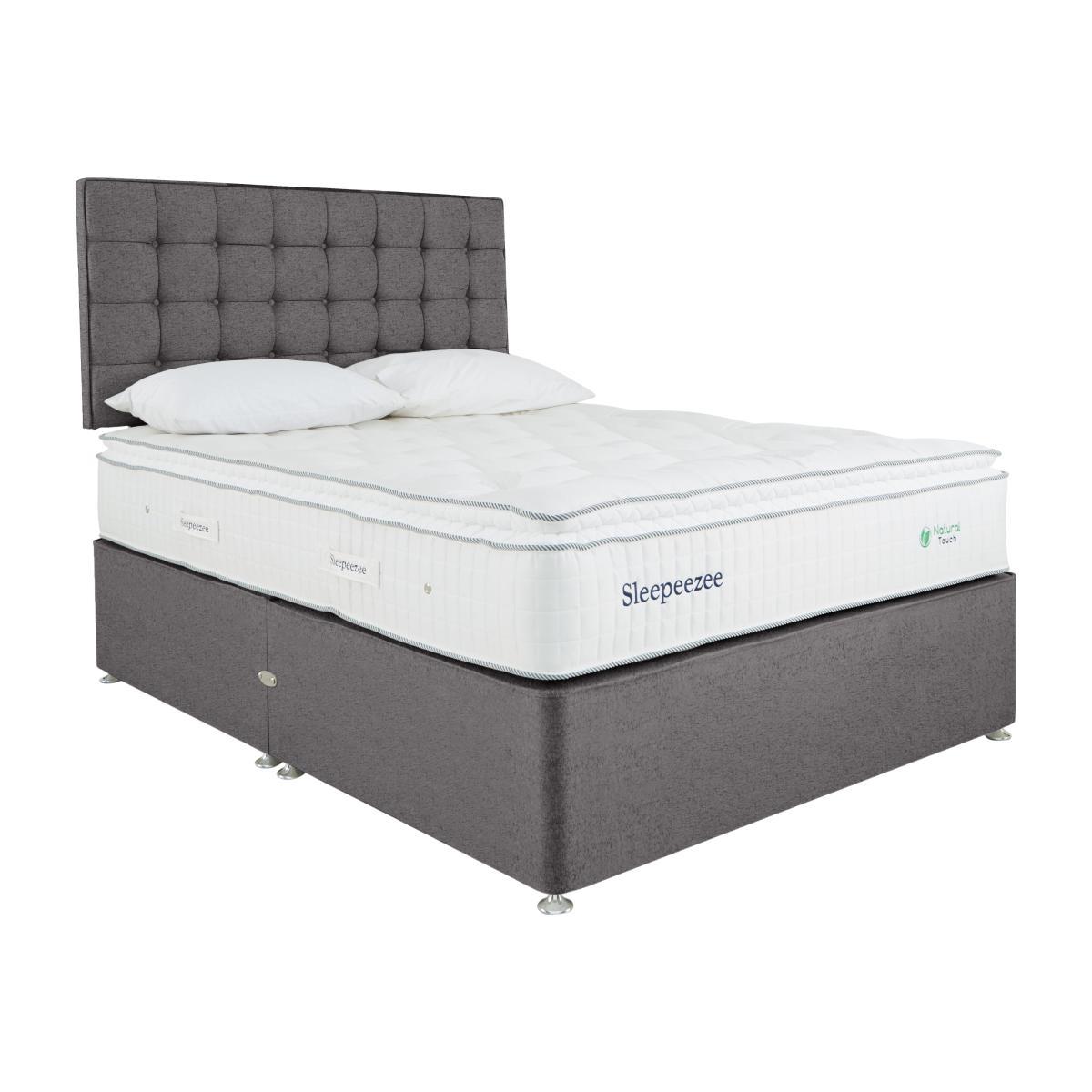Sometimes, nature knows best. That’s why Sleepeezee has harnessed the power of nature’s finest materials in its new Natural Touch 2000 Pillowtop range. Two generous layers of British wool keep you cool in summer and warm in winter, while a natural damask cover offers impressive breathability. But it’s the way its 2000 pocket springs respond to your body’s every movement, that makes this range so comfortable. You always feel supported, and the result is a deeply restful night’s sleep every day of the week. It comes in a stylish traditional divan that’s compatible with all of Sleepeezee’s headboards, so you can really make it your own. It’s also available in a zip and link design which can be joined and separated, so it’s easy to rotate and fit through the narrowest of staircases. Handmade in the UK exclusively for Furniture Village, this is long-lasting natural comfort at its best. Get too hot or cold at night? Try this Sleepeezee pillowtop divan set. Made with British wool to regulate your temperature, whatever the season. Plus, its divan is very stylish to look at. Why you'll love it. A natural pocket sprung divan set by Sleepeezee. Luxurious pillowtop for a deeper night’s sleep. 2000 pocket springs offer superior total-body support. Stay warm in winter and cool in summer with two layers of British wool. Breathable chemical-free damask cover. Traditional divan base in a wide choice of colours. Also available with ottoman storage. Create your perfect look. Compatible with all Sleepeezee headboards. Handmade in the UK exclusively for Furniture Village. What you need to know. Headboard shown is available separately. Mattress type: Pocket spring. Depth: 34cm. Firmness: Medium feel. Springs: 2000 pocket springs in king size. Pillowtop: Yes. Fillings: British wool, pocket springs, Superbond foam. Borders: Standard tape edge with carry handles. Edge support: Yes. Cover: 100% natural viscose. Requires turning: Rotating only due to pillowtop. Base type: Platform top. Sizes: Single, double, king, super king. Mattress care: Air for 4 hours before using to remove any odour. Indentations caused by settlement of fillings or body weight are normal and are not considered defects. If used on a slatted bed frame, slats must be no more than 7 cm apart. Rotate regularly. We recommend the use of a mattress protector. Double, king and super king divan bases are delivered in two pieces for ease of delivery.