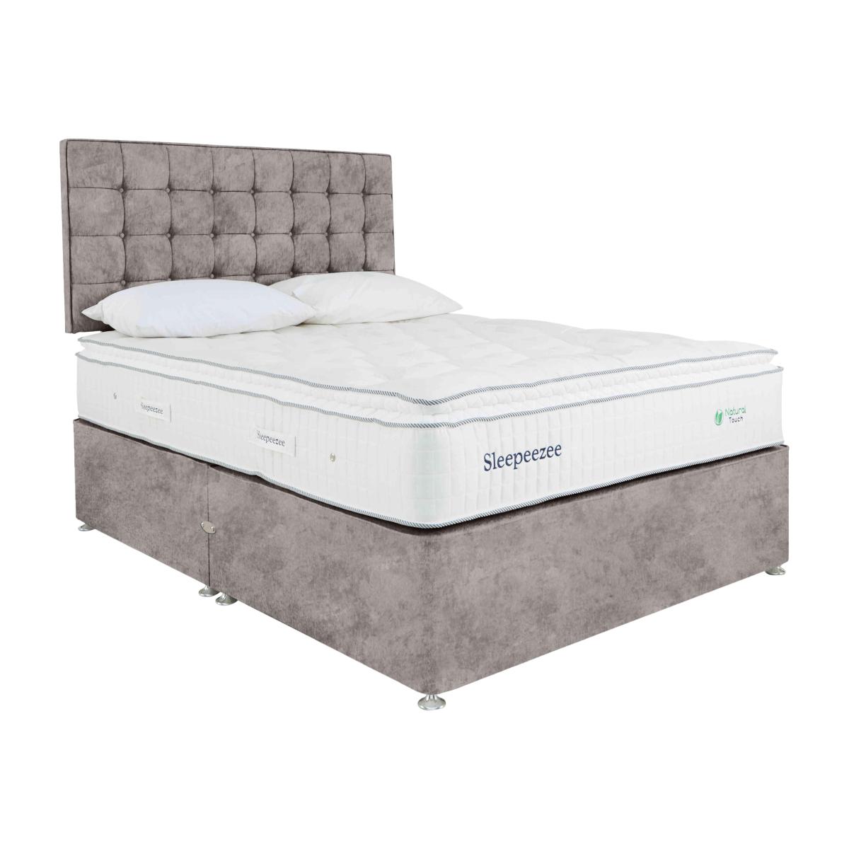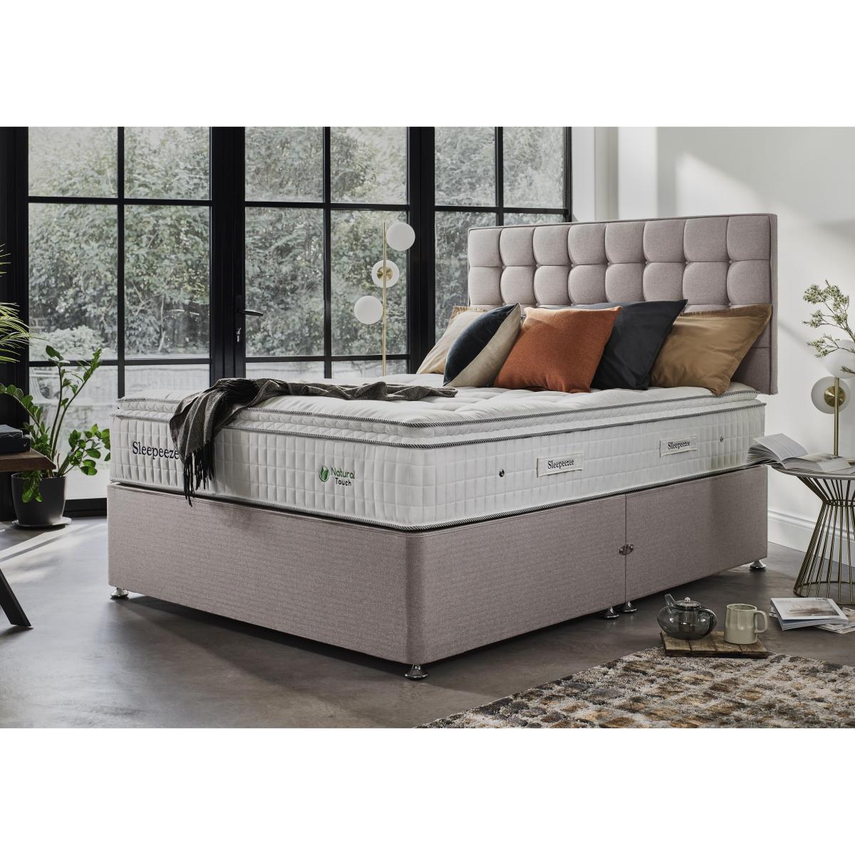 Sometimes, nature knows best. That’s why Sleepeezee has harnessed the power of nature’s finest materials in its new Natural Touch 2000 Pillowtop range. Two generous layers of British wool keep you cool in summer and warm in winter, while a natural damask cover offers impressive breathability. But it’s the way its 2000 pocket springs respond to your body’s every movement, that makes this range so comfortable. You always feel supported, and the result is a deeply restful night’s sleep every day of the week. It comes in a stylish traditional divan that’s compatible with all of Sleepeezee’s headboards, so you can really make it your own. It’s also available in a zip and link design which can be joined and separated, so it’s easy to rotate and fit through the narrowest of staircases. Handmade in the UK exclusively for Furniture Village, this is long-lasting natural comfort at its best. Get too hot or cold at night? Try this Sleepeezee pillowtop divan set. Made with British wool to regulate your temperature, whatever the season. Plus, its divan is very stylish to look at. Why you'll love it A natural pocket sprung divan set by Sleepeezee. Luxurious pillowtop for a deeper night’s sleep. 2000 pocket springs offer superior total-body support. Stay warm in winter and cool in summer with two layers of British wool. Breathable chemical-free damask cover. Traditional divan base in a wide choice of colours. Also available with ottoman storage. Create your perfect look. Compatible with all Sleepeezee headboards. Handmade in the UK exclusively for Furniture Village. What you need to know Headboard shown is available separately. Mattress type: Pocket spring. Depth: 34cm. Firmness: Medium feel. Springs: 2000 pocket springs in king size. Pillowtop:Yes. Fillings: British wool, pocket springs, Superbond foam. Borders: Standard tape edge with carry handles. Edge support: Yes Cover: 100% natural viscose. Requires turning: Rotating only due to pillowtop. Base type: Platform top. Sizes: Single, double, king, super king. Mattress care:Air for 4 hours before using to remove any odour. Indentations caused by settlement of fillings or body weight are normal and are not considered defects. If used on a slatted bed frame, slats must be no more than 7 cm apart. Rotate regularly. We recommend the use of a mattress protector. Double, king and super king divan bases are delivered in two pieces for ease of delivery.