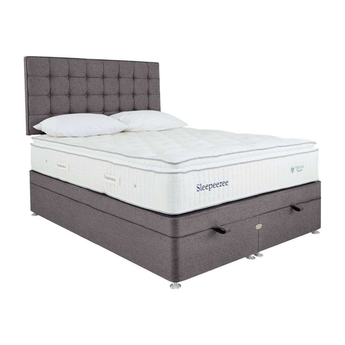 Sometimes, nature knows best. That’s why Sleepeezee has harnessed the power of nature’s finest materials in its new Natural Touch 2000 Pillowtop range. Two generous layers of British wool keep you cool in summer and warm in winter, while a natural damask cover offers impressive breathability. But it’s the way its 2000 pocket springs respond to your body’s every movement, that makes this range so comfortable. You always feel supported, and the result is a deeply restful night’s sleep every day of the week. It comes in a stylish traditional divan that’s compatible with all of Sleepeezee’s headboards, so you can really make it your own. It’s also available in a zip and link design which can be joined and separated, so it’s easy to rotate and fit through the narrowest of staircases. Handmade in the UK exclusively for Furniture Village, this is long-lasting natural comfort at its best. Sometimes, nature really does know best. This Sleepeezee pillowtop ottoman divan set brings together the best natural materials like British wool and 2000 steel pocket springs to deliver deep comfort. And it comes with storage too. Why you'll love it. A natural pocket sprung mattress by Sleepeezee. Luxurious pillowtop for a deeper night’s sleep. 2000 pocket springs offer superior total-body support. Stay warm in winter and cool in summer with two layers of British wool. Breathable chemical-free damask cover. Traditional divan base in a wide choice of colours. Easy to access, end-lift ottoman storage. Create your perfect look. Compatible with all Sleepeezee headboards. Handmade in the UK exclusively for Furniture Village. What you need to know. Headboard shown is available separately. Mattress type: Pocket spring. Depth: 34cm. Firmness: Medium feel. Springs: 2000 pocket springs in king size. Pillowtop: Yes. Fillings: British wool, pocket springs, Superbond foam. Borders: Standard tape edge with carry handles. Edge support: Yes. Cover: 100% natural viscose. Requires turning: Rotating only due to pillowtop. Base type: Platform top. Sizes: Single, double, king, super king. Mattress care: Air for 4 hours before using to remove any odour. Indentations caused by settlement of fillings or body weight are normal and are not considered defects. If used on a slatted bed frame, slats must be no more than 7 cm apart. Rotate regularly. We recommend the use of a mattress protector. Please take care when opening and closing the ottoman. Double, king and super king divan bases are delivered in two pieces for ease of delivery.