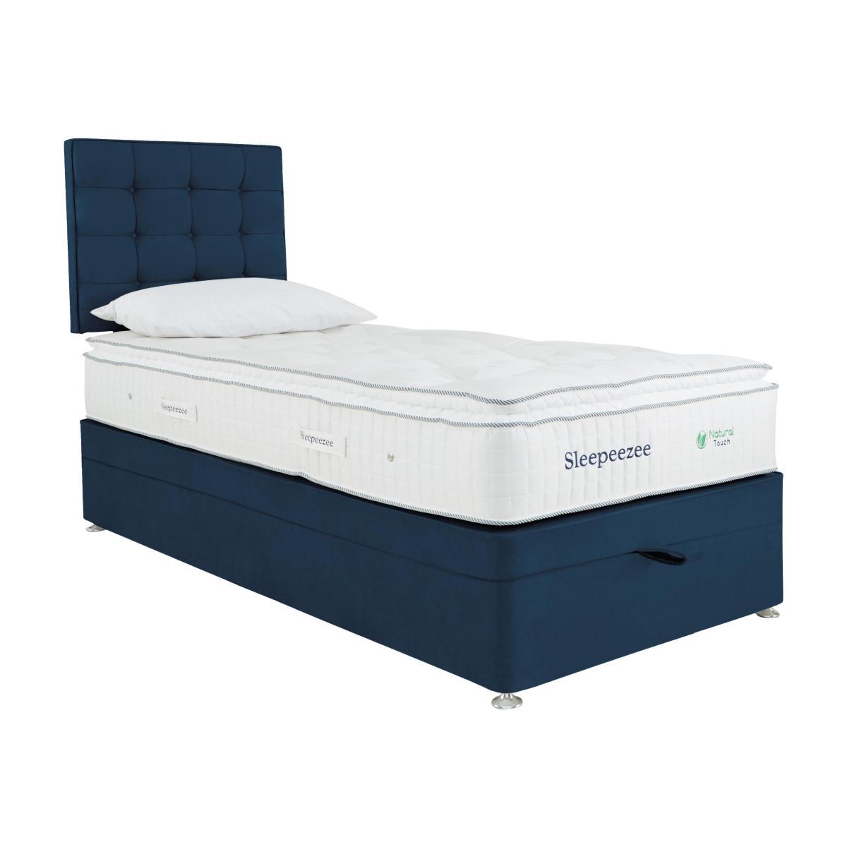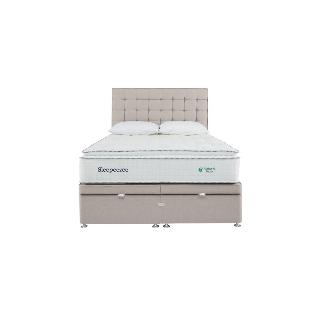 Sometimes, nature knows best. That’s why Sleepeezee has harnessed the power of nature’s finest materials in its new Natural Touch 2000 Pillowtop range. Two generous layers of British wool keep you cool in summer and warm in winter, while a natural damask cover offers impressive breathability. But it’s the way its 2000 pocket springs respond to your body’s every movement, that makes this range so comfortable. You always feel supported, and the result is a deeply restful night’s sleep every day of the week. It comes in a stylish traditional divan that’s compatible with all of Sleepeezee’s headboards, so you can really make it your own. It’s also available in a zip and link design which can be joined and separated, so it’s easy to rotate and fit through the narrowest of staircases. Handmade in the UK exclusively for Furniture Village, this is long-lasting natural comfort at its best. Sometimes, nature really does know best. This Sleepeezee pillowtop ottoman divan set brings together the best natural materials like British wool and 2000 steel pocket springs to deliver deep comfort. And it comes with storage too. Why you'll love it. A natural pocket sprung mattress by Sleepeezee. Luxurious pillowtop for a deeper night’s sleep. 2000 pocket springs offer superior total-body support. Stay warm in winter and cool in summer with two layers of British wool. Breathable chemical-free damask cover. Traditional divan base in a wide choice of colours. Easy to access, end-lift ottoman storage. Create your perfect look. Compatible with all Sleepeezee headboards. Handmade in the UK exclusively for Furniture Village. What you need to know. Headboard shown is available separately. Mattress type: Pocket spring. Depth: 34cm. Firmness: Medium feel. Springs: 2000 pocket springs in king size. Pillowtop: Yes. Fillings: British wool, pocket springs, Superbond foam. Borders: Standard tape edge with carry handles. Edge support: Yes. Cover: 100% natural viscose. Requires turning: Rotating only due to pillowtop. Base type: Platform top. Sizes: Single, double, king, super king. Mattress care: Air for 4 hours before using to remove any odour. Indentations caused by settlement of fillings or body weight are normal and are not considered defects. If used on a slatted bed frame, slats must be no more than 7 cm apart. Rotate regularly. We recommend the use of a mattress protector. Please take care when opening and closing the ottoman. Double, king and super king divan bases are delivered in two pieces for ease of delivery.