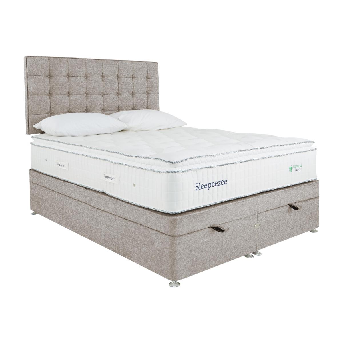 Sometimes, nature knows best. That’s why Sleepeezee has harnessed the power of nature’s finest materials in its new Natural Touch 2000 Pillowtop range. Two generous layers of British wool keep you cool in summer and warm in winter, while a natural damask cover offers impressive breathability. But it’s the way its 2000 pocket springs respond to your body’s every movement, that makes this range so comfortable. You always feel supported, and the result is a deeply restful night’s sleep every day of the week. It comes in a stylish traditional divan that’s compatible with all of Sleepeezee’s headboards, so you can really make it your own. It’s also available in a zip and link design which can be joined and separated, so it’s easy to rotate and fit through the narrowest of staircases. Handmade in the UK exclusively for Furniture Village, this is long-lasting natural comfort at its best. Sometimes, nature really does know best. This Sleepeezee pillowtop ottoman divan set brings together the best natural materials like British wool and 2000 steel pocket springs to deliver deep comfort. And it comes with storage too. Why you'll love it. A natural pocket sprung mattress by Sleepeezee. Luxurious pillowtop for a deeper night’s sleep. 2000 pocket springs offer superior total-body support. Stay warm in winter and cool in summer with two layers of British wool. Breathable chemical-free damask cover. Traditional divan base in a wide choice of colours. Easy to access, end-lift ottoman storage. Create your perfect look. Compatible with all Sleepeezee headboards. Handmade in the UK exclusively for Furniture Village. What you need to know. Headboard shown is available separately. Mattress type: Pocket spring. Depth: 34cm. Firmness: Medium feel. Springs: 2000 pocket springs in king size. Pillowtop: Yes. Fillings: British wool, pocket springs, Superbond foam. Borders: Standard tape edge with carry handles. Edge support: Yes. Cover: 100% natural viscose. Requires turning: Rotating only due to pillowtop. Base type: Platform top. Sizes: Single, double, king, super king. Mattress care: Air for 4 hours before using to remove any odour. Indentations caused by settlement of fillings or body weight are normal and are not considered defects. If used on a slatted bed frame, slats must be no more than 7 cm apart. Rotate regularly. We recommend the use of a mattress protector. Please take care when opening and closing the ottoman. Double, king and super king divan bases are delivered in two pieces for ease of delivery.