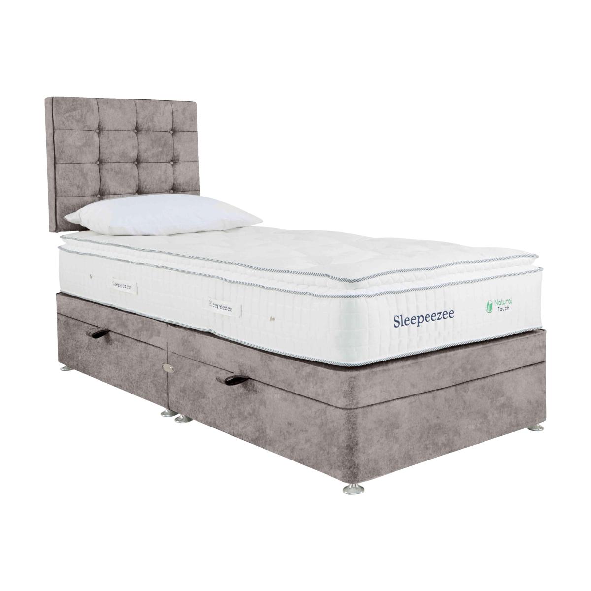 Sometimes, nature knows best. That’s why Sleepeezee has harnessed the power of nature’s finest materials in its new Natural Touch 2000 Pillowtop range. Two generous layers of British wool keep you cool in summer and warm in winter, while a natural damask cover offers impressive breathability. But it’s the way its 2000 pocket springs respond to your body’s every movement, that makes this range so comfortable. You always feel supported, and the result is a deeply restful night’s sleep every day of the week. It comes in a stylish traditional divan that’s compatible with all of Sleepeezee’s headboards, so you can really make it your own. It’s also available in a zip and link design which can be joined and separated, so it’s easy to rotate and fit through the narrowest of staircases. Handmade in the UK exclusively for Furniture Village, this is long-lasting natural comfort at its best. Bring a natural feel to your sleep with this Sleepeezee pillowtop ottoman divan set. Handmade in the UK for deeply restful sleep with 2000 pocket springs, British wool layers and spacious underbed storage all in one. Why you'll love it Headboard shown is available separately. A natural pocket sprung mattress by Sleepeezee. Luxurious pillowtop for a deeper night’s sleep. 2000 pocket springs offer superior total-body support. Stay warm in winter and cool in summer with two layers of British wool. Breathable chemical-free damask cover. Traditional divan base in a wide choice of colours. Easy to access, side-lift ottoman storage. Create your perfect look. Compatible with all Sleepeezee headboards. Handmade in the UK exclusively for Furniture Village. What you need to know Mattress type: Pocket spring. Depth: 34cm. Firmness: Medium feel. Springs: 2000 pocket springs in king size. Pillowtop:Yes. Fillings: British wool, pocket springs, Superbond foam. Borders: Standard tape edge with carry handles. Edge support: Yes Cover: 100% natural viscose. Requires turning: Rotating only due to pillowtop. Base type: Platform top. Sizes: Single, double, king, super king. Mattress care:Air for 4 hours before using to remove any odour. Indentations caused by settlement of fillings or body weight are normal and are not considered defects. If used on a slatted bed frame, slats must be no more than 7 cm apart. Rotate regularly. We recommend the use of a mattress protector. Please take care when opening and closing the ottoman. Double, king and super king divan bases are delivered in two pieces for ease of delivery.