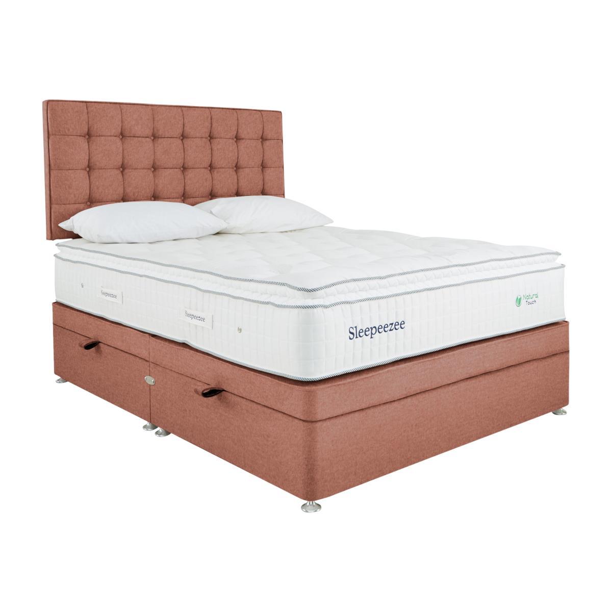 Sometimes, nature knows best. That’s why Sleepeezee has harnessed the power of nature’s finest materials in its new Natural Touch 2000 Pillowtop range. Two generous layers of British wool keep you cool in summer and warm in winter, while a natural damask cover offers impressive breathability. But it’s the way its 2000 pocket springs respond to your body’s every movement, that makes this range so comfortable. You always feel supported, and the result is a deeply restful night’s sleep every day of the week. It comes in a stylish traditional divan that’s compatible with all of Sleepeezee’s headboards, so you can really make it your own. It’s also available in a zip and link design which can be joined and separated, so it’s easy to rotate and fit through the narrowest of staircases. Handmade in the UK exclusively for Furniture Village, this is long-lasting natural comfort at its best. Bring a natural feel to your sleep with this Sleepeezee pillowtop ottoman divan set. Handmade in the UK for deeply restful sleep with 2000 pocket springs, British wool layers and spacious underbed storage all in one. Why you'll love it. Headboard shown is available separately. A natural pocket sprung mattress by Sleepeezee. Luxurious pillowtop for a deeper night’s sleep. 2000 pocket springs offer superior total-body support. Stay warm in winter and cool in summer with two layers of British wool. Breathable chemical-free damask cover. Traditional divan base in a wide choice of colours. Easy to access, side-lift ottoman storage. Create your perfect look. Compatible with all Sleepeezee headboards. Handmade in the UK exclusively for Furniture Village. What you need to know. Mattress type: Pocket spring. Depth: 34cm. Firmness: Medium feel. Springs: 2000 pocket springs in king size. Pillowtop: Yes. Fillings: British wool, pocket springs, Superbond foam. Borders: Standard tape edge with carry handles. Edge support: Yes. Cover: 100% natural viscose. Requires turning: Rotating only due to pillowtop. Base type: Platform top. Sizes: Single, double, king, super king. Mattress care: Air for 4 hours before using to remove any odour. Indentations caused by settlement of fillings or body weight are normal and are not considered defects. If used on a slatted bed frame, slats must be no more than 7 cm apart. Rotate regularly. We recommend the use of a mattress protector. Please take care when opening and closing the ottoman. Double, king and super king divan bases are delivered in two pieces for ease of delivery.